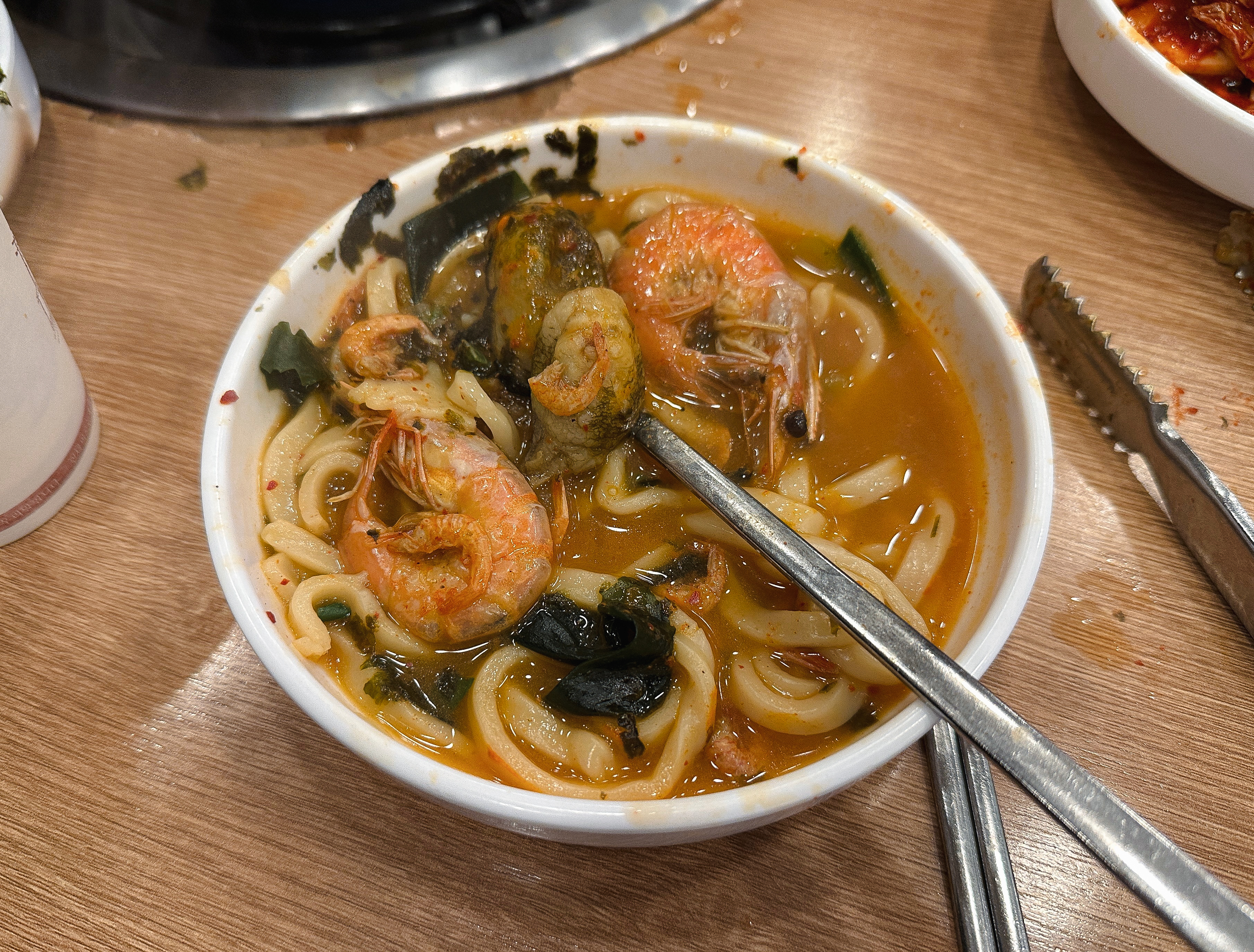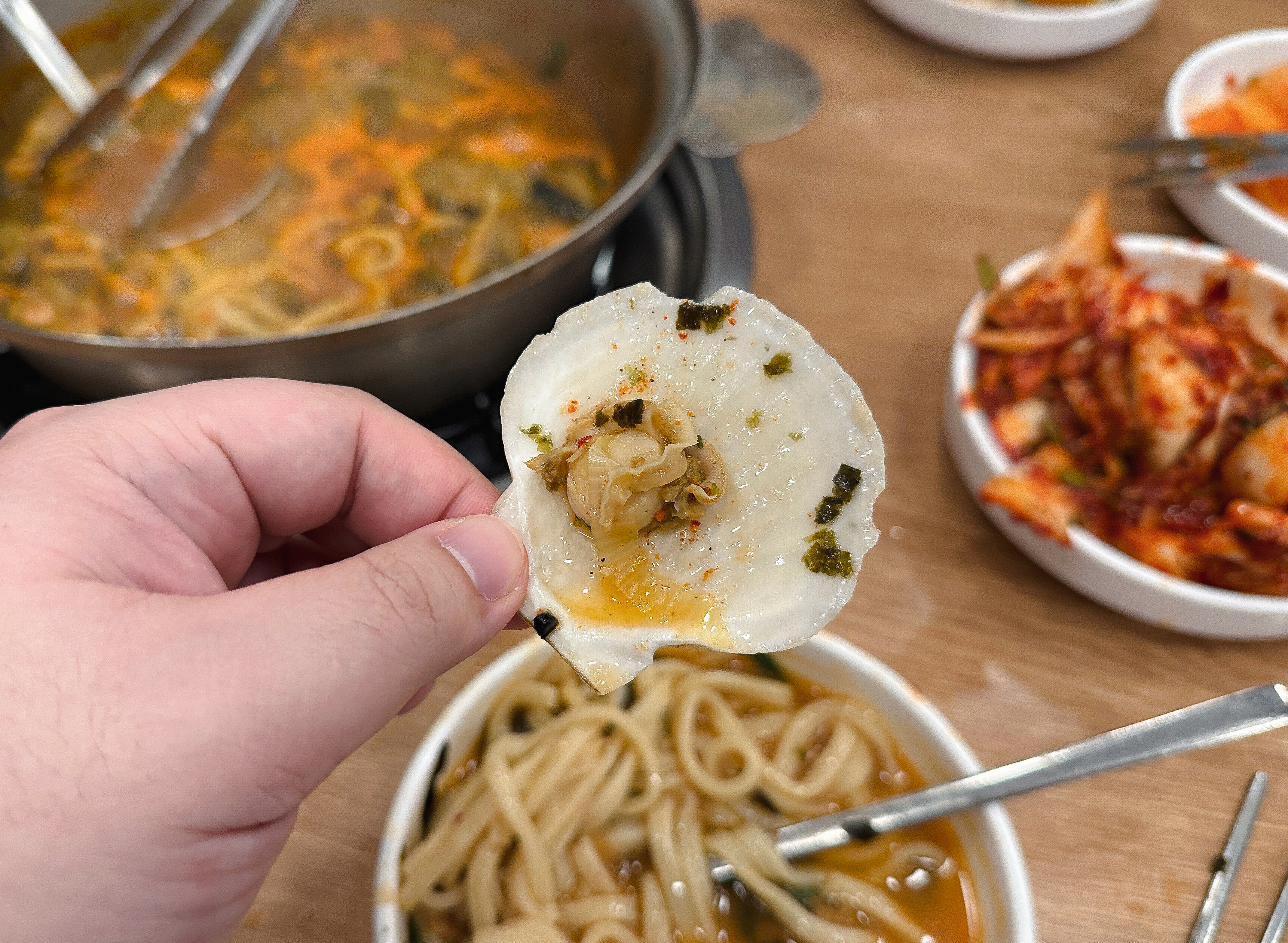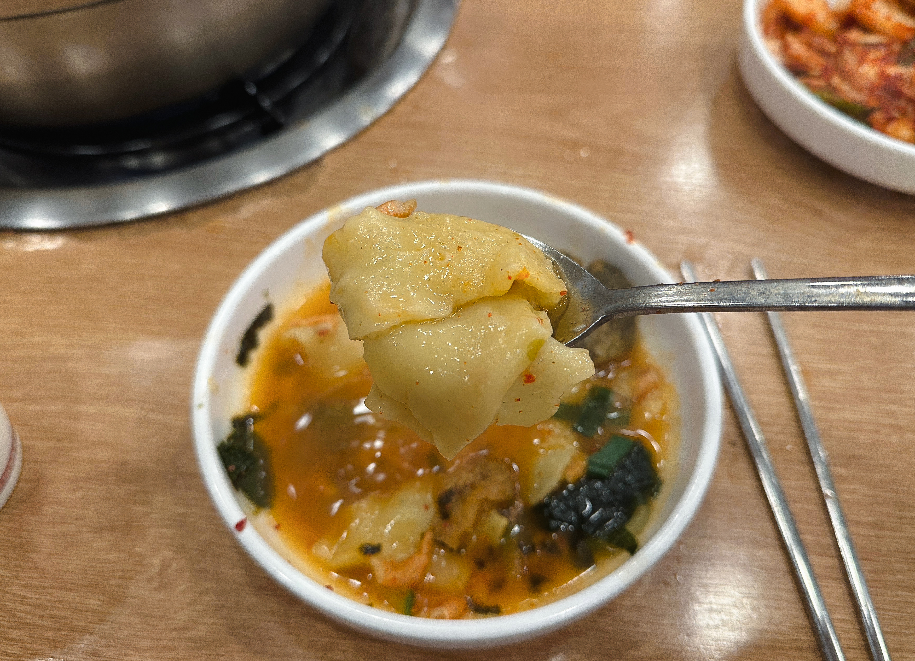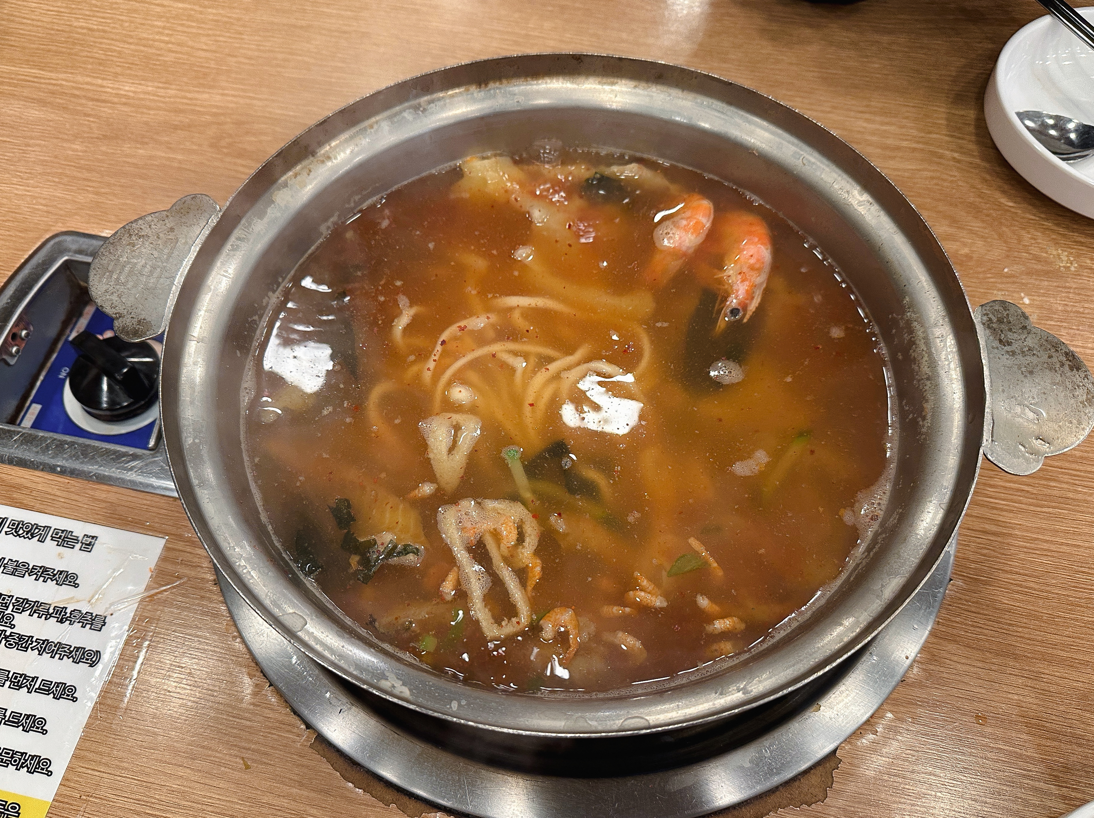 다시 칼제비로 돌아와서 4분여 시간이 지나고 칼국수까지 같이 건져서 먹었습니다. 특히 이 칼국수에는 국물에 건새우가 많이 들어가 있어서 그런지 맛도 좋았지만, 씹히는 게 있어서 국물이 먹기 좋았습니다.