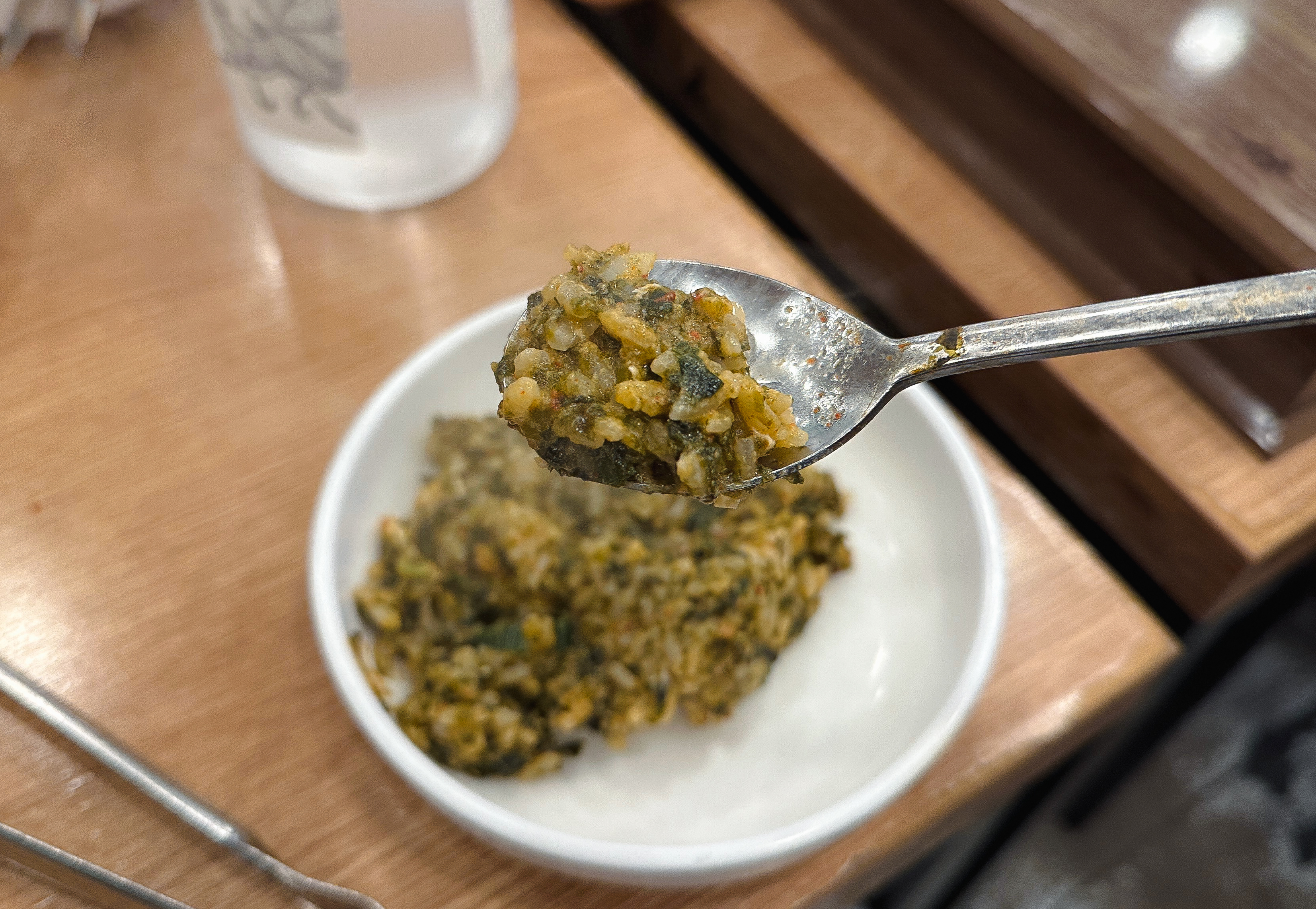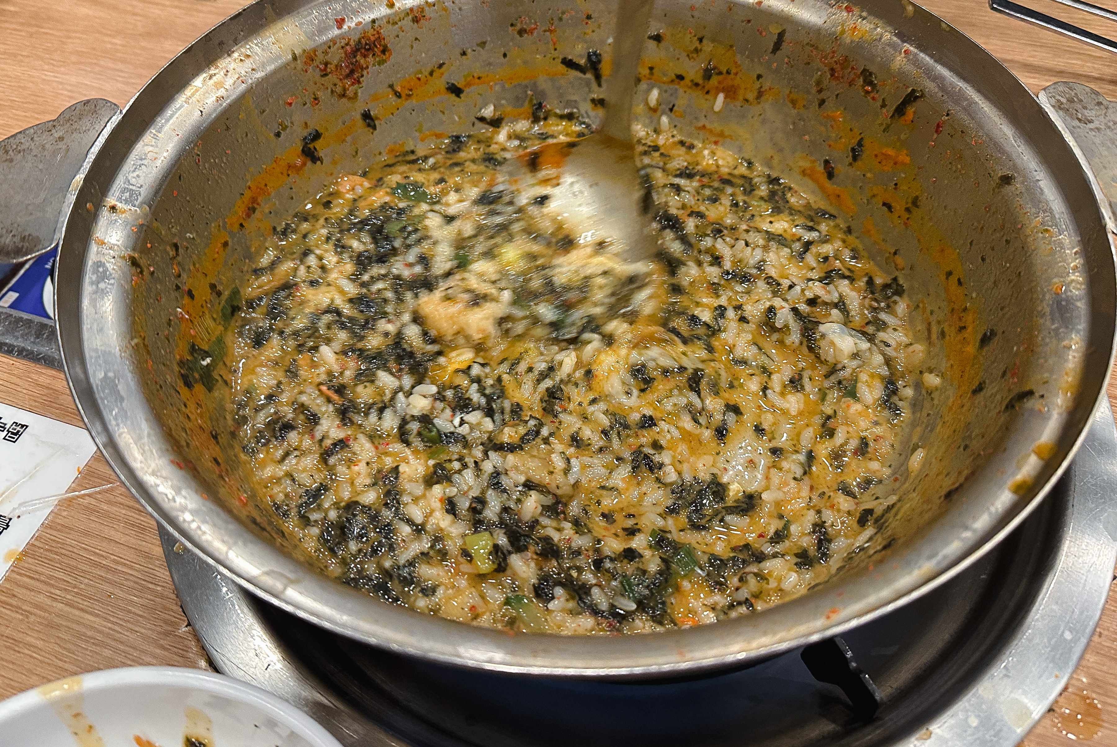 마무리로 죽을 곁들여주었습니다. 칼국수 다 먹고 남은 국물에 하는 죽은 대부분 다 만족하며 먹게 되는 것 같습니다. 국물이 졸아들며 맛이 깊고 진해져서 그런지 밥에 잘 배어들어 더 진하고 고소한 맛이 있었습니다.