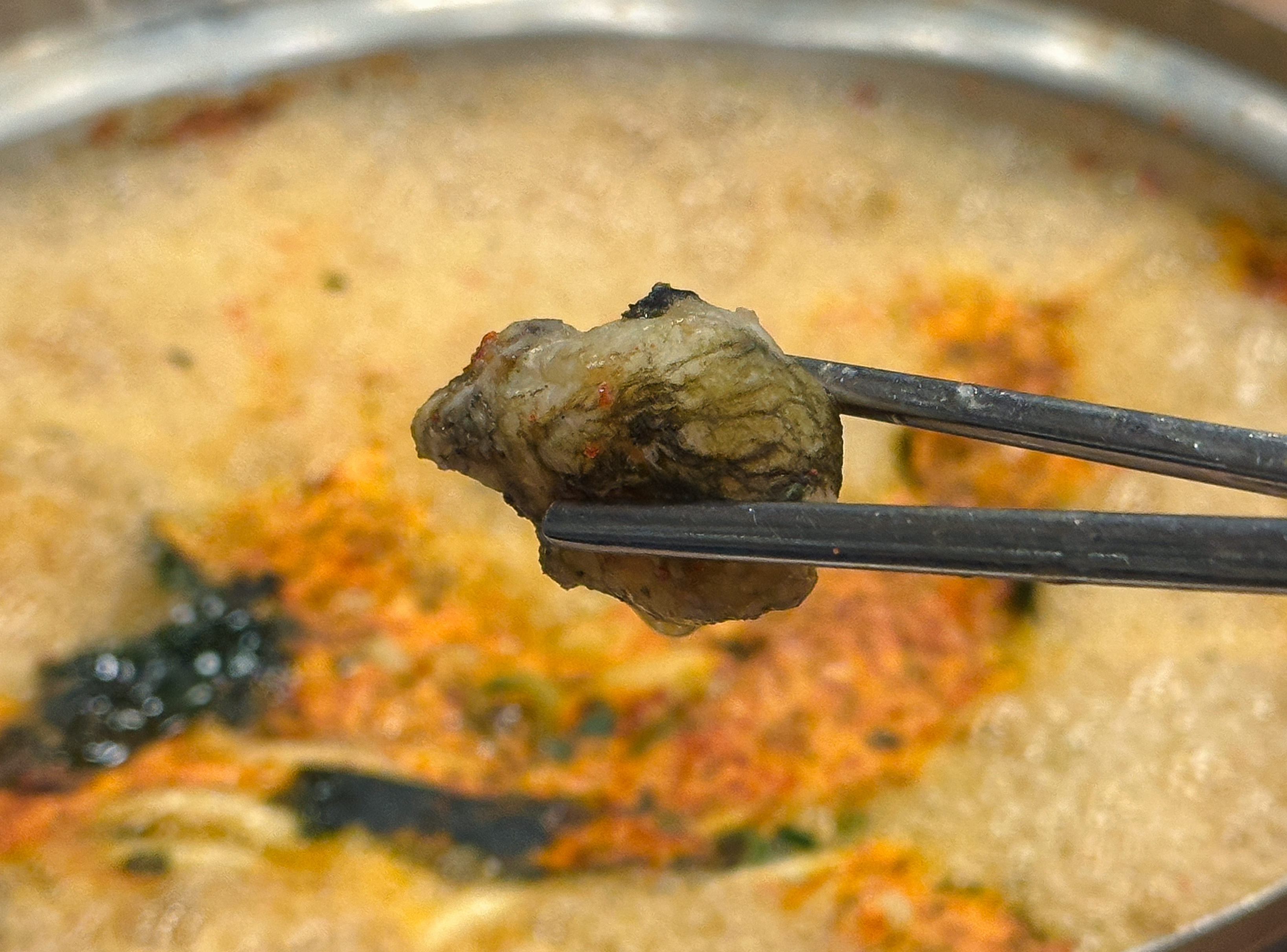 곧이어 주문한 얼큰오만둥이칼제비가 나왔습니다. 얼큰오만둥이칼제비에는 굴, 오만둥이, 건새우, 미역, 가리비 등이 들어가 시원하면서도, 감칠맛이 좋았습니다. 그리고 테이블에 ⎡칼제비 맛있게 먹는 법⎦이라는 안내문이 적혀있었는데, 가게에서 "이런 게 적혀있으니 따라서 만들면 맛있게 드실 수 있습니다." 라고만 안내해 주셔도 좋을법한데, 안내문을 보지 못한 대부분 손님들이 "어떻게 하면 돼요?" 라고 물어보면, 대꾸도 않고 그냥 가시더라고요.