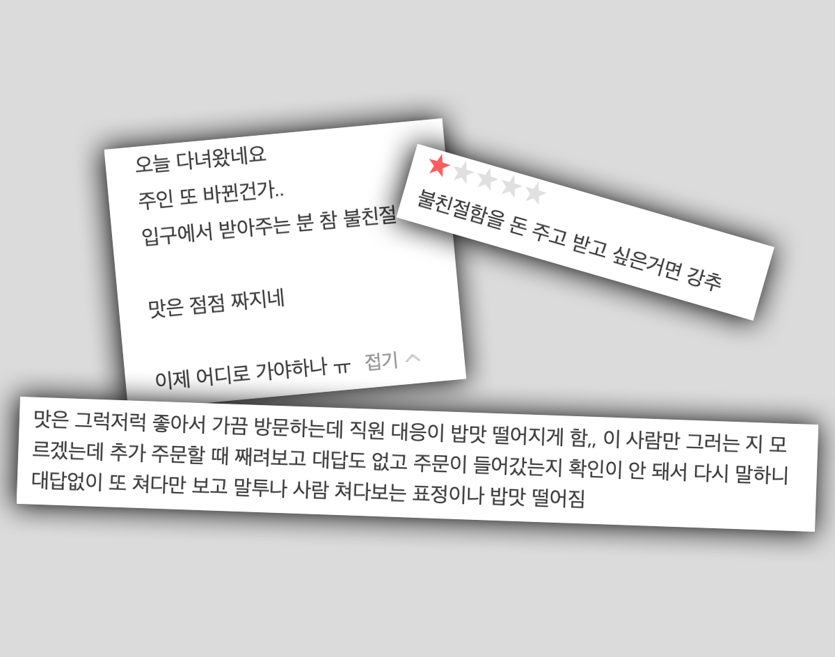 참고로, 하남 팔당원조칼제비칼국수의 리뷰를 보면 대부분 불친절하다는 의견이 많은 것을 확인할 수 있습니다. 저희도 식사를 위해 가게에 방문했는데, 자리를 안내해 주는 사람이 아무도 없길래 빈자리에 앉으려고 하는데, 사장님으로 보이는 분이 "왜 거기에 있냐고" 따져묻더라고요. 제가 손님으로 갑질하려 방문한 것은 아니지만, 대부분 식당이나 카페에 가면 사람들 없는 빈자리에 앉으려고 하지 않나요? 아무튼 사장님의 말투에서 왜 사람들이 이런 댓글을 다는지 대략 짐작할 수 있겠더라고요.
