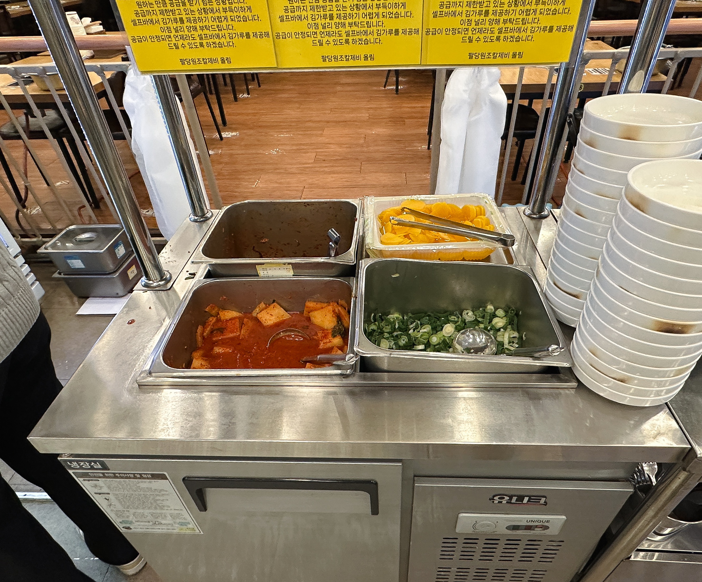 팔당원조칼제비칼국수의 셀프바부터 소개해드리겠습니다. 이곳은 앞치마, 가위, 식기류, 김치, 반찬, 물티슈, 물까지 대부분을 셀프로 가져다 먹게 하고 있었습니다.