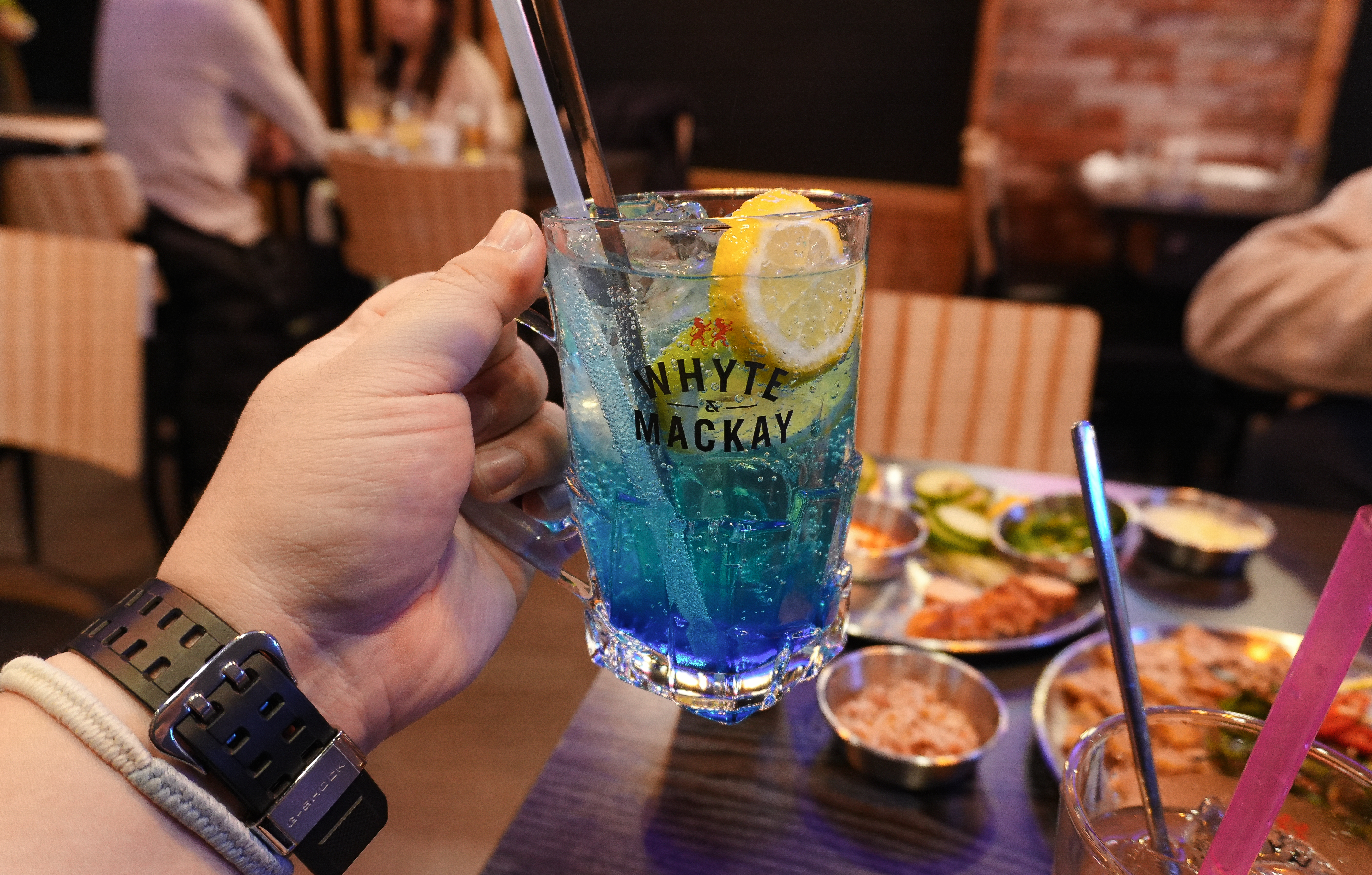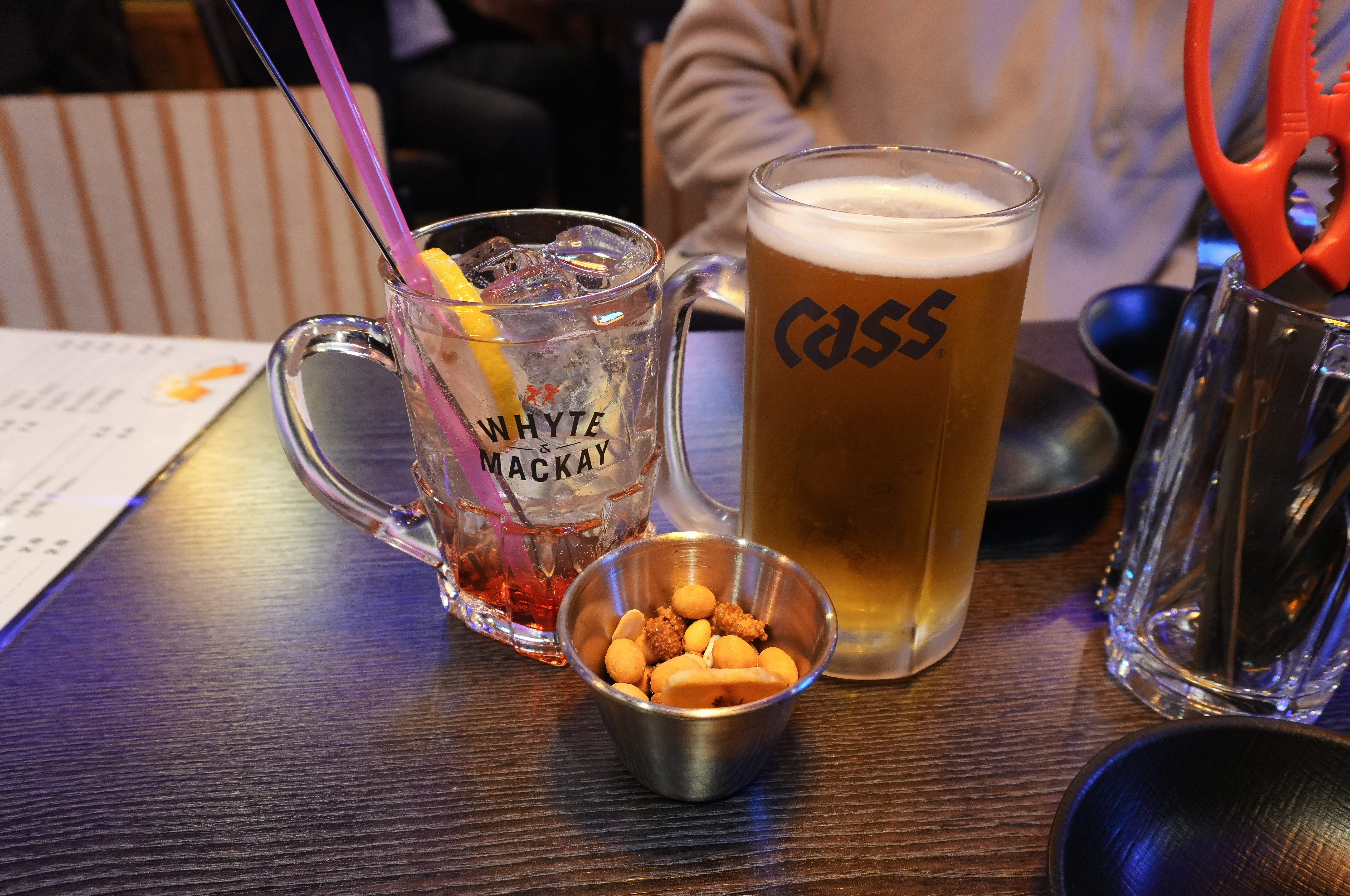 화정맥주의 맥주와 피치트리하이볼이 먼저 나왔습니다. 이후에 블루레몬 하이볼도 마셔보았습니다. 저는 차량을 운전해야 해서 논알코올 하이볼로 마셨습니다. 두 하이볼 모두 마셔보았는데, 맛이 둘 다 상큼하고 시원해서 기름진(?) 안주랑도 잘 어울렸습니다.