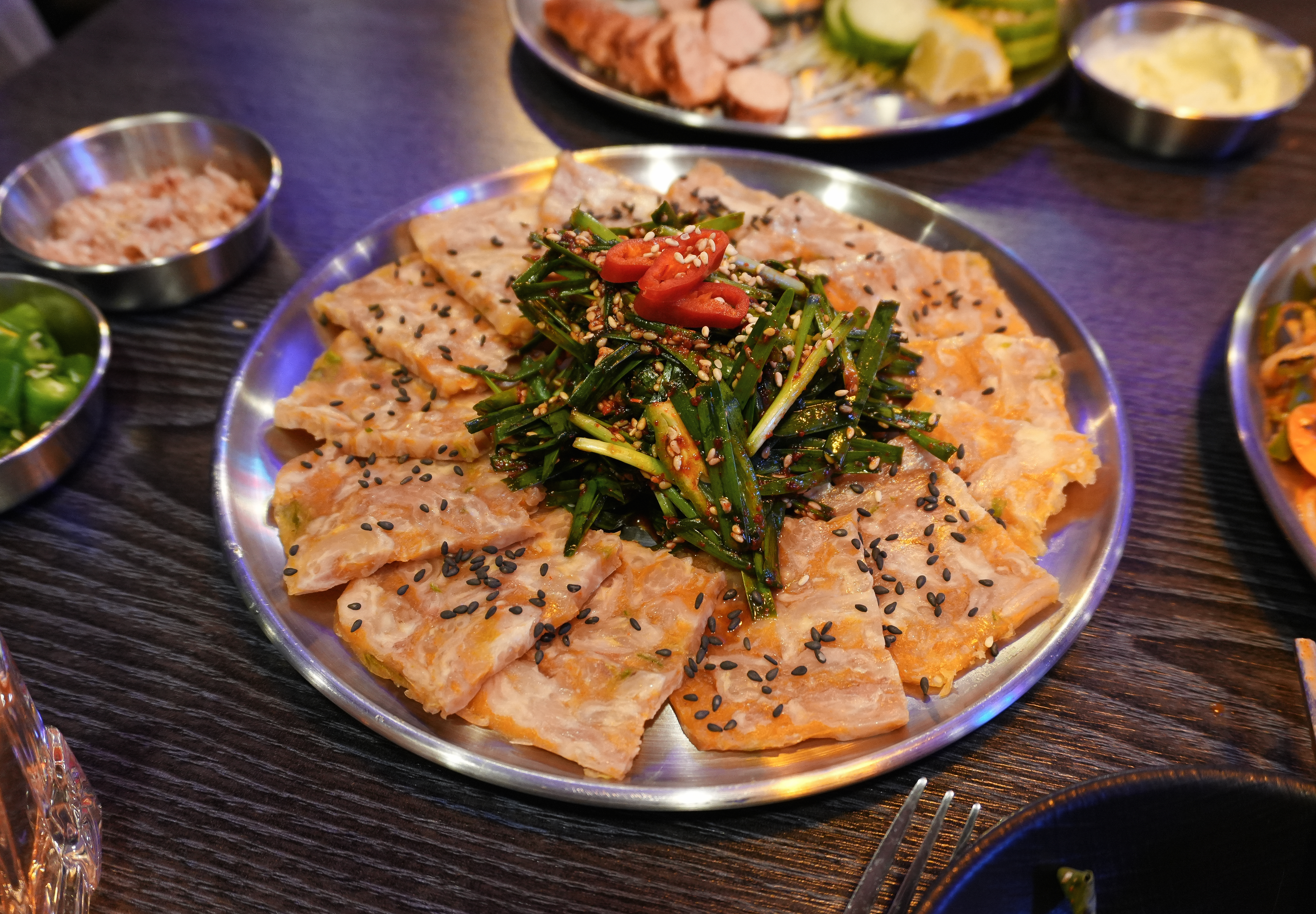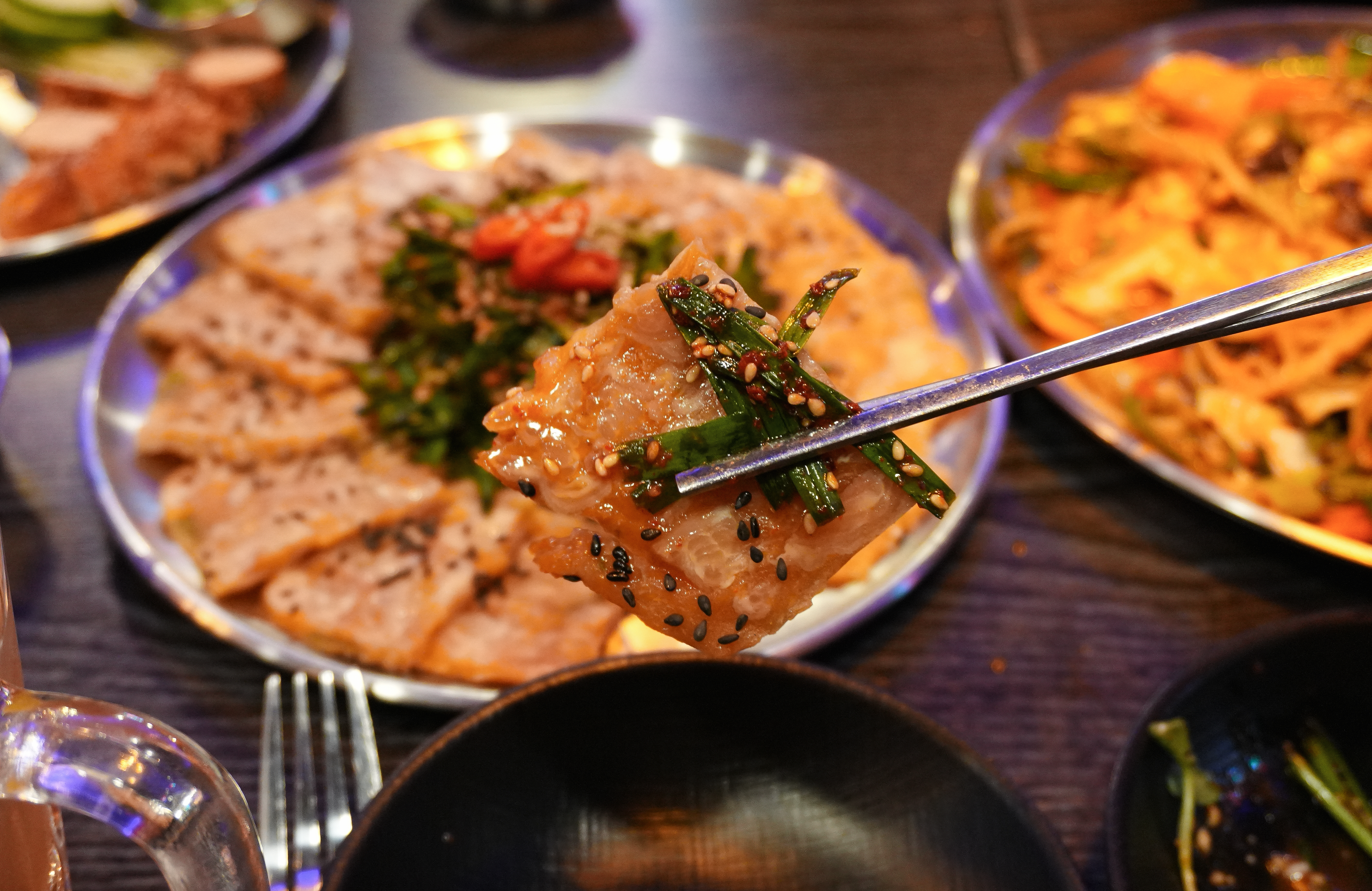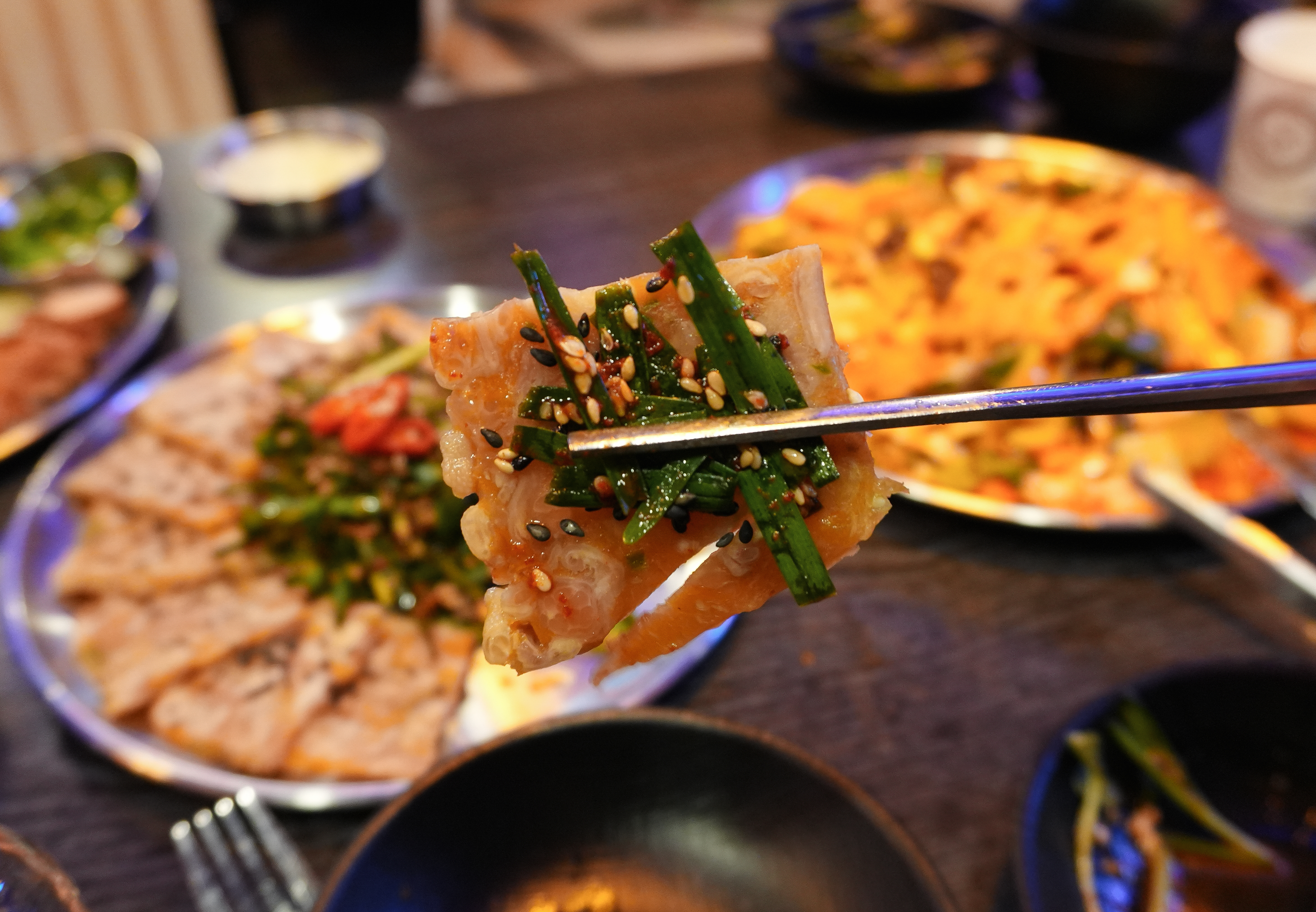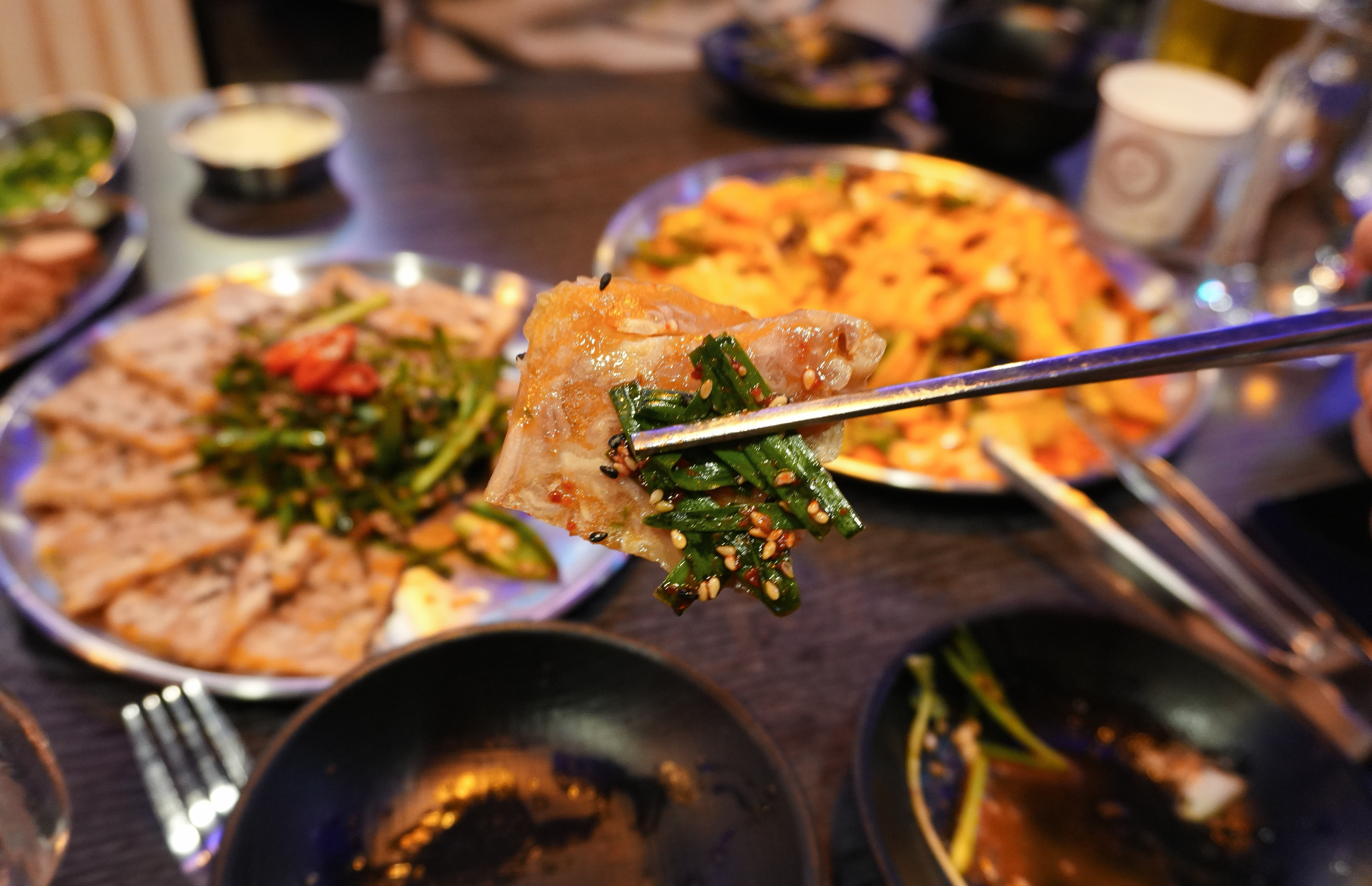 다음으로 소개해드릴 메뉴는 부추무침과 함께 나오는 닭발편육입니다. 일반적으로 먹는 돼지머리 누른 고기로 만든 편육은 특유의 누린내가 나는데, 닭발편육의 경우에는 잡내가 안 나서 맛있게 먹을 수 있었습니다. 특히 부드럽고 야들야들해서 맛있게 먹을 수 있었습니다.