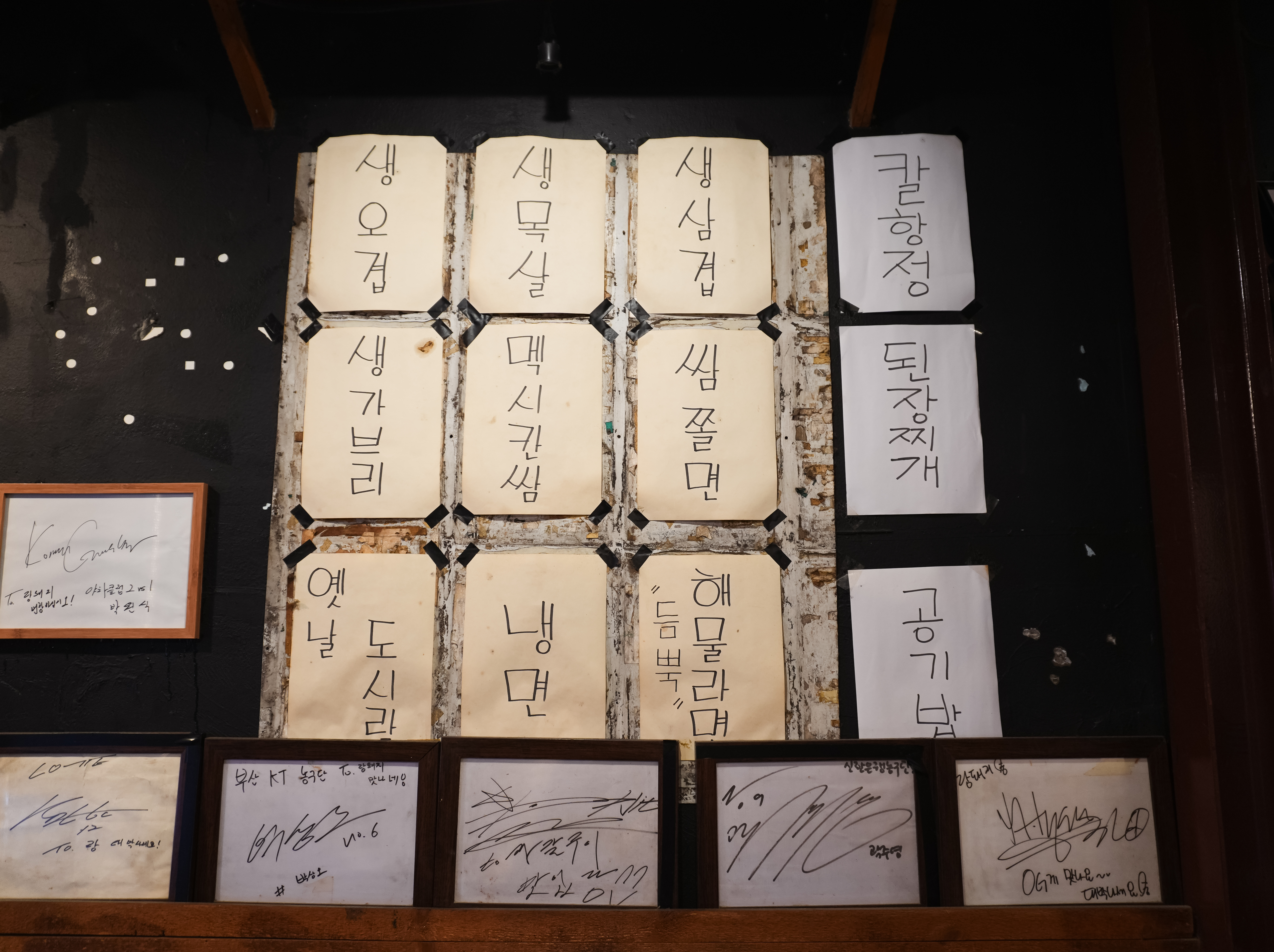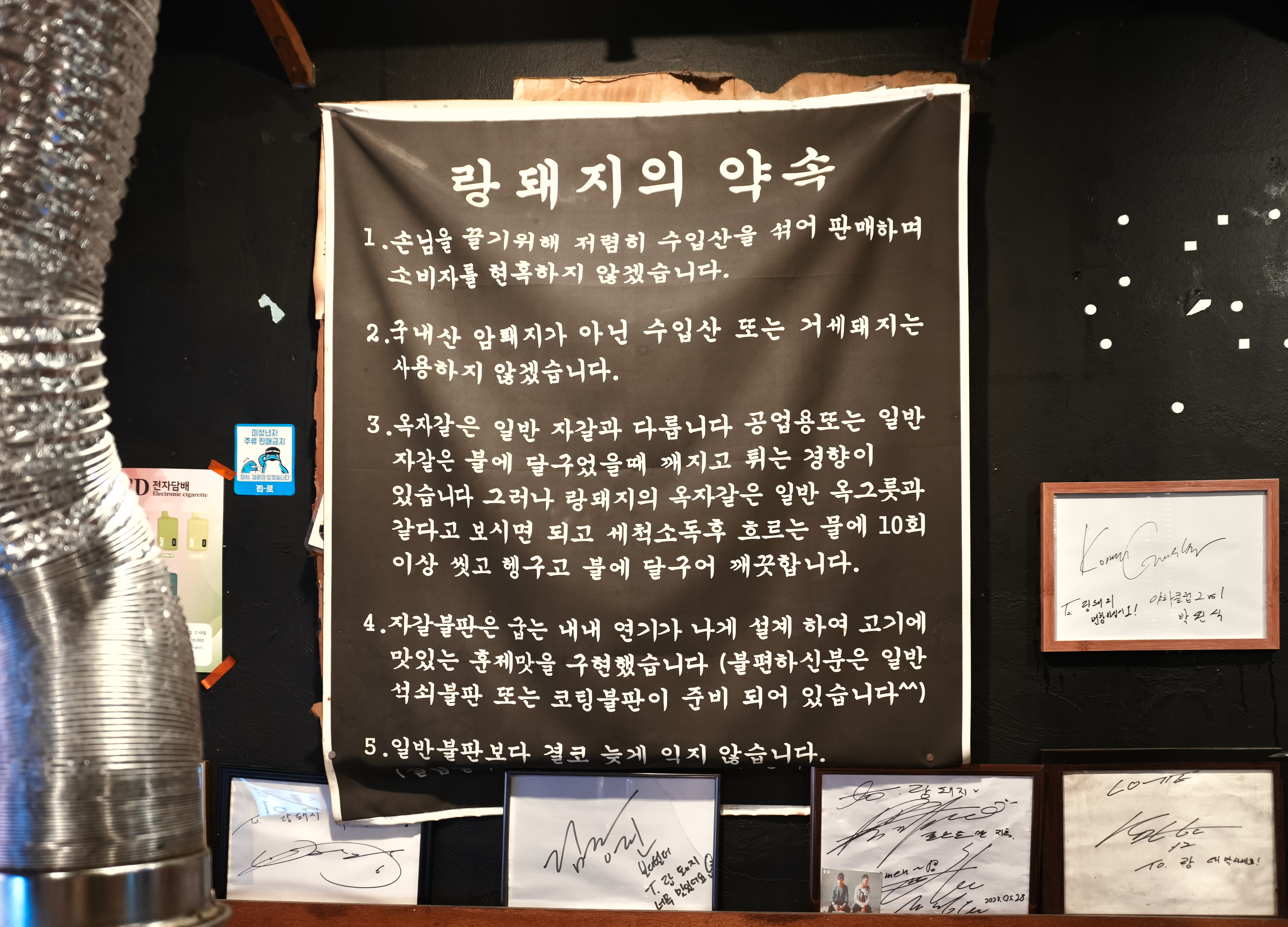 랑돼지는 숙성 초벌 돼지구이 전문점으로 부산 연제구 쌍미천로 155번길 33에 위치한 가게입니다. 이곳은 다양한 유명인이 방문한 가게로, 벽면에는 사인이 여러 장 붙어있었습니다. 랑돼지는 수입산고기나 거세돼지는 사용하지 않는다고 합니다. 그리고, 불판에 사용하고 있는 옥자갈은 깨지거나 튀지 않고, 깨끗하게 세척소독 후 내어주고 있어 안심하고 먹어도 된다고 합니다.