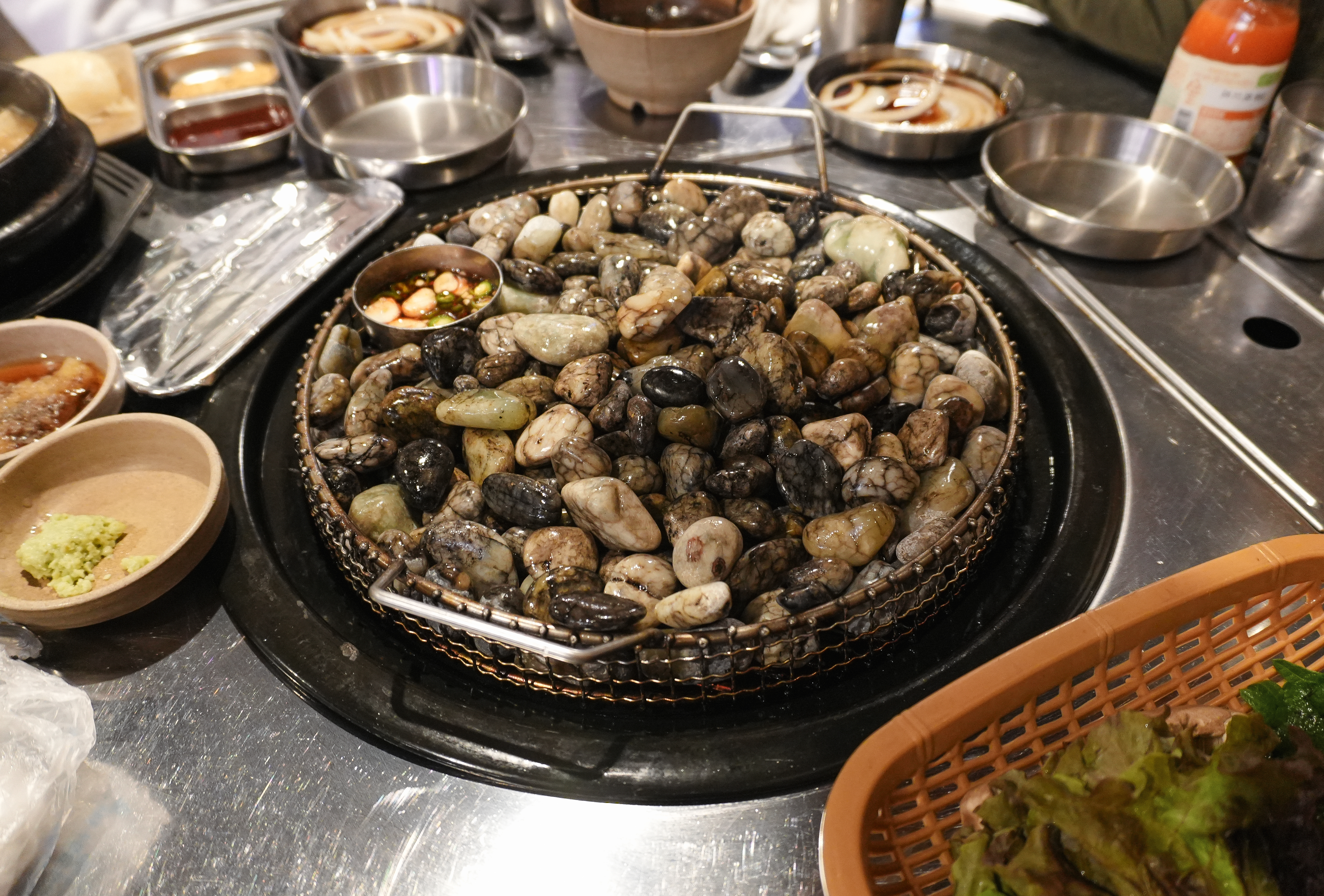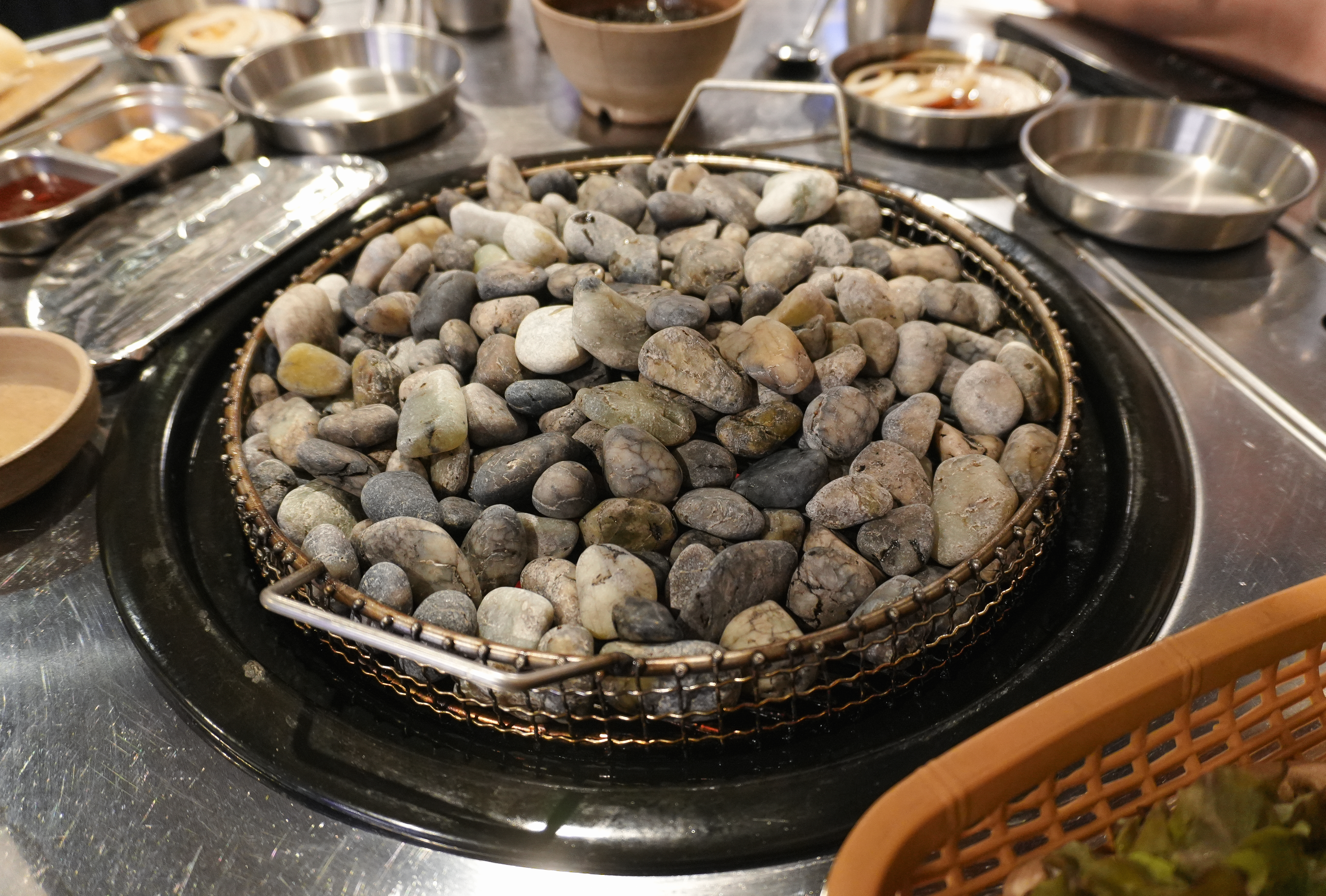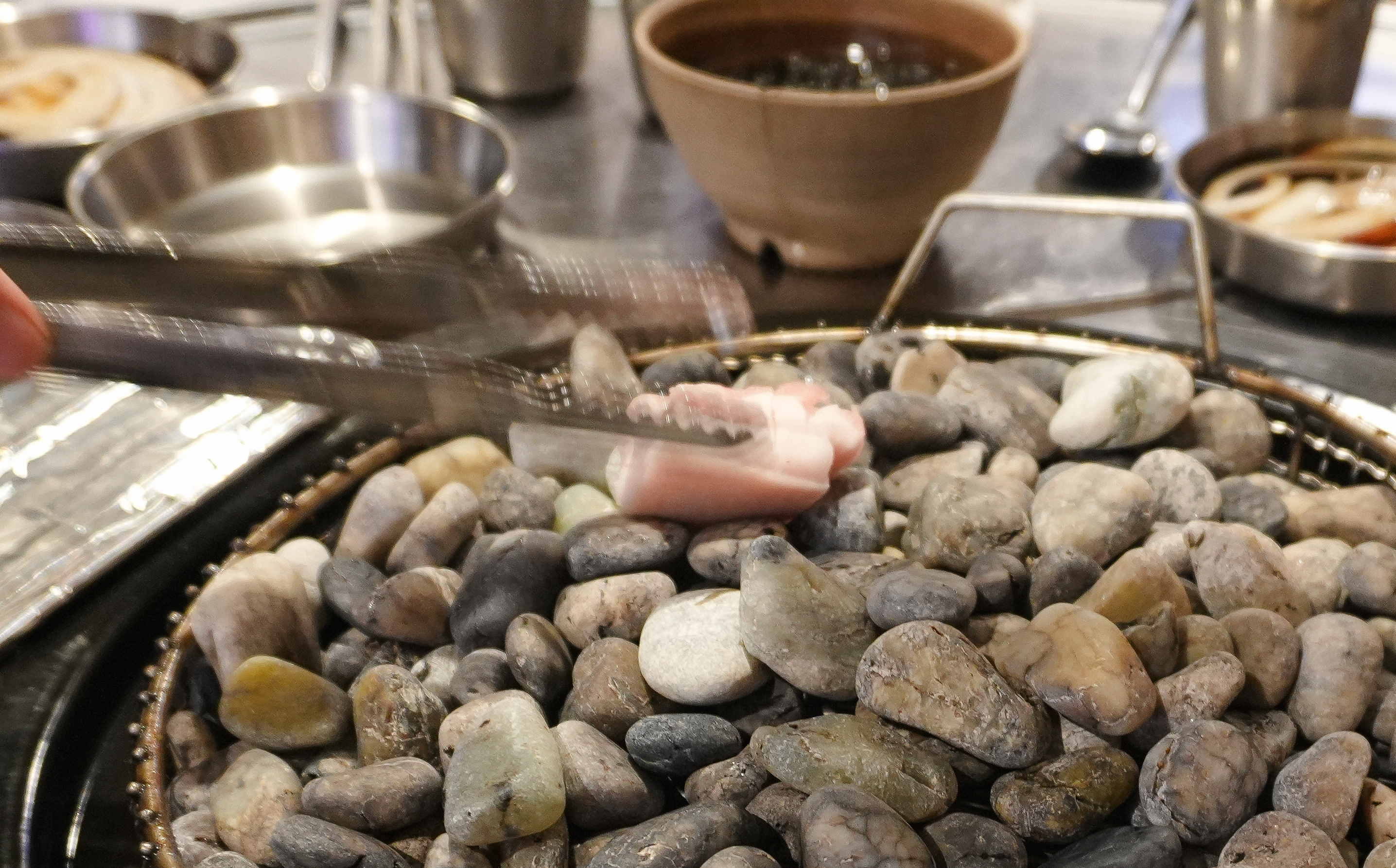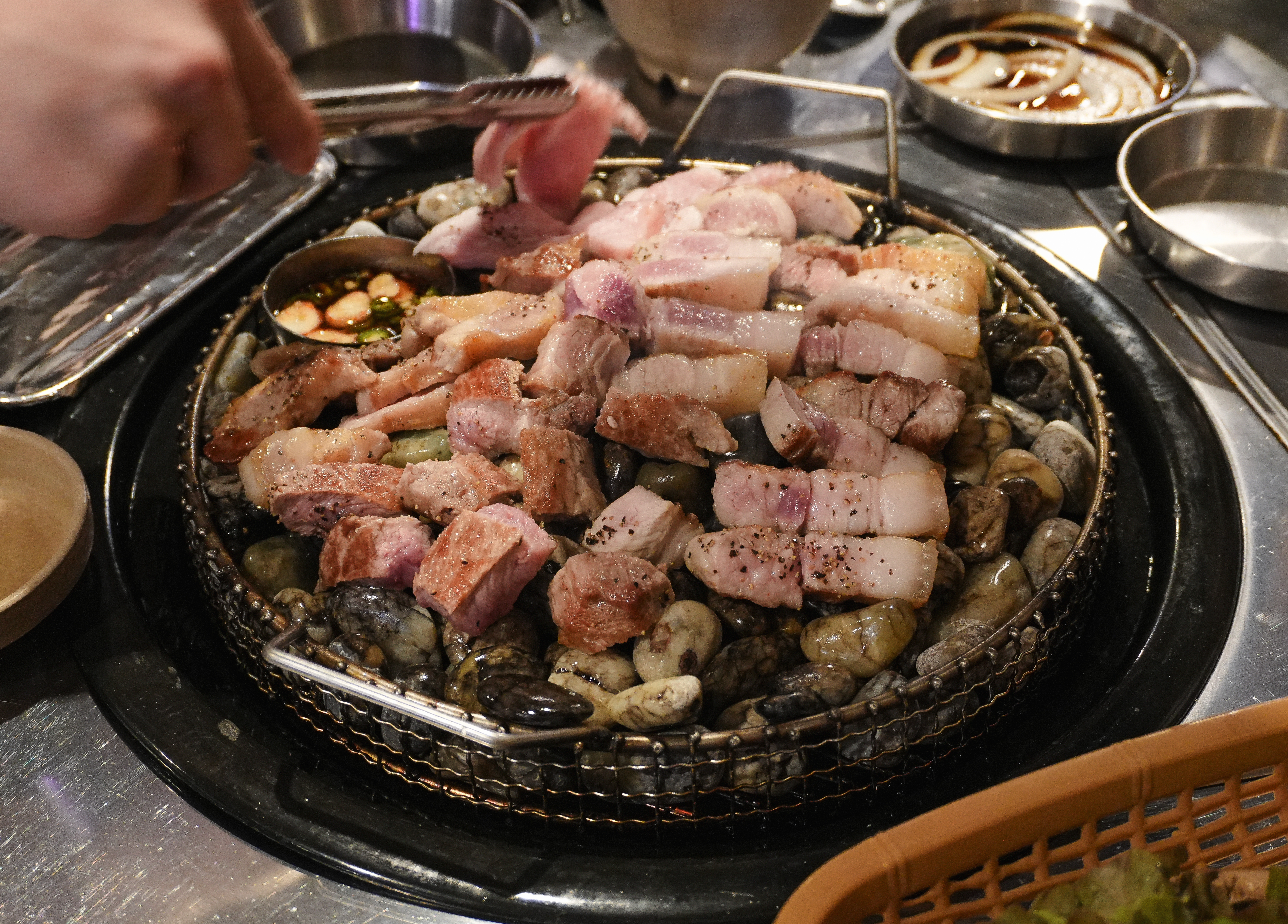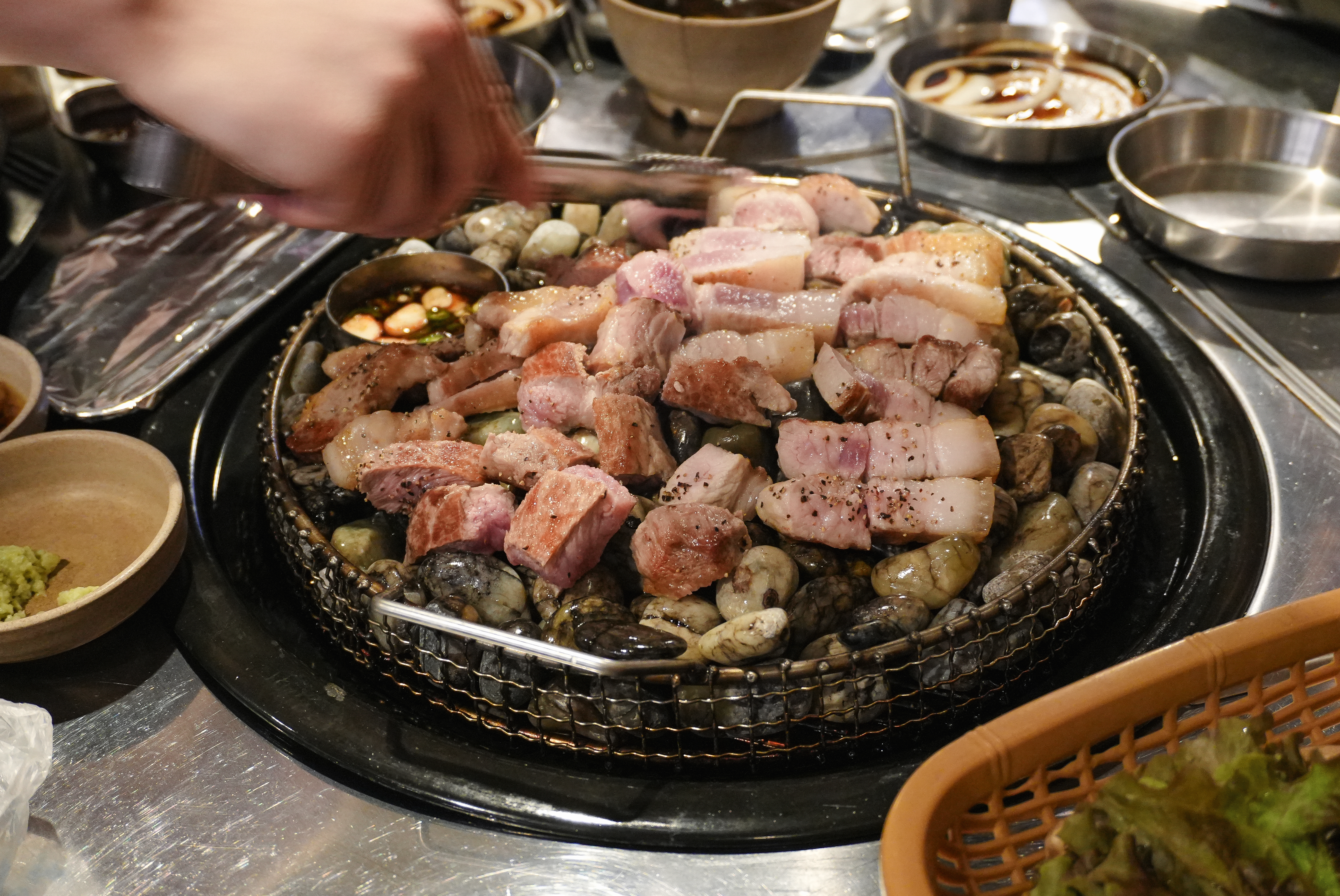 부산 자갈에 구워 먹는 삼겹살 맛집 랑돼지는 깨끗하게 씻어 나온 옥자갈에 고기가 달라붙지 않게 돼지비계로 기름칠을 해주고 있었습니다. 기름칠한 옥자갈이 잘 달궈지면 이제 고기를 올려줄 차례죠.