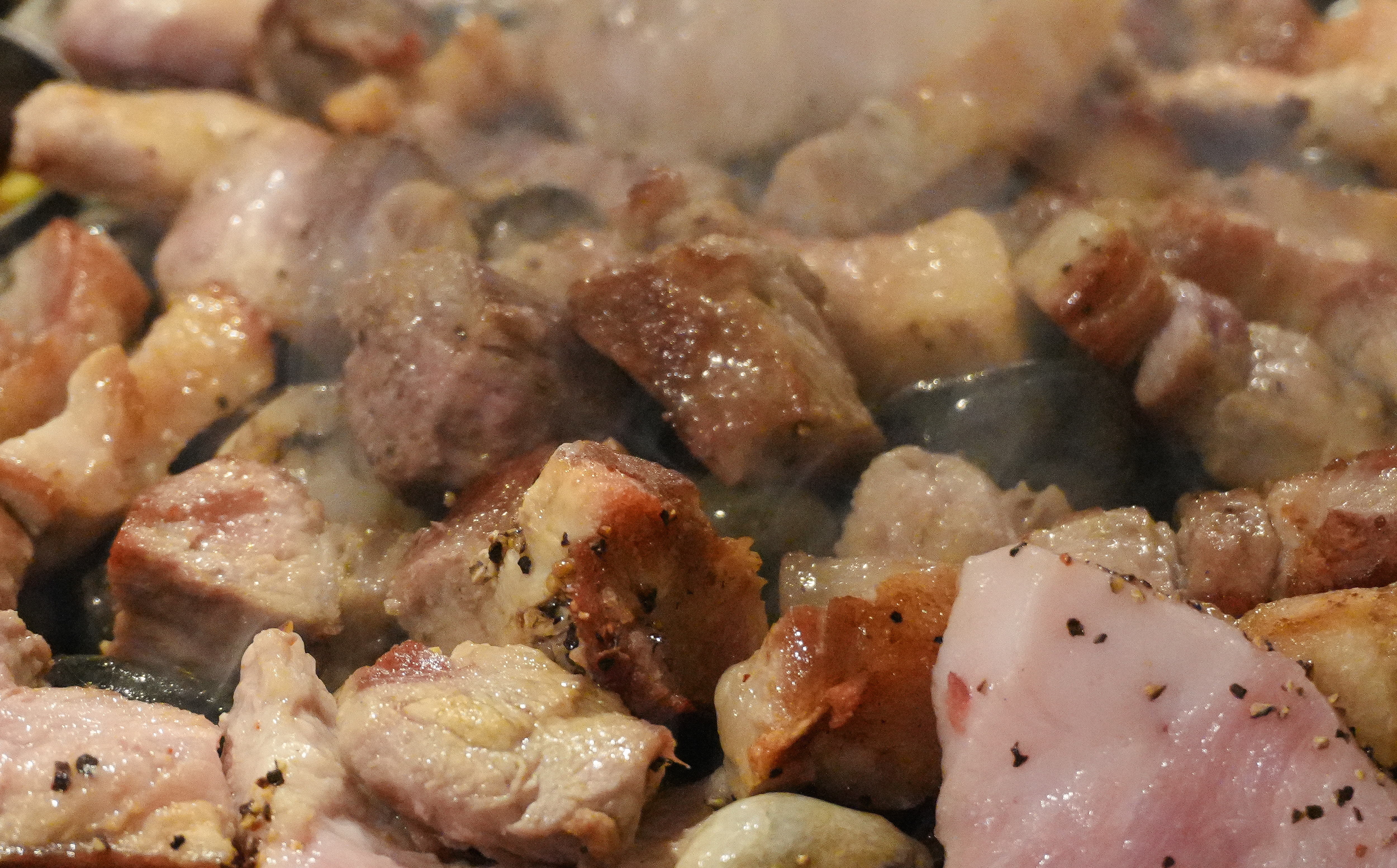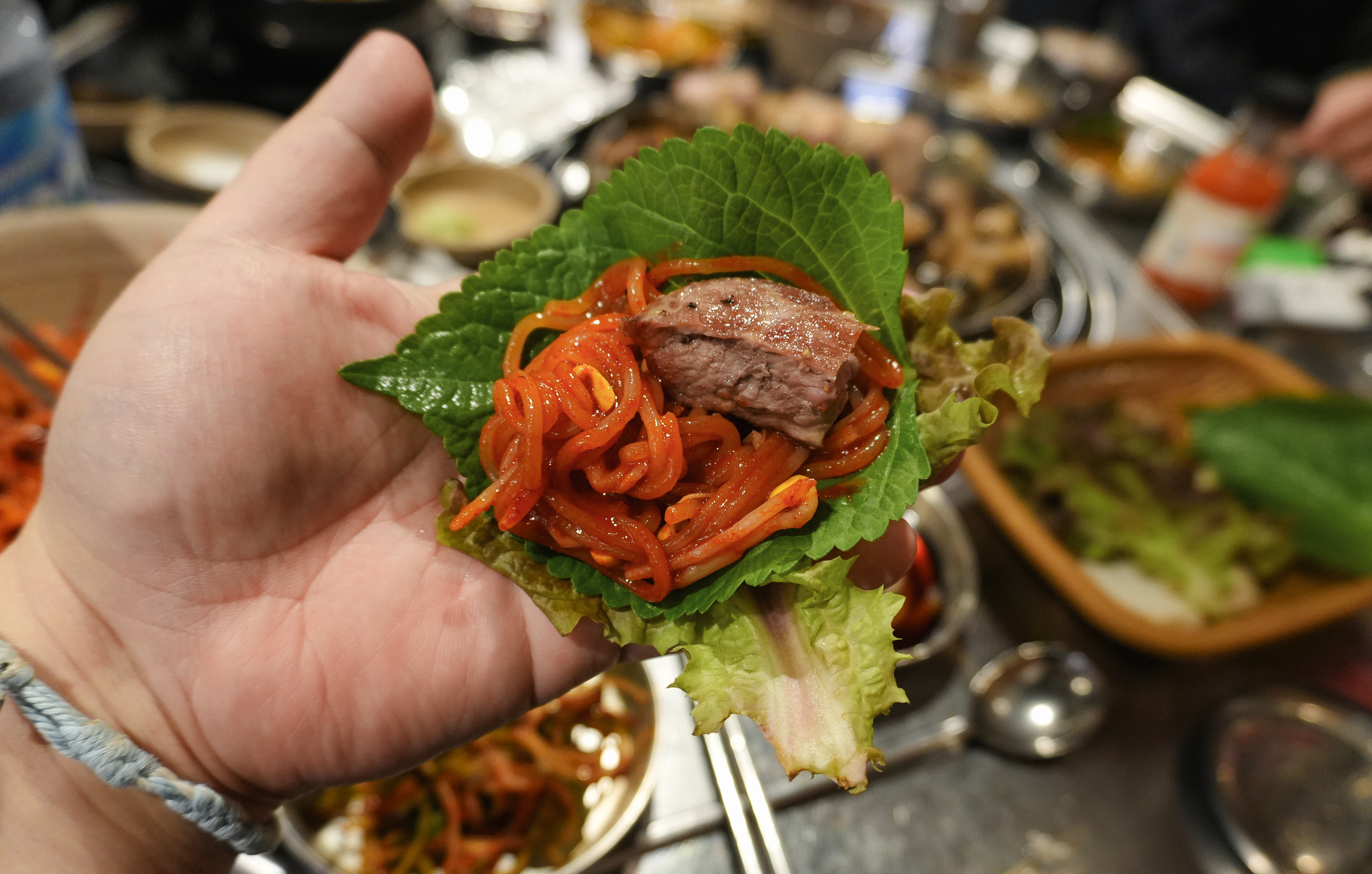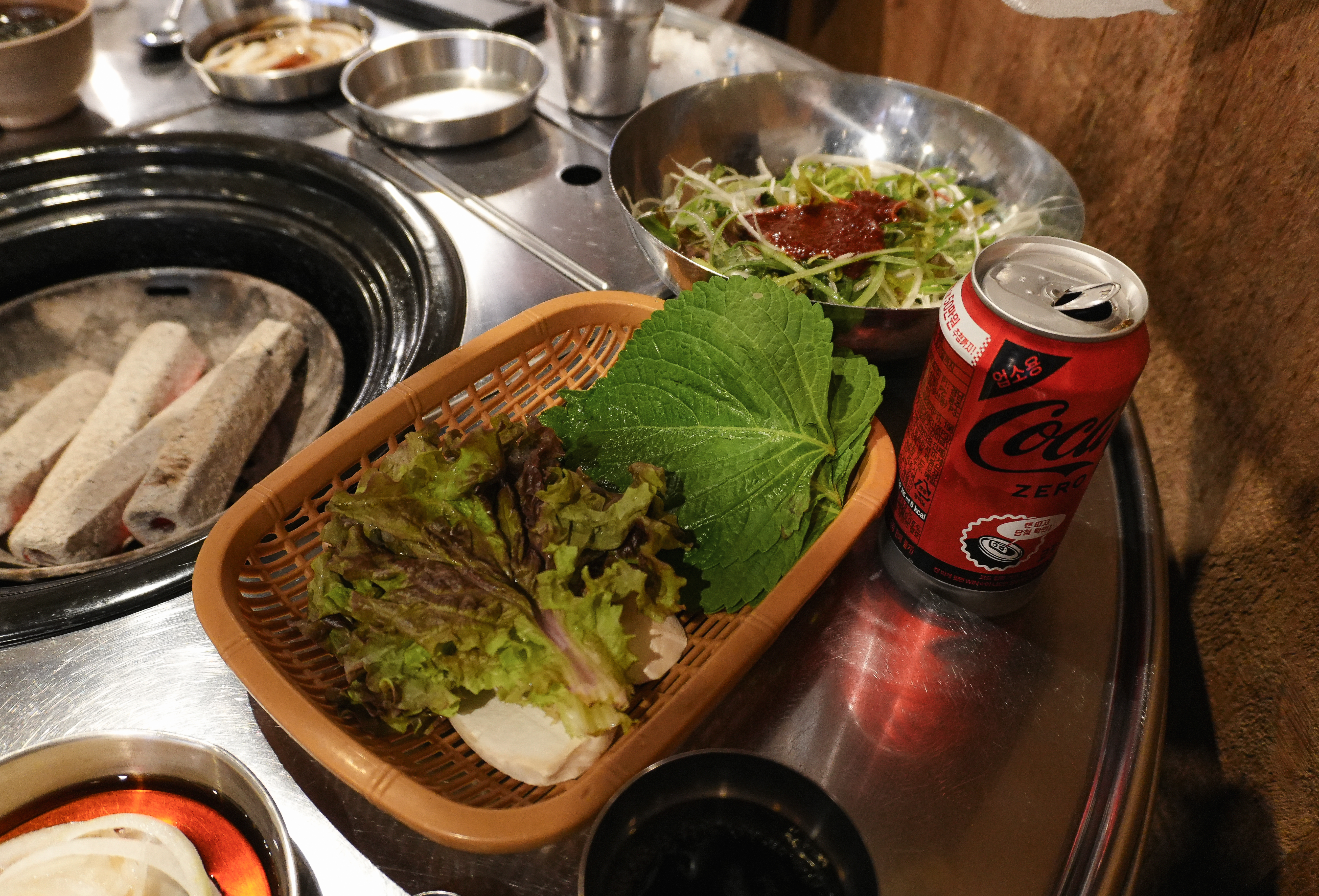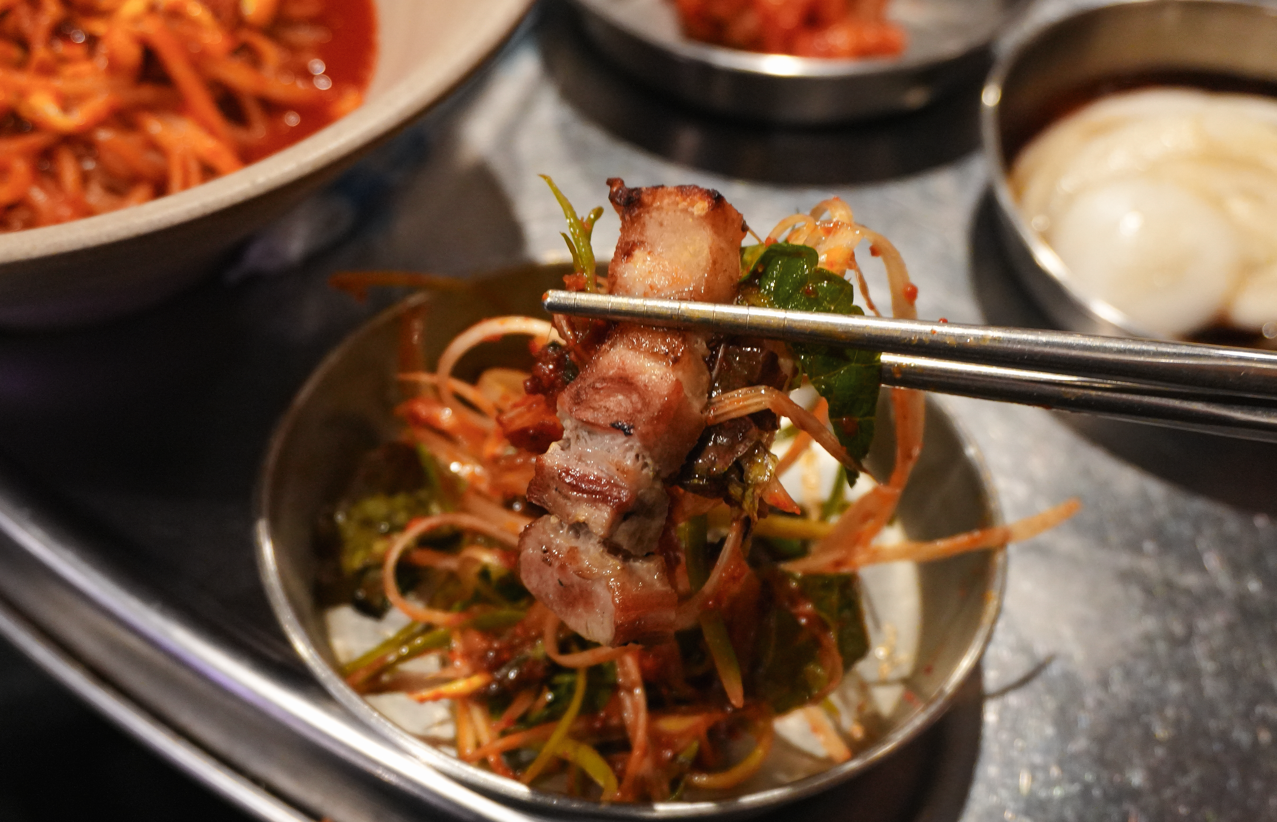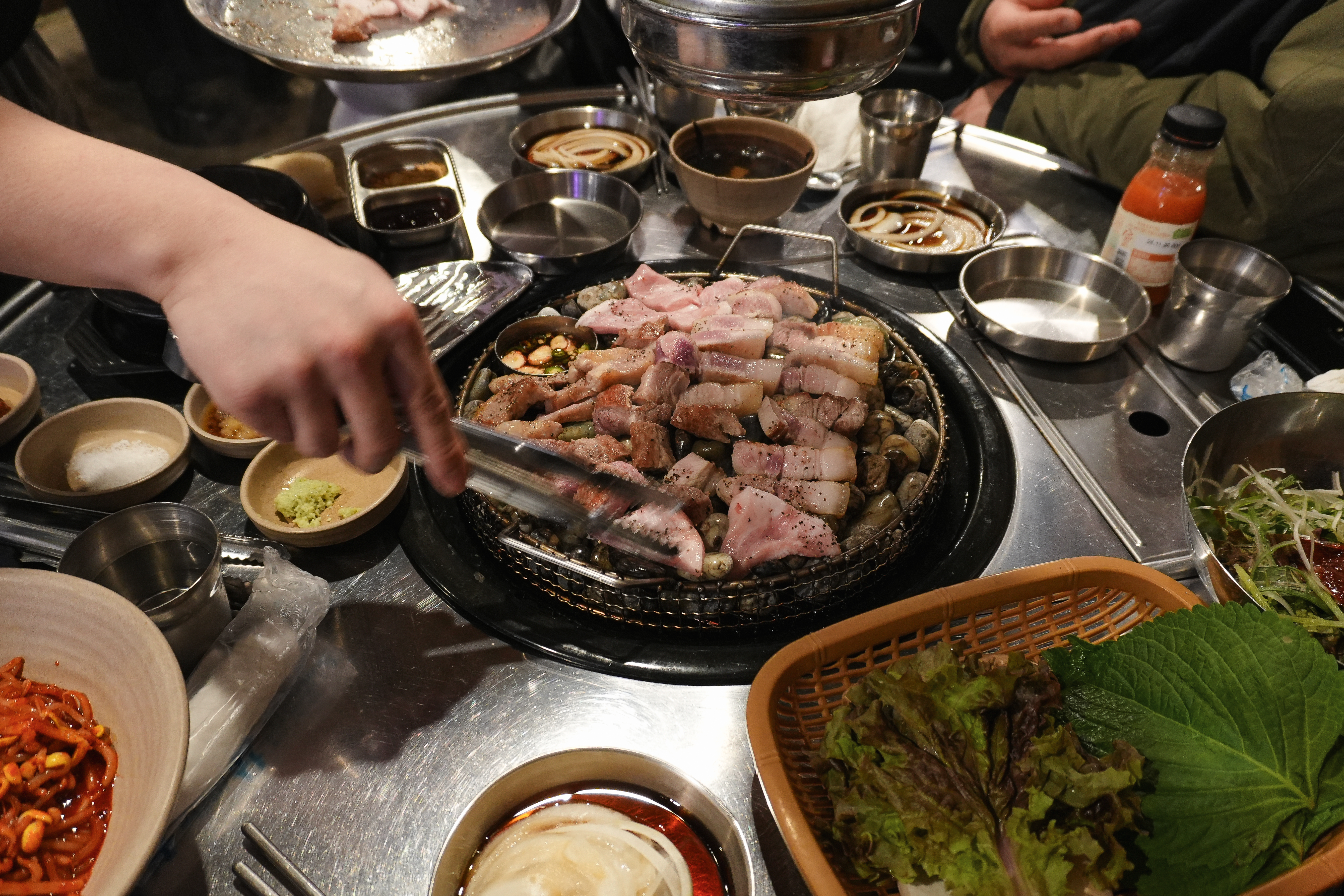 기다리는 동안 고기가 거의 다 익었습니다. 고기는 기름기가 쫙 빠져서 담백했고, 익은 고기들은 꼬들하게 식감도 좋았습니다. 앞서 소개에서 언급한 것처럼 랑돼지의 매콤 새콤한 쌈쫄면과 함께 곁들이면 더 맛이 좋았습니다.