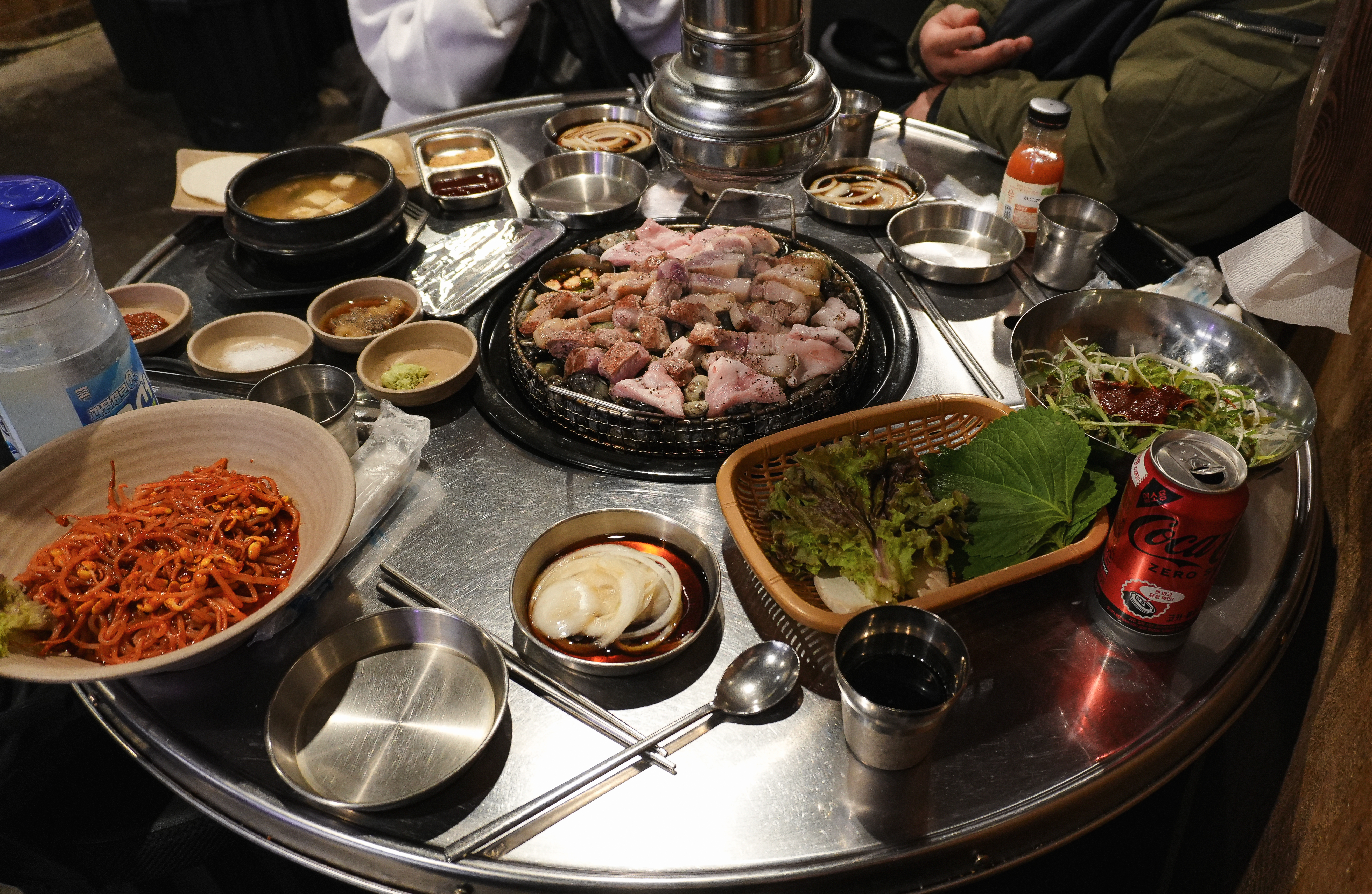 기다리는 동안 고기가 거의 다 익었습니다. 고기는 기름기가 쫙 빠져서 담백했고, 익은 고기들은 꼬들하게 식감도 좋았습니다. 앞서 소개에서 언급한 것처럼 랑돼지의 매콤 새콤한 쌈쫄면과 함께 곁들이면 더 맛이 좋았습니다.