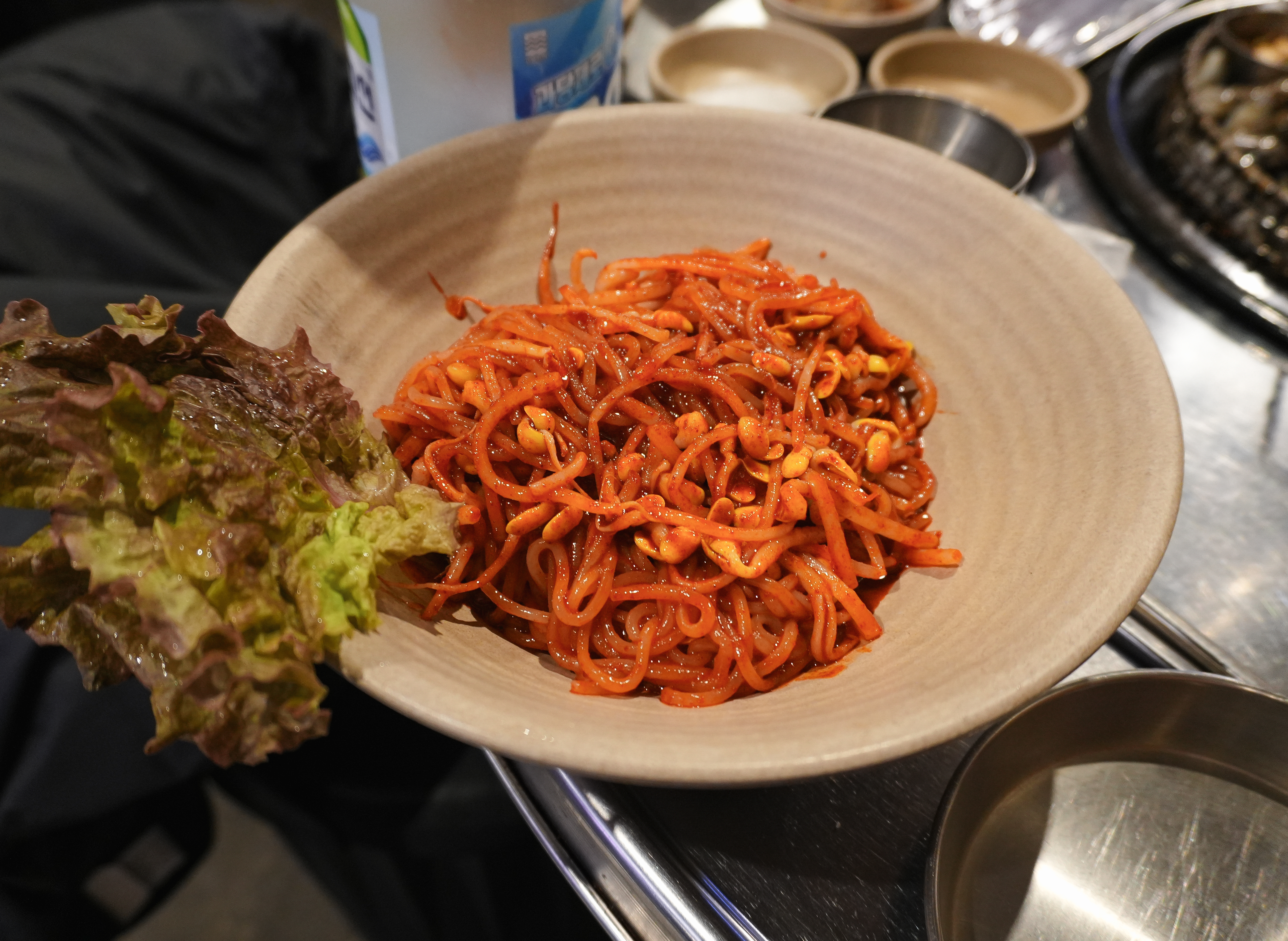 랑돼지의 삼겹살과 같이 곁들일만한 메뉴로 저는 쌈쫄면을 추천드립니다. 매콤 새콤 양념에 시원하게 무쳐낸 쌈쫄면은 그냥 먹어도 맛있었지만, 고기에 같이 곁들여 쌈을 싸서 먹어도 맛있었습니다. 각종 양념장과 쌈채소가 있어서 입맛에 따라 다양한 조합으로 먹을 수도 있었습니다.