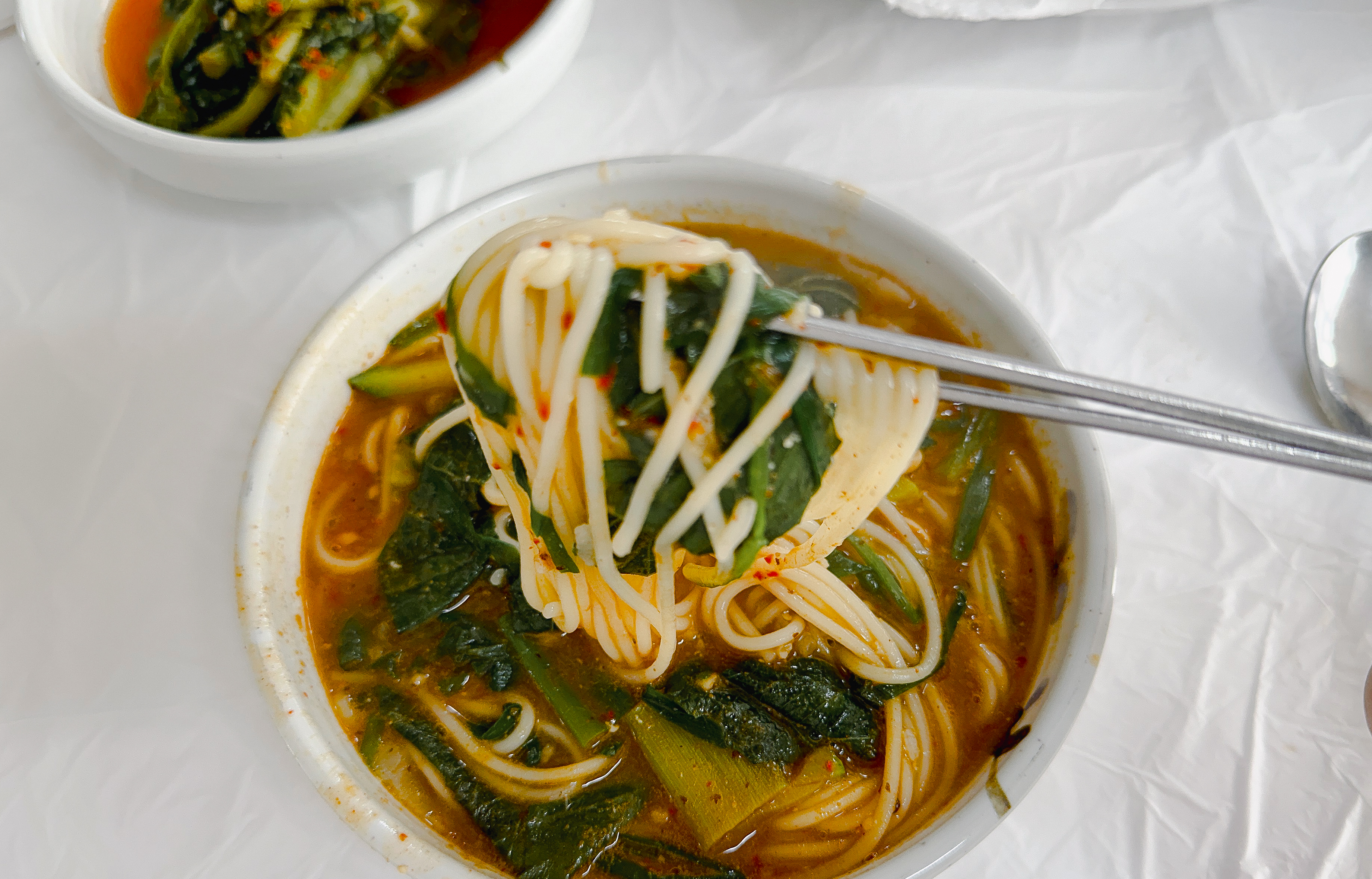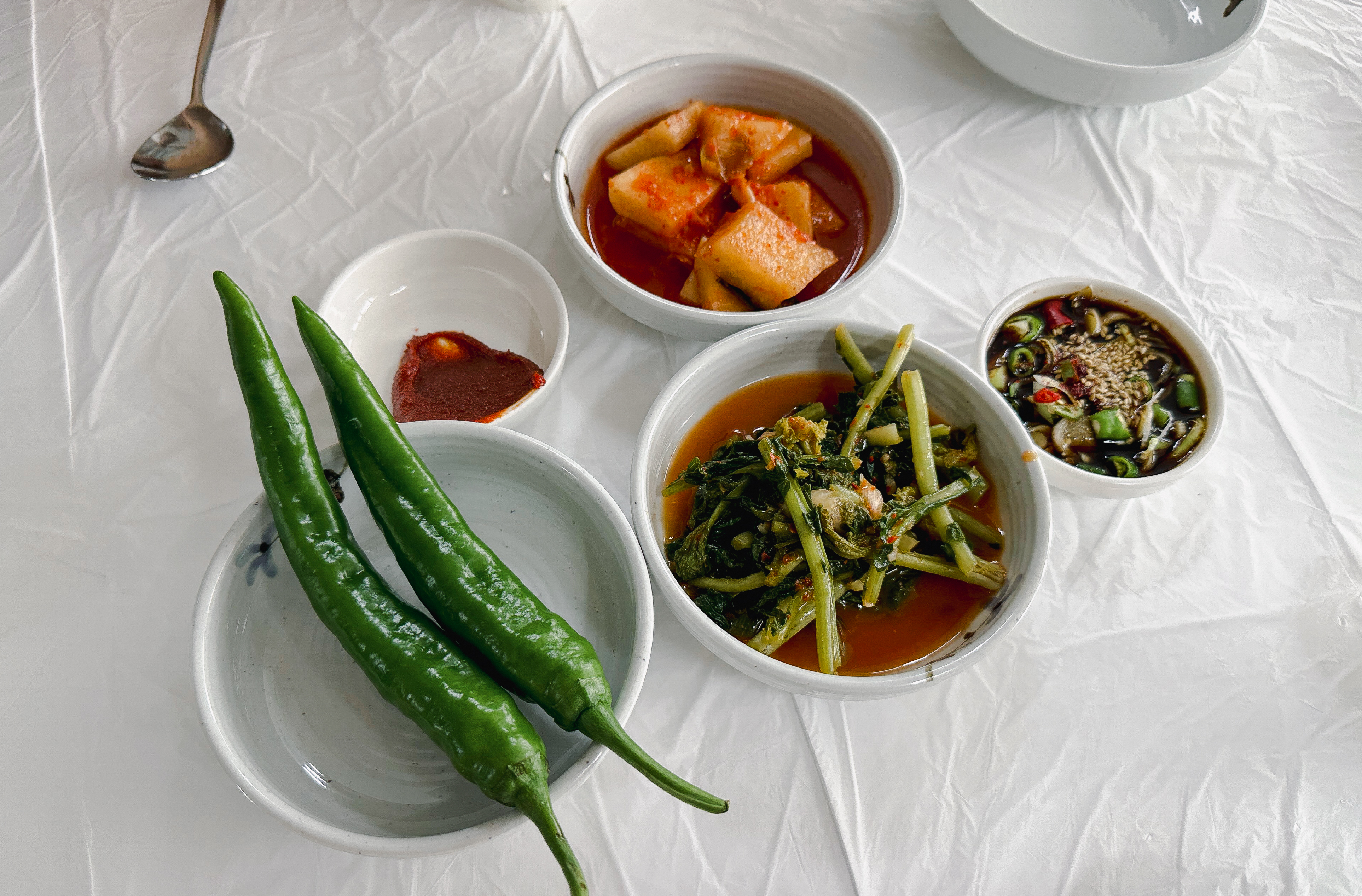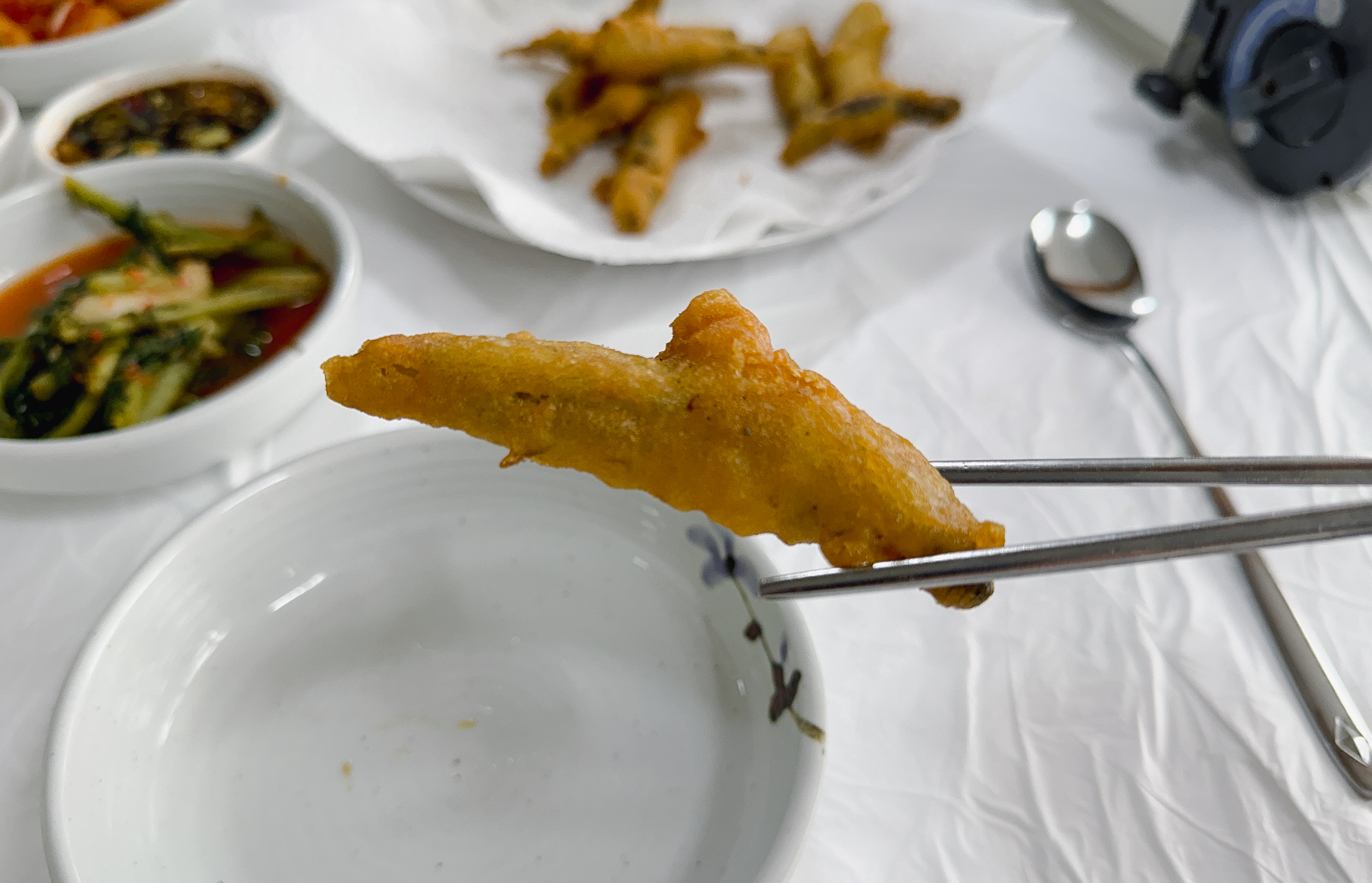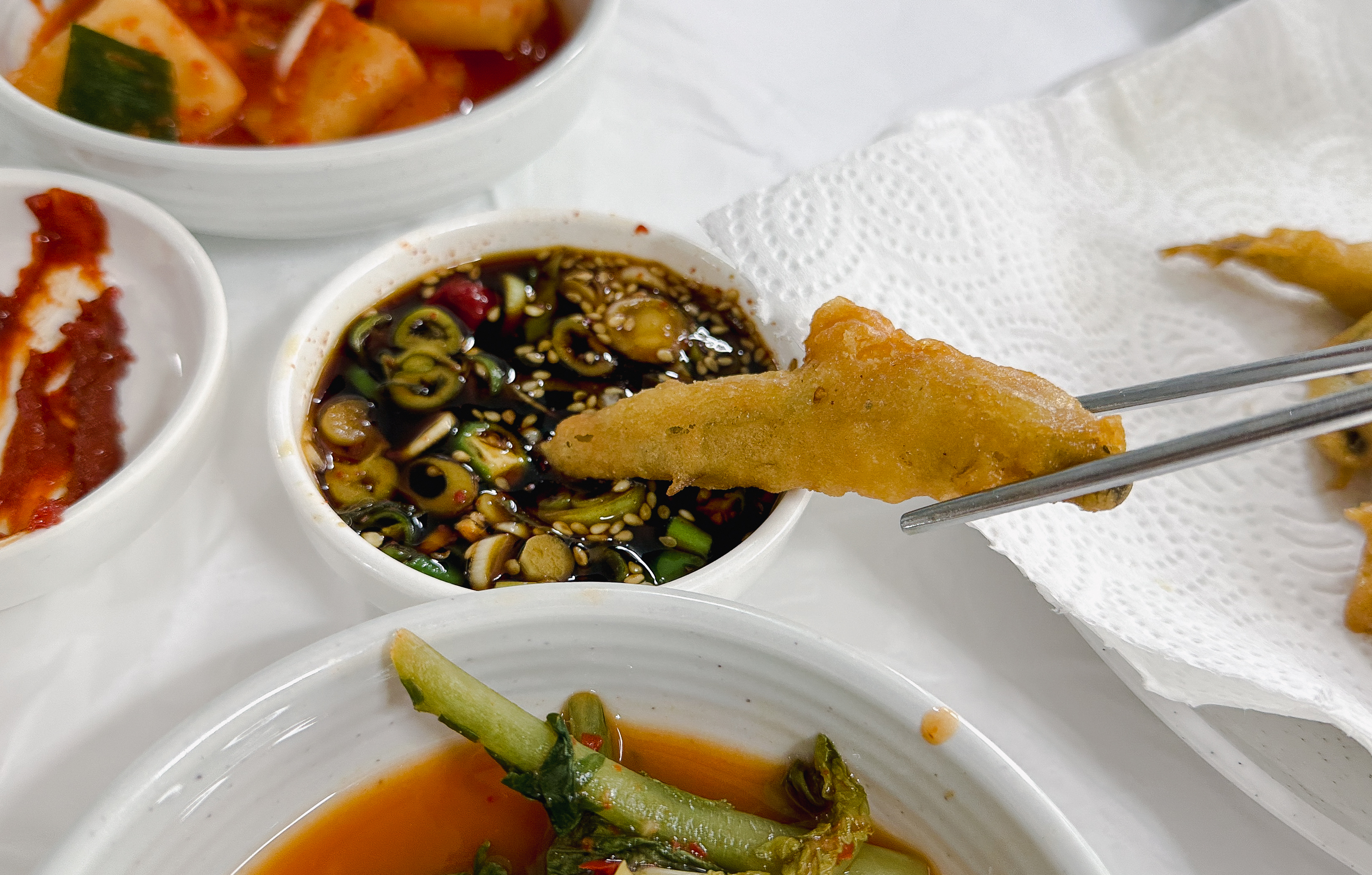 곧이어 반찬들이 먼저 준비되었습니다. 열무김치와 무김치 그리고 고추가 나왔고, 추어튀김을 찍어먹을 간장소스가 나왔습니다. 바삭바삭 잘 익은 추어튀김이 먹음직스럽게 생겼더라고요.
