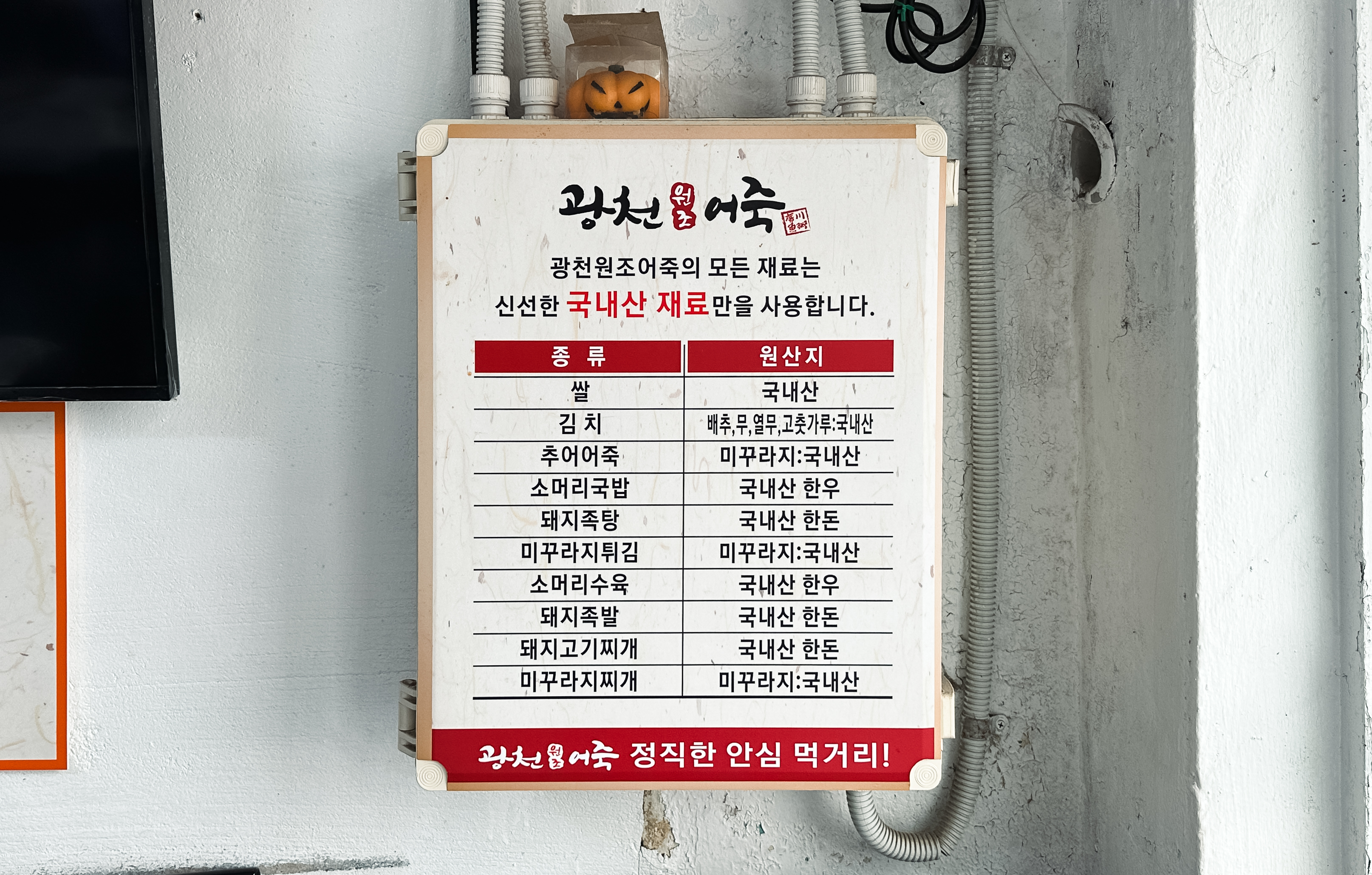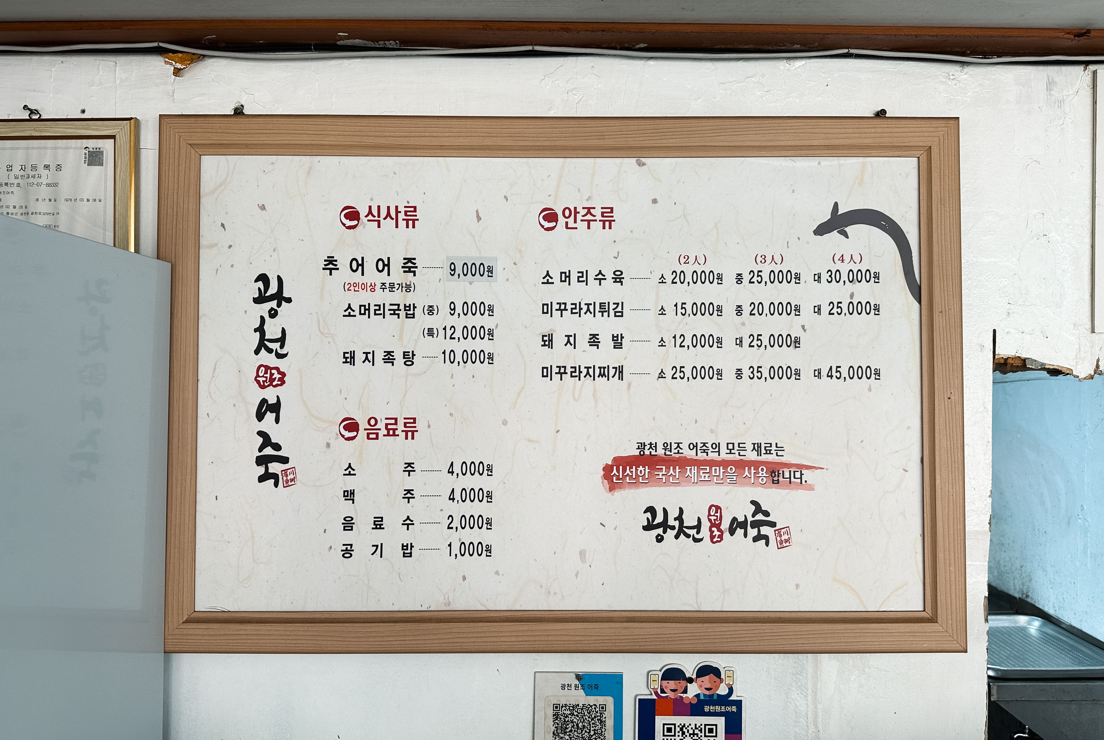 홍성 광천원조어죽의 메뉴는 추어어죽, 소머리국밥, 돼지족탕, 소머리수육, 미꾸라지튀김, 돼지족발, 미꾸라지찌개 등이 있었고, 모든 재료는 신선한 국산 재료만을 사용한다고 합니다.