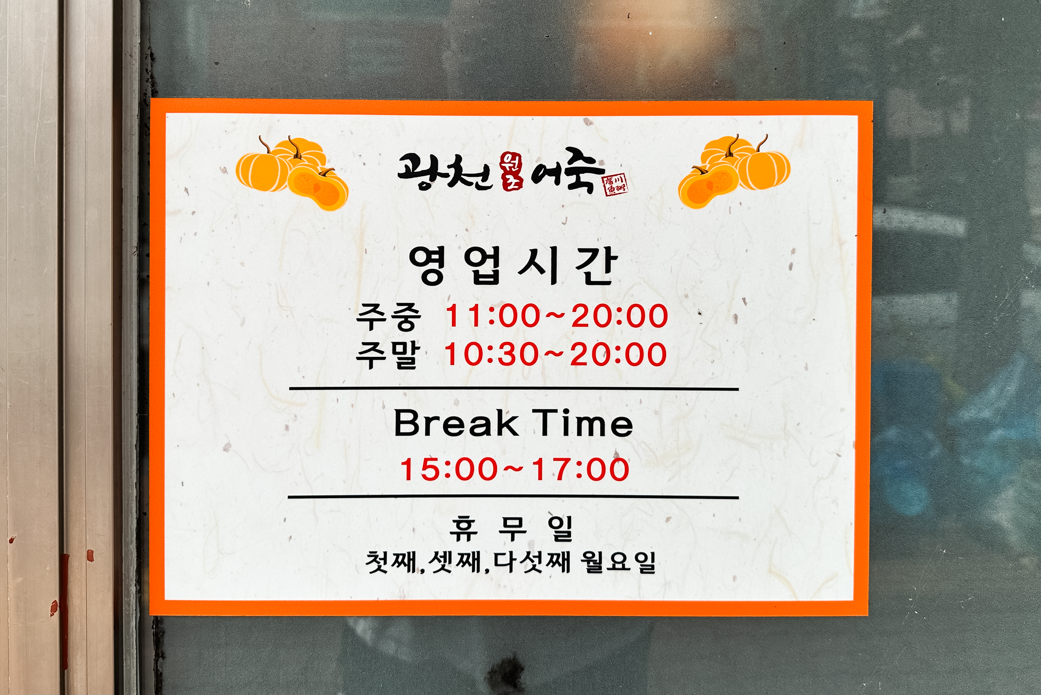 광천원조어죽은 영업시간은 주중 11:00~20:00, 주말 10:30~20:00 까지입니다. 휴게시간은 15:00~17:00 이며, 휴무일은 1, 3, 5째주 월요일이었습니다.