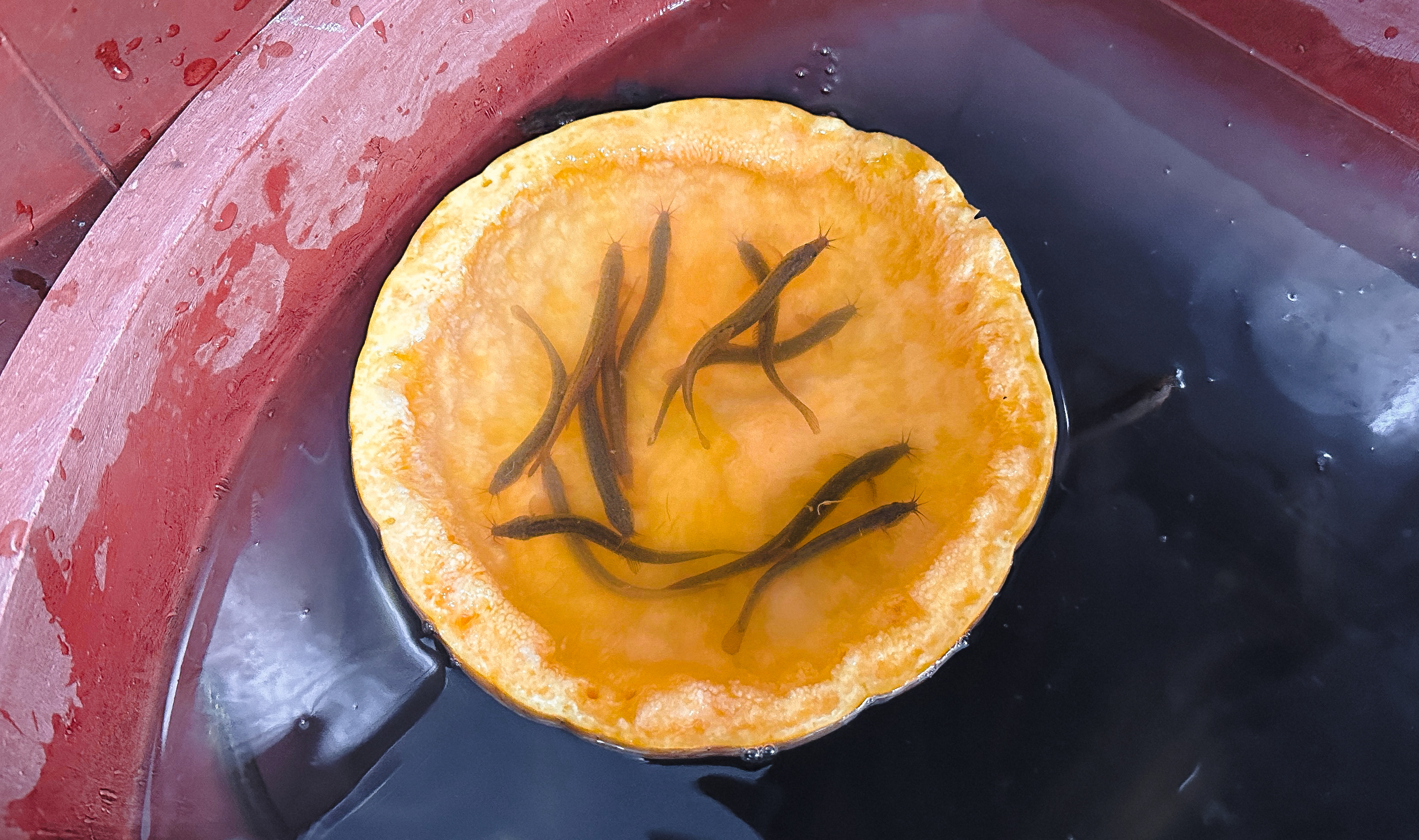 메뉴를 주문하고 사장님의 허락을 받아 호박을 먹고 있는 미꾸라지를 구경했습니다. 미꾸라지들이 꿈틀대는 모습이 조금 징그럽기는 했지만, 호박을 먹고 있는 모습이 신기하기도 하고 뭔가가 계속 움직이니 재미있더라고요.