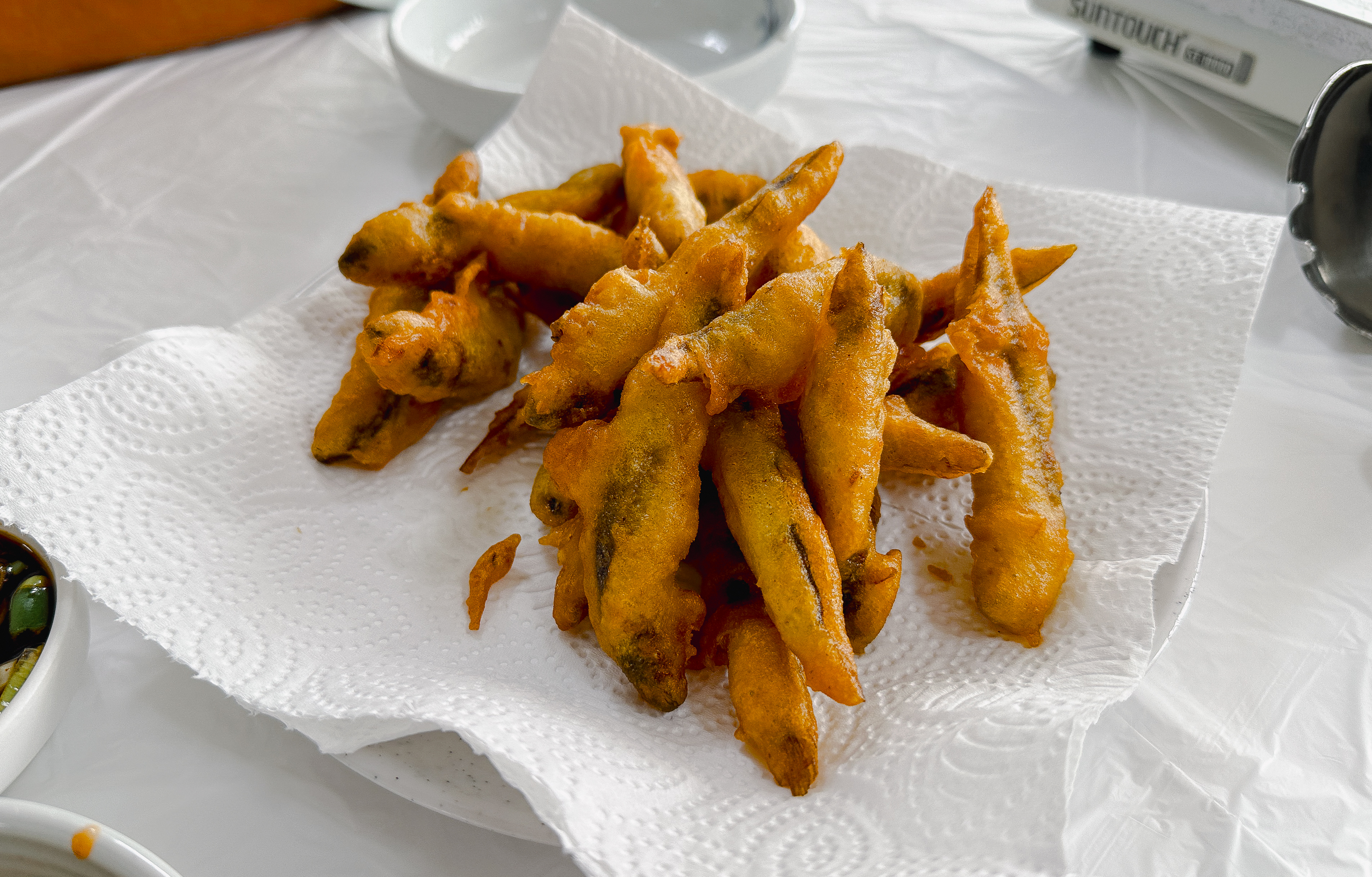 곧이어 반찬들이 먼저 준비되었습니다. 열무김치와 무김치 그리고 고추가 나왔고, 추어튀김을 찍어먹을 간장소스가 나왔습니다. 바삭바삭 잘 익은 추어튀김이 먹음직스럽게 생겼더라고요.