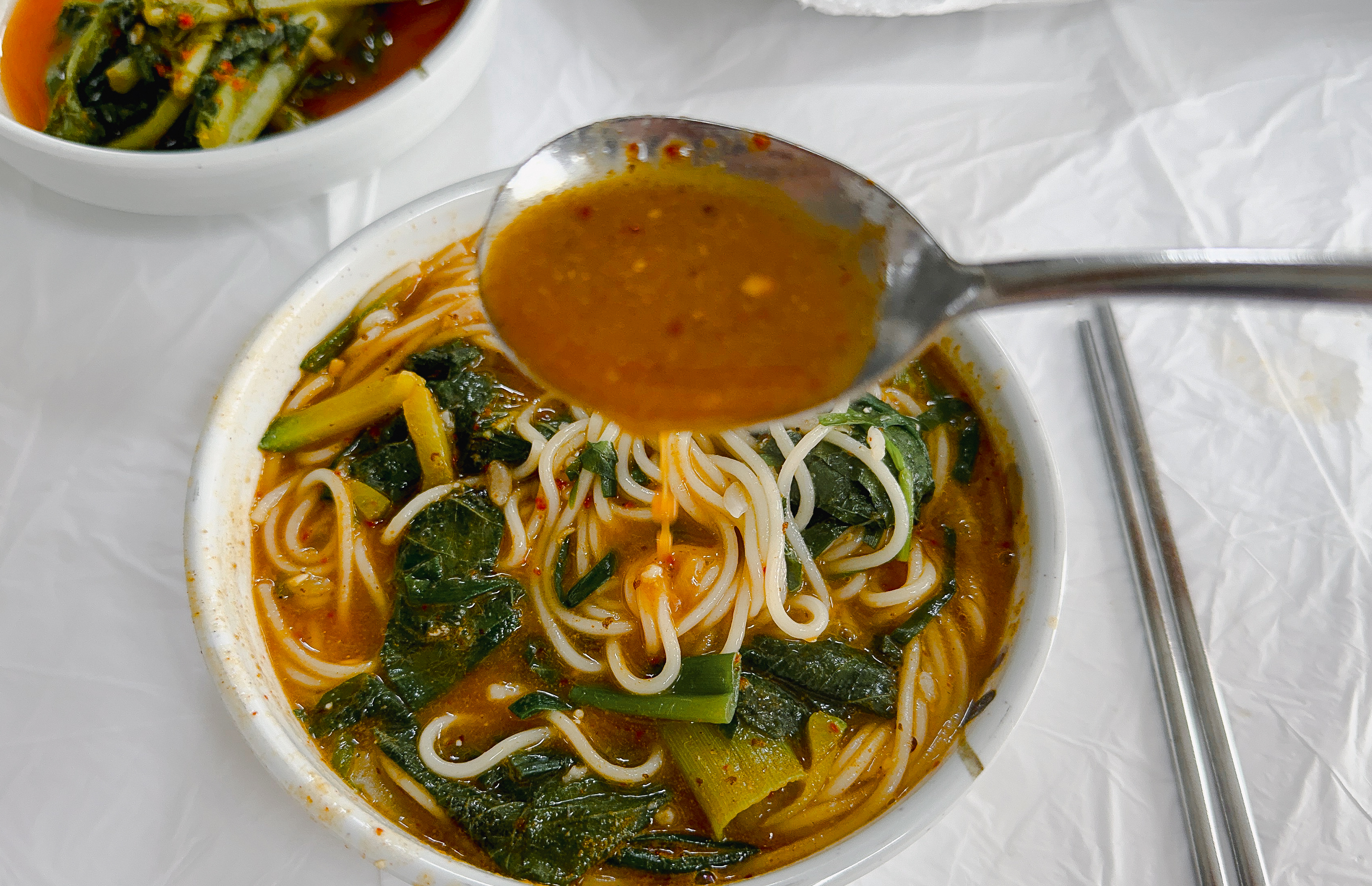 광천원조어죽의 추어튀김을 먹고 있는데, 주문한 어죽이 나왔습니다. 어죽에는 수제비와 소면이 들어있었고, 국물은 진하고 맛있었습니다. 어죽의 수제비와 소면을 어느 정도 먹은 다음에는 밥을 넣어 먹을 수도 있었습니다.