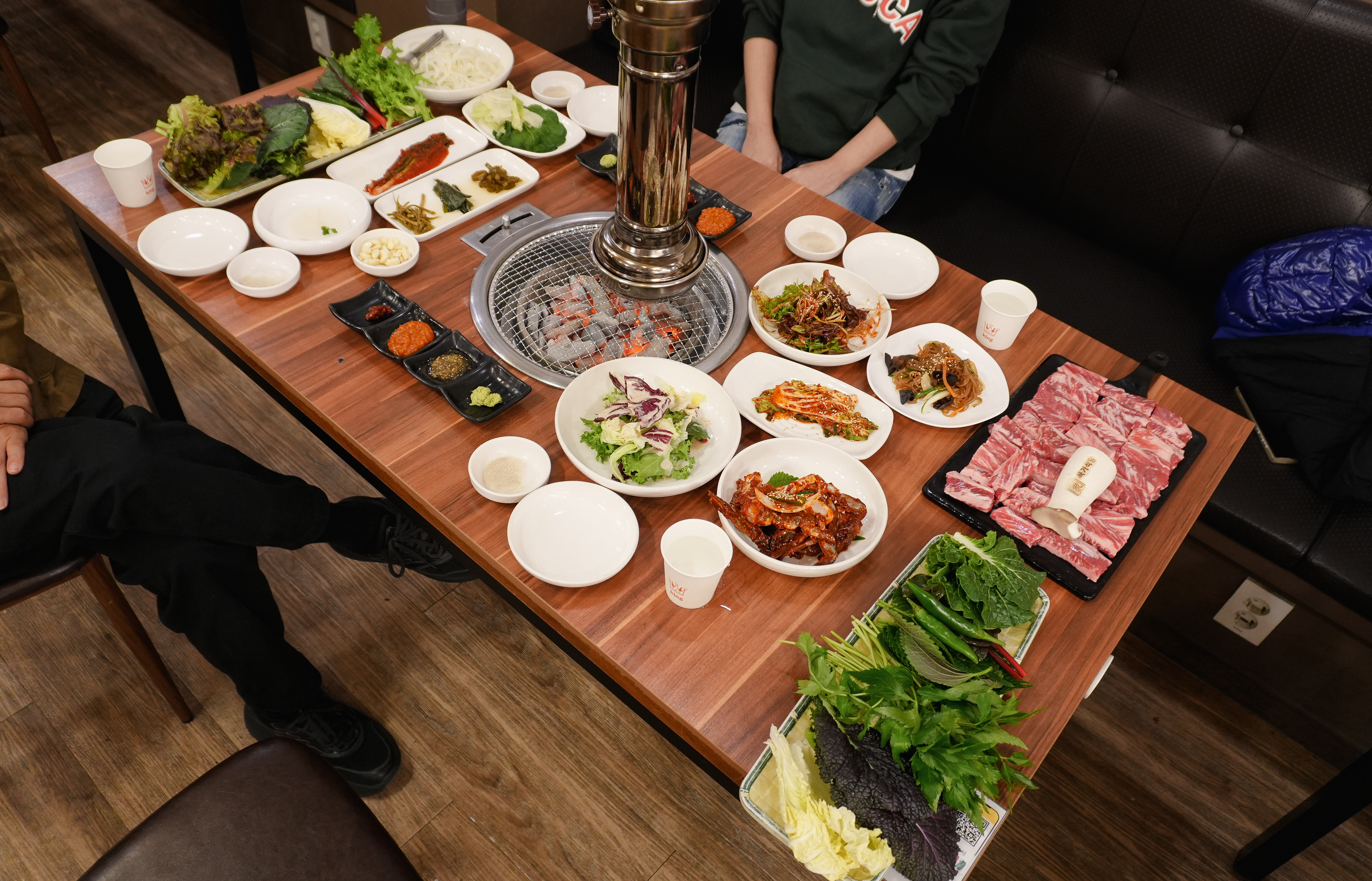 김포 석모리 소생갈비 맛집 육가식당의 생 소갈비살부터 준비되었습니다. 가져온 각종 쌈채소와 함께 테이블이 한 상 차려졌는데, 반찬들도 맛있었고, 특히 양념을 하지 않은 선홍빛의 신선한 생 소갈빗살이 정말 맛있게 보이더라고요.