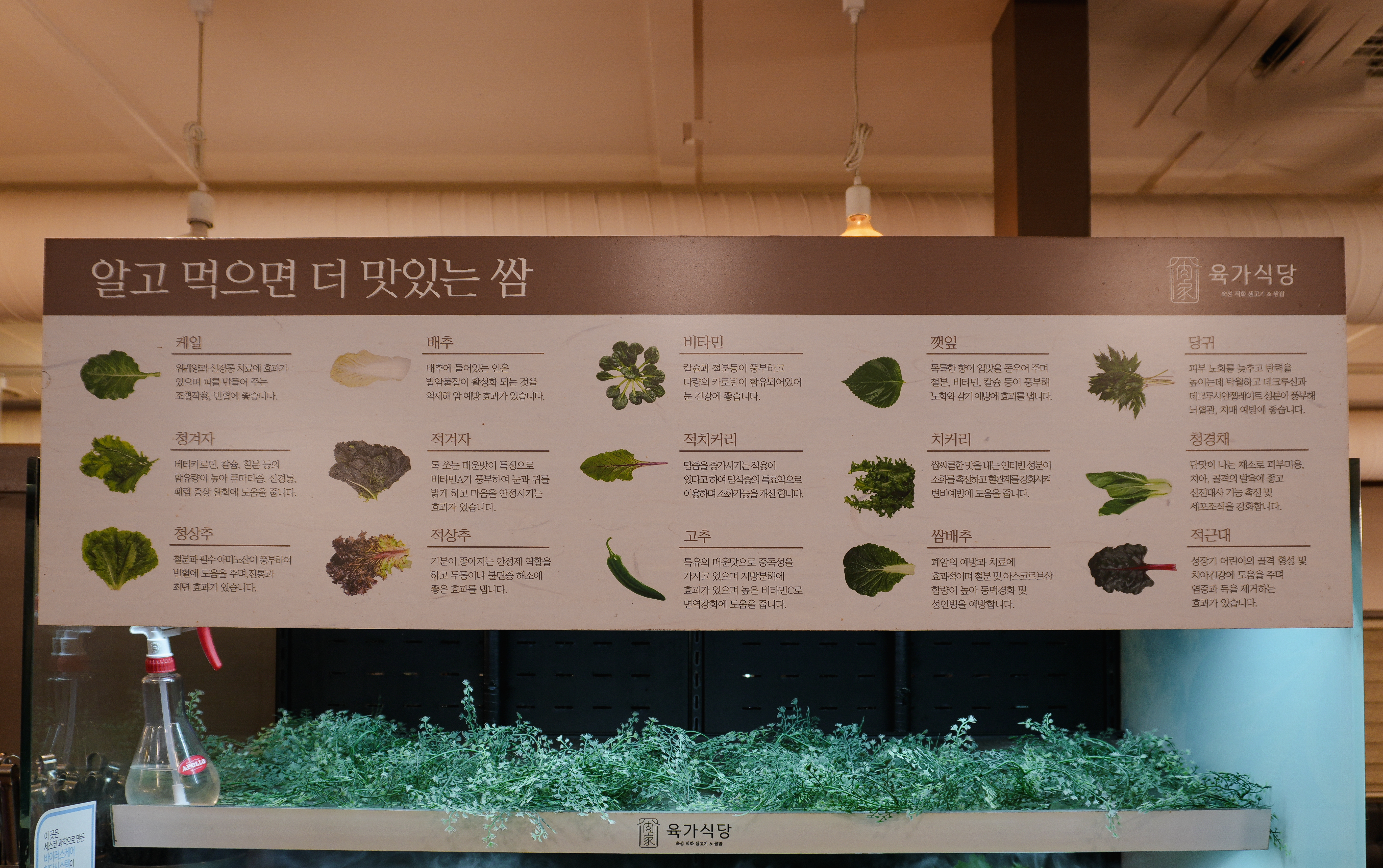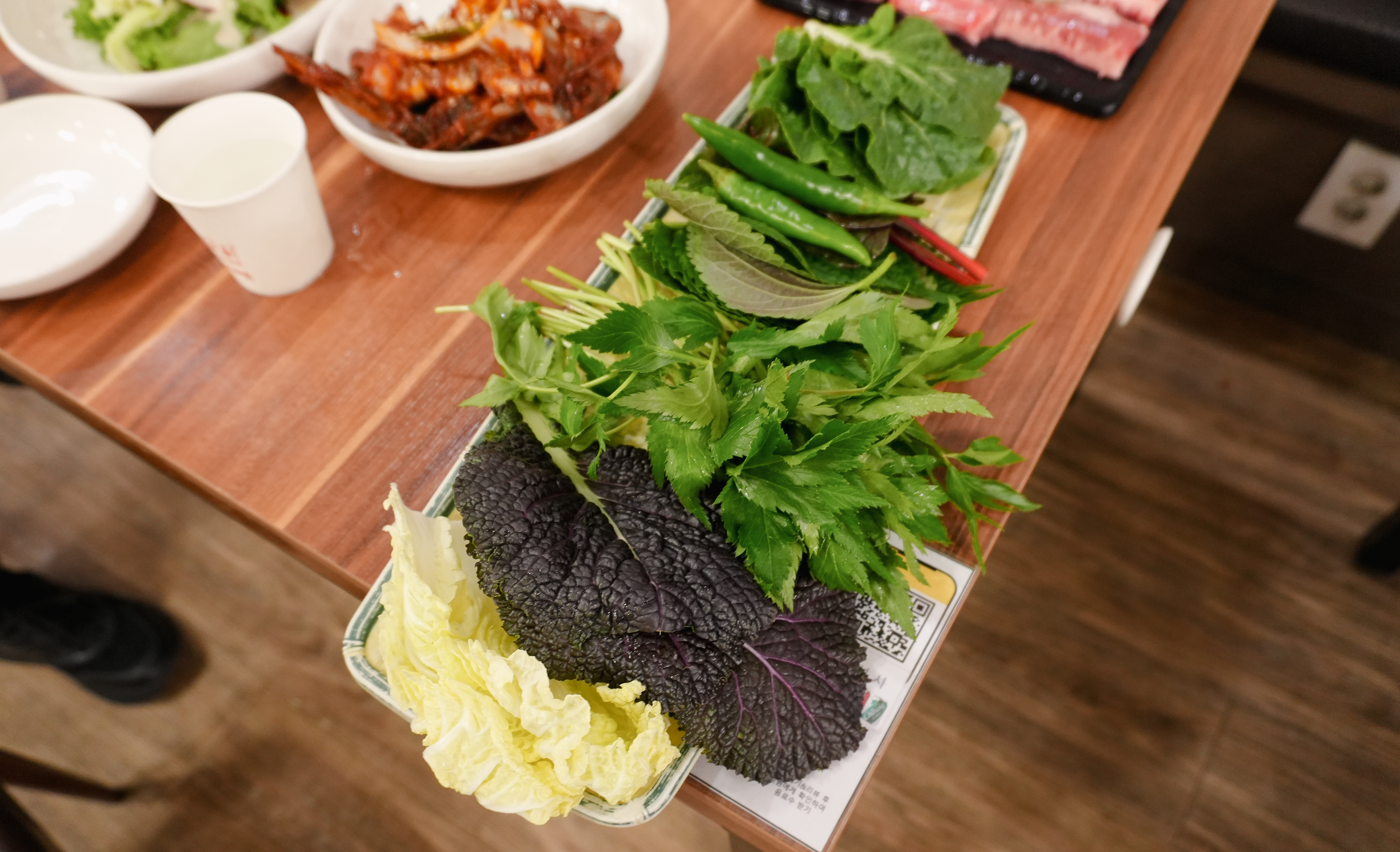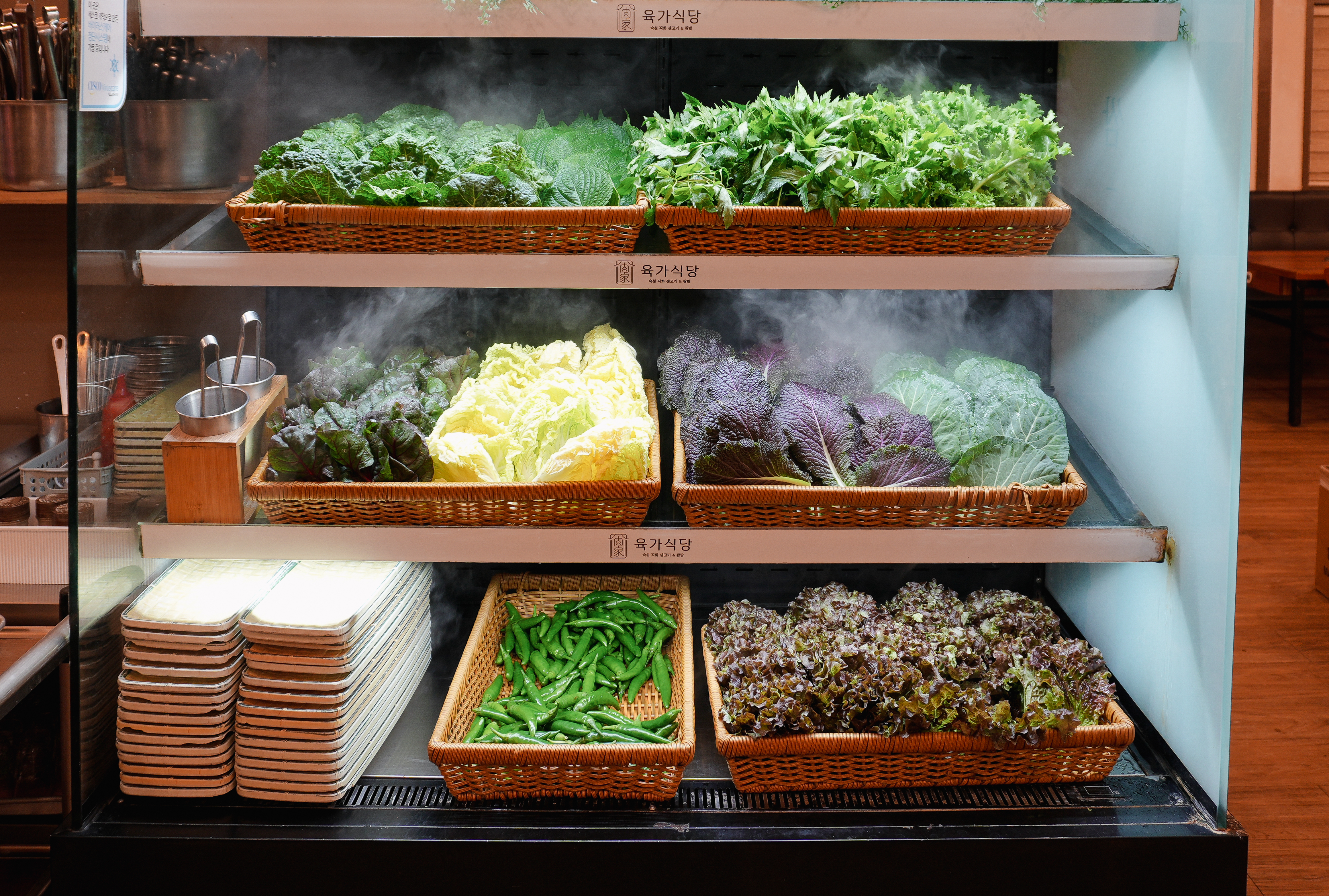 우선 육가식당은 쌈채소도 꽤 잘 준비되어 있는 편이었는데, 종류는 케일, 청겨자, 청상추, 배추, 적겨자, 적상추, 비타민, 적치커리, 고추, 깻잎, 치커리, 쌈배추, 당귀, 청경채, 적근대 등이 있었습니다. 셀프바 형태로 되어있어서 원하는 채소를 양껏 담아서 먹을 수 있다는 게 참 좋더라고요.