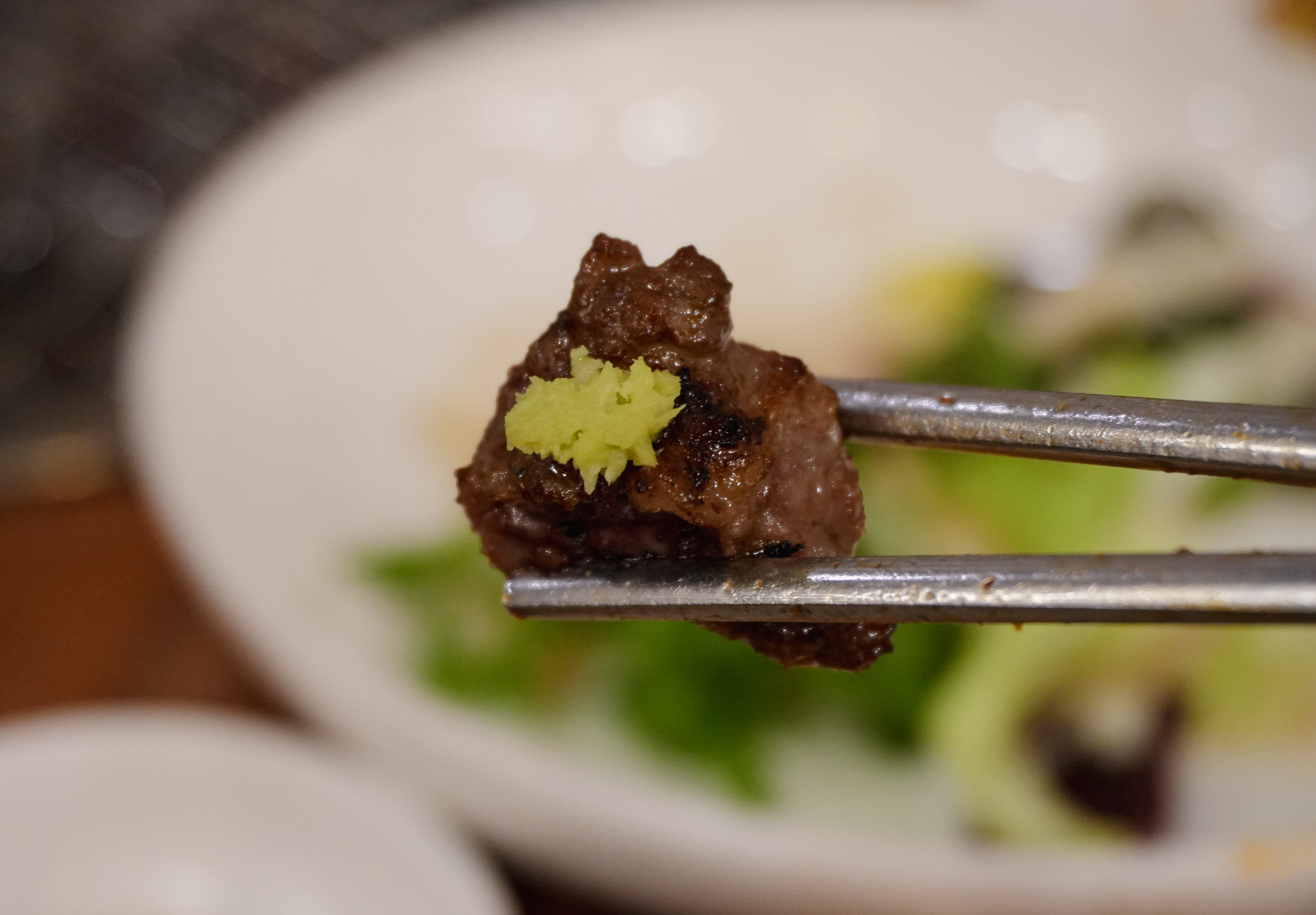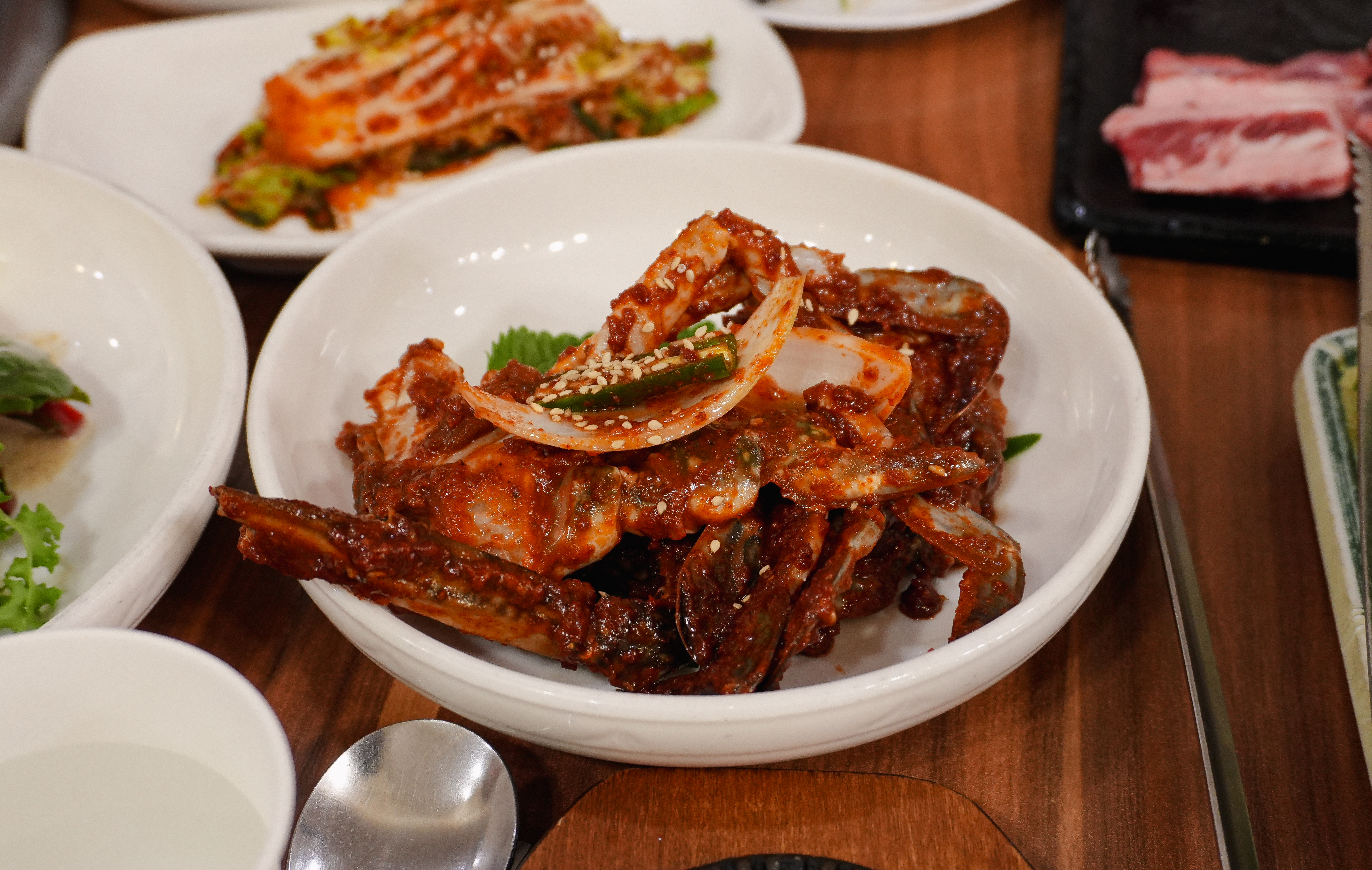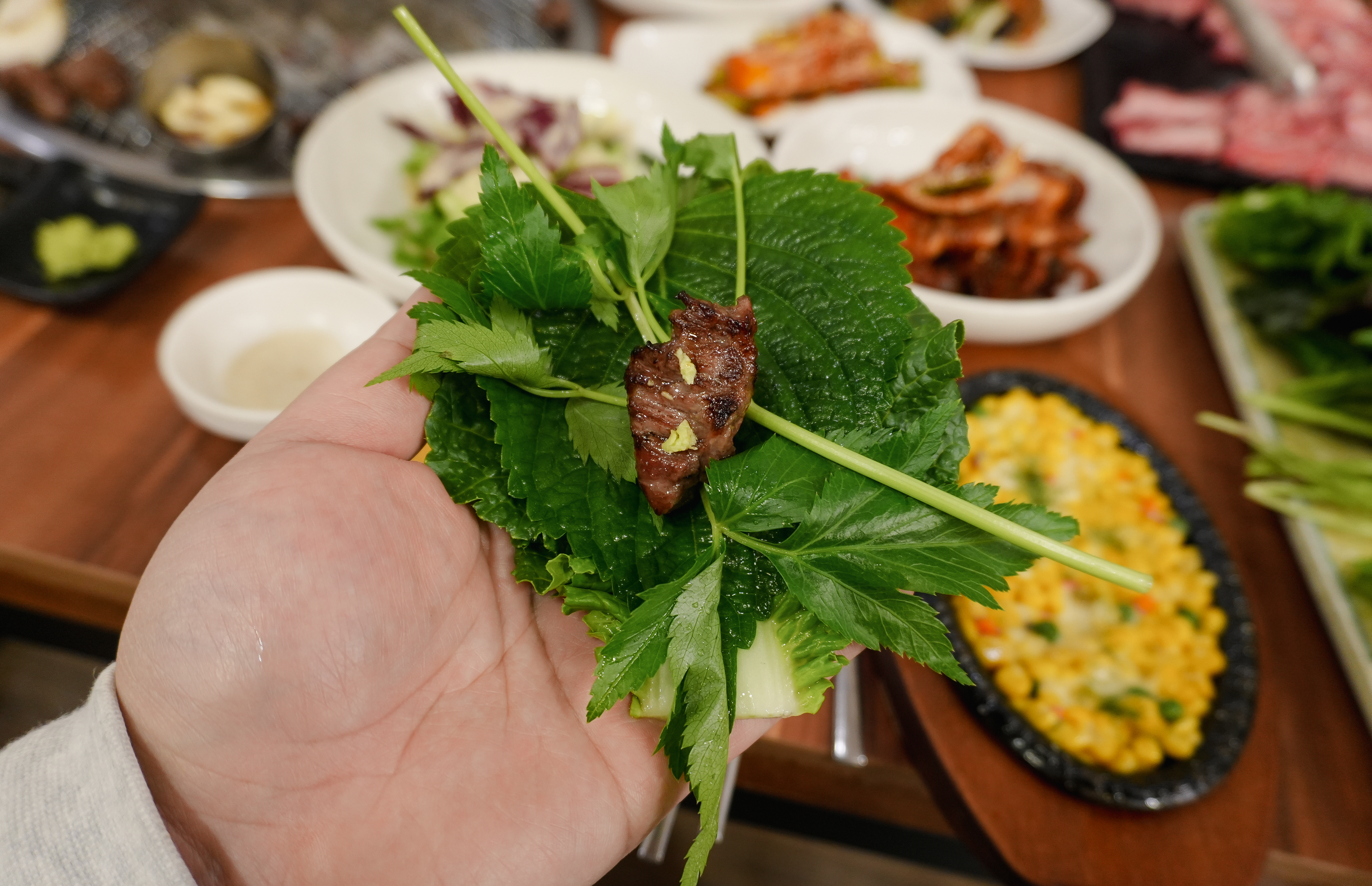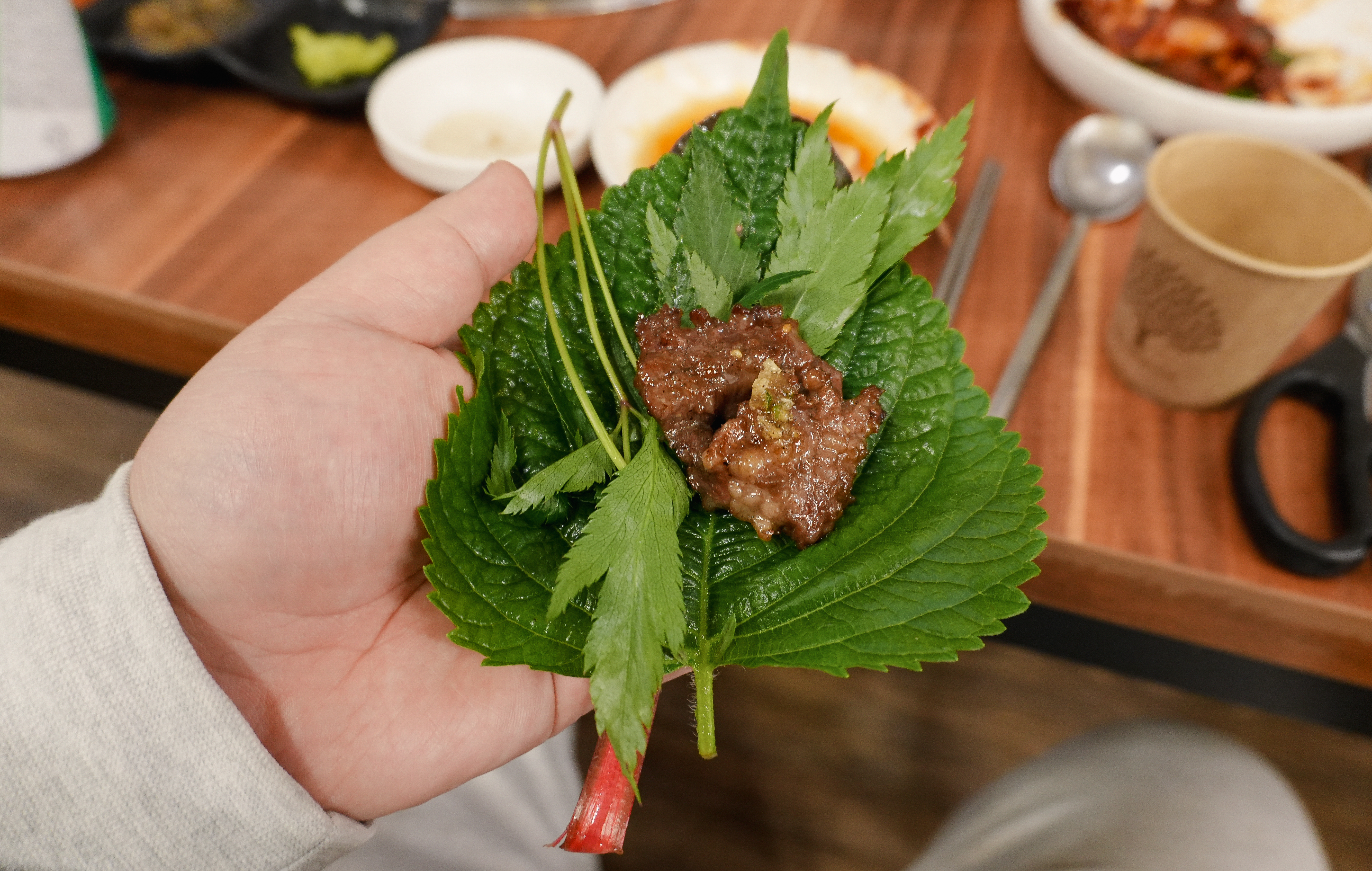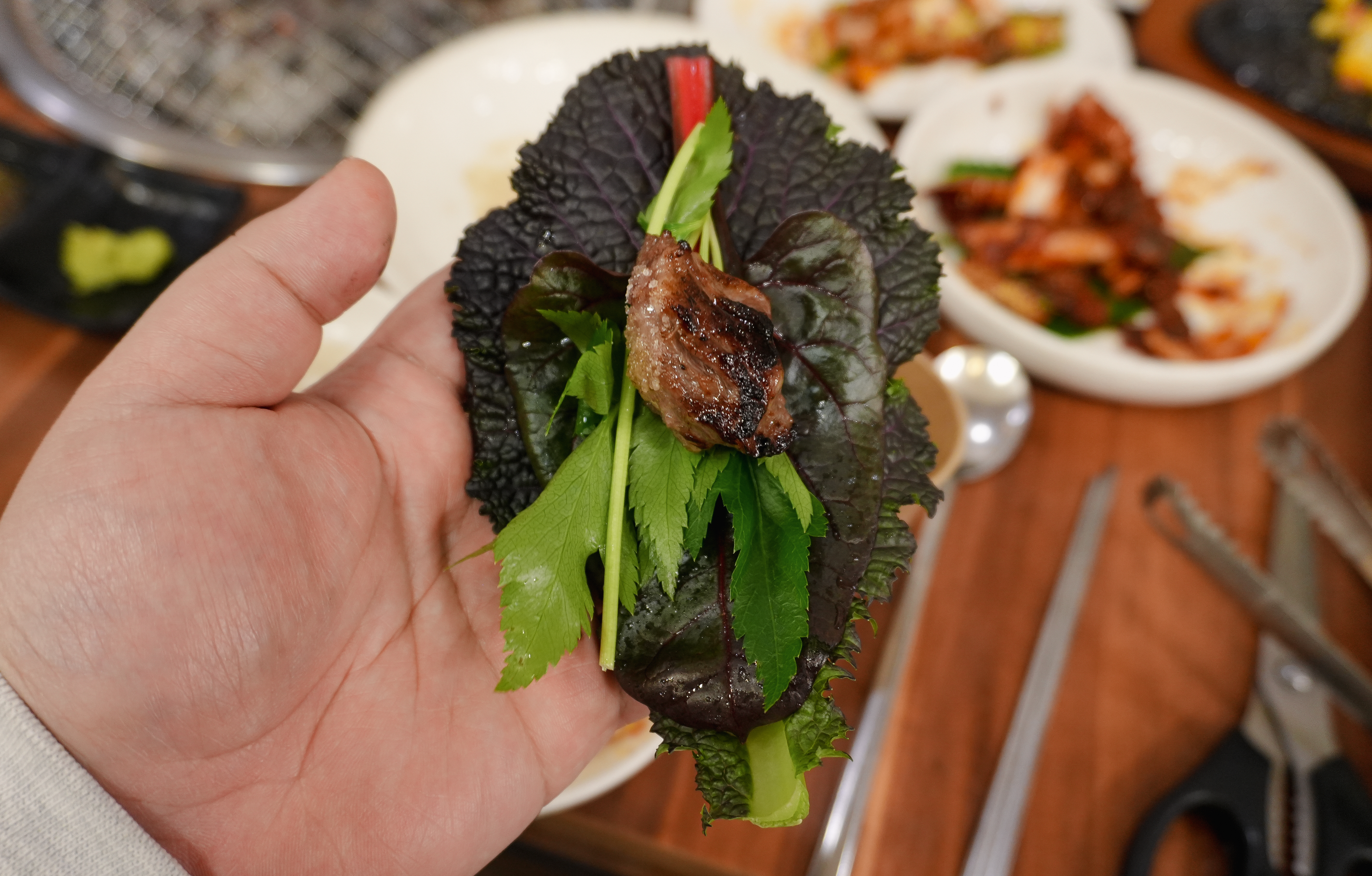 소갈비 한두 점에 쌈배추, 당귀, 적근대 등을 겹겹이 쌓아서 쌈을 싸 먹었는데, 저는 깻잎은 원래 좋아했지만 요즘 들어 당귀의 향이 참 좋더라고요. 주로 당귀랑 같이 쌈을 싸 먹었습니다. 어느 정도 생소갈비를 먹고 난 뒤 양념소갈비살도 추가해서 먹어보았습니다.