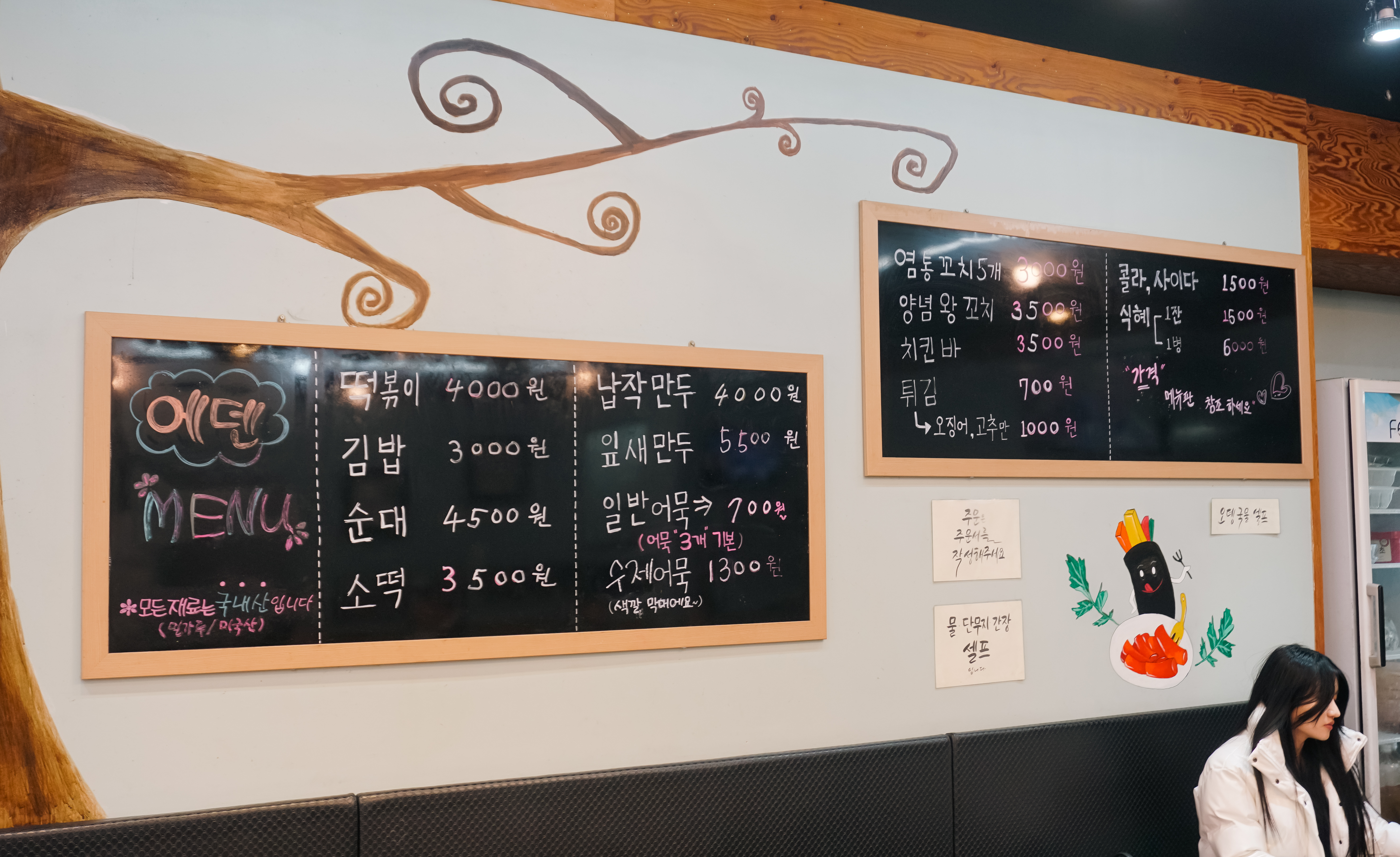 소문난에덴떡볶이는 대구 남구 봉덕동 954-20, 1층에 위치한 가게입니다. 봉덕신시장 바로 앞에 위치해 있어서 오며 가며 손님들이 많이 찾고 있는 가게였습니다. 영업시간은 09:30~04:30 까지로 새벽시간에도 먹을 수 있어서 밤낮 가리지 않고 방문할 수 있었습니다. 가게 앞에는 어묵부터 떡볶이, 튀김까지 온갖 분식들이 먹음직스럽게 진열되어 있었습니다.
