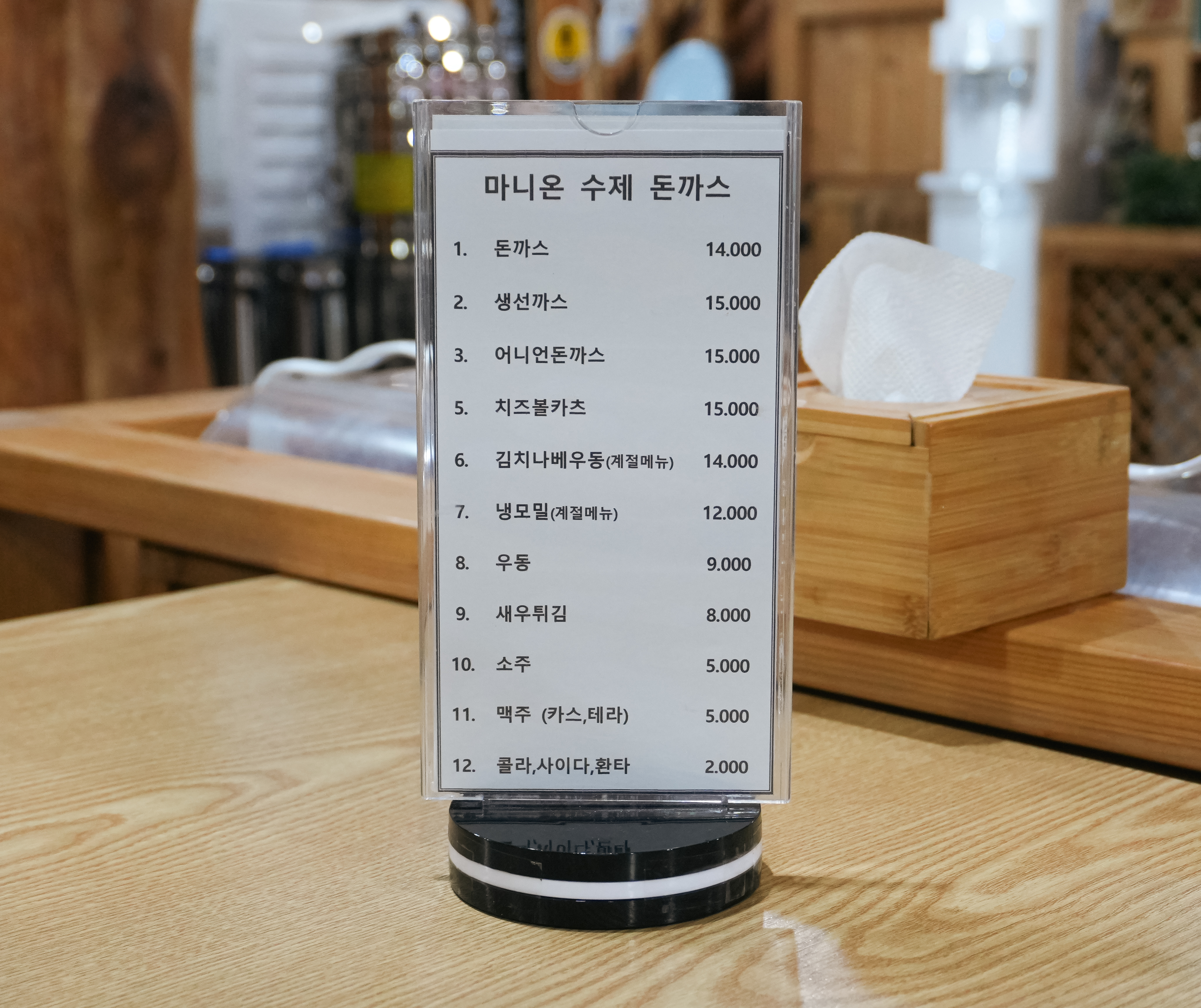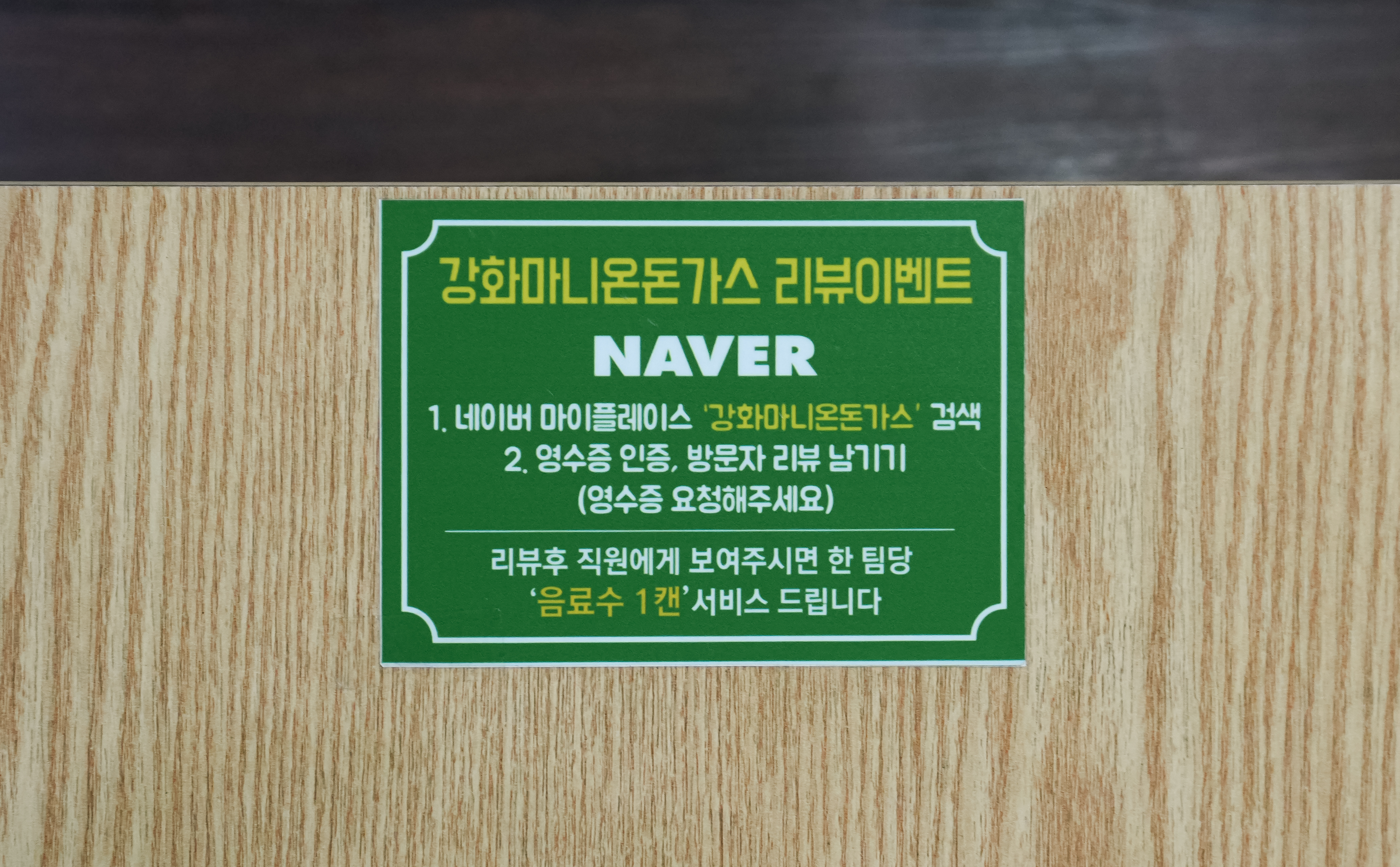 강화도 돈까스 마니온의 메뉴는 돈까스, 생선까스, 어니언돈까스, 치즈볼카츠, 김치나베우동, 냉모밀, 새우튀김 등이 있었습니다. 최근에 치즈볼카츠라는 메뉴가 추가된 것으로 보이며, 아무래도 다른 메뉴들이 다 맛있다보니 새로운 메뉴인 치즈볼카츠에도 흥미가 생기더라고요. 참고로, 요즘 리뷰이벤트를 하고 있어서 영수증, 방문자리뷰를 남길경우 음료수를 서비스로 주신다고 합니다.