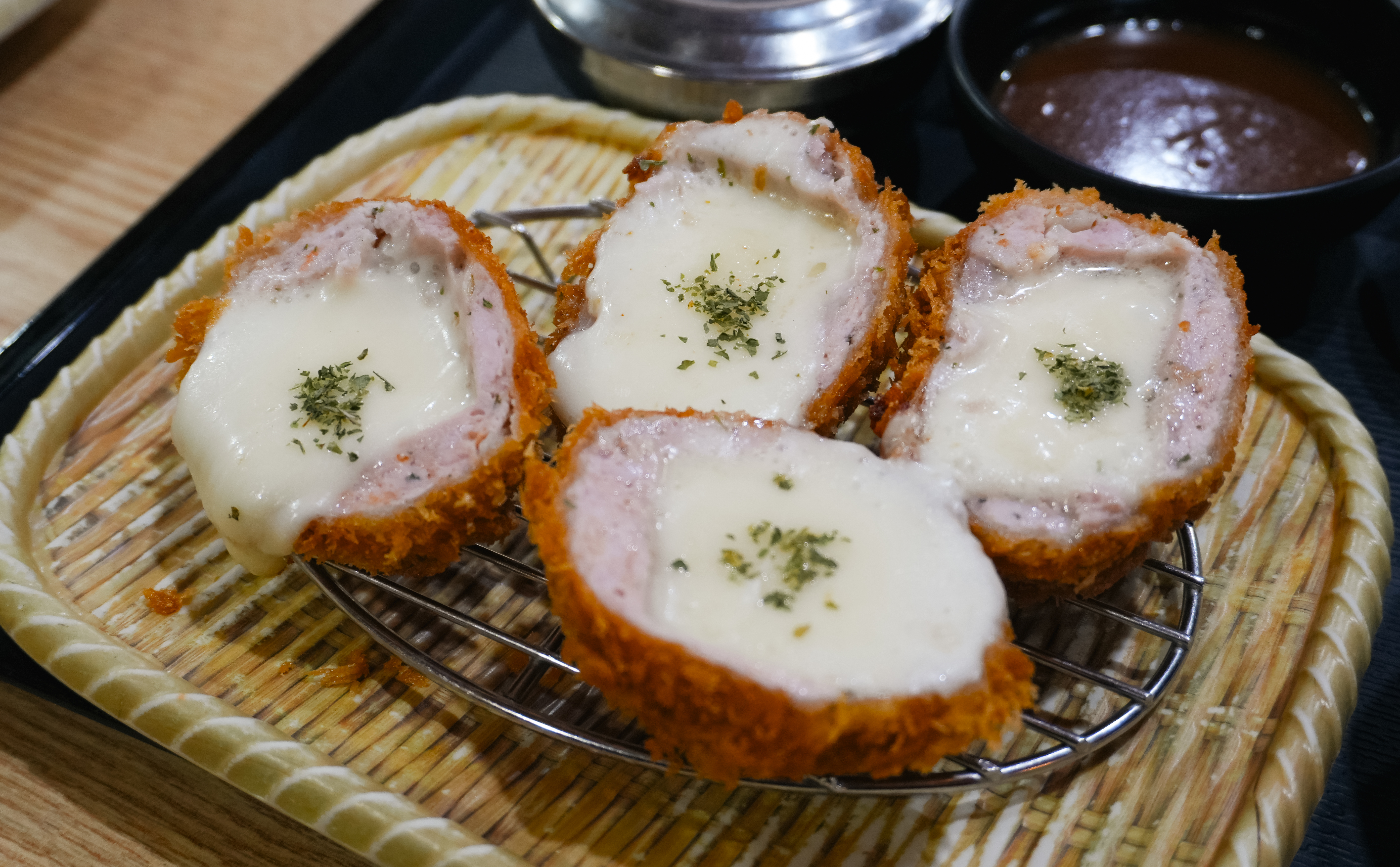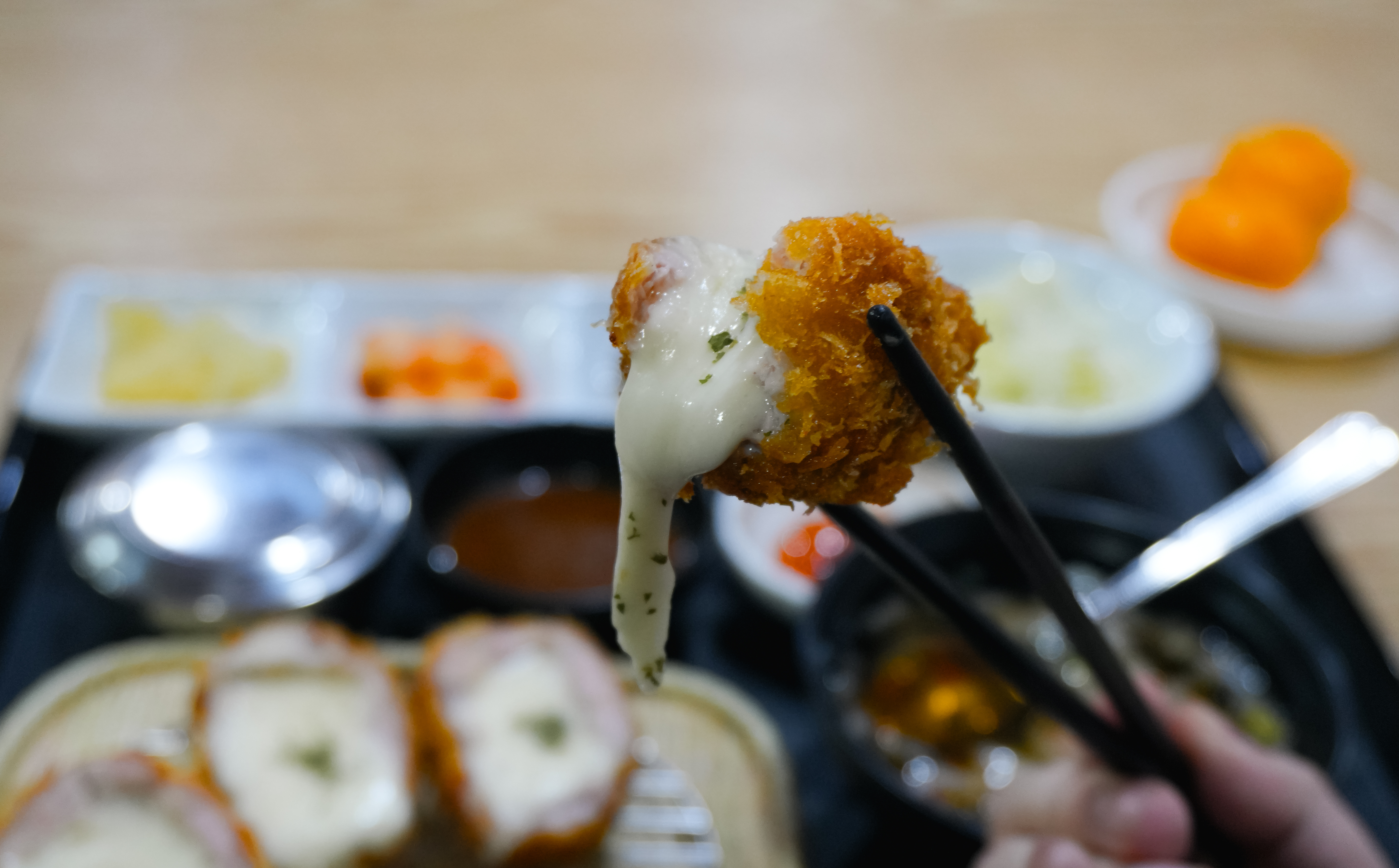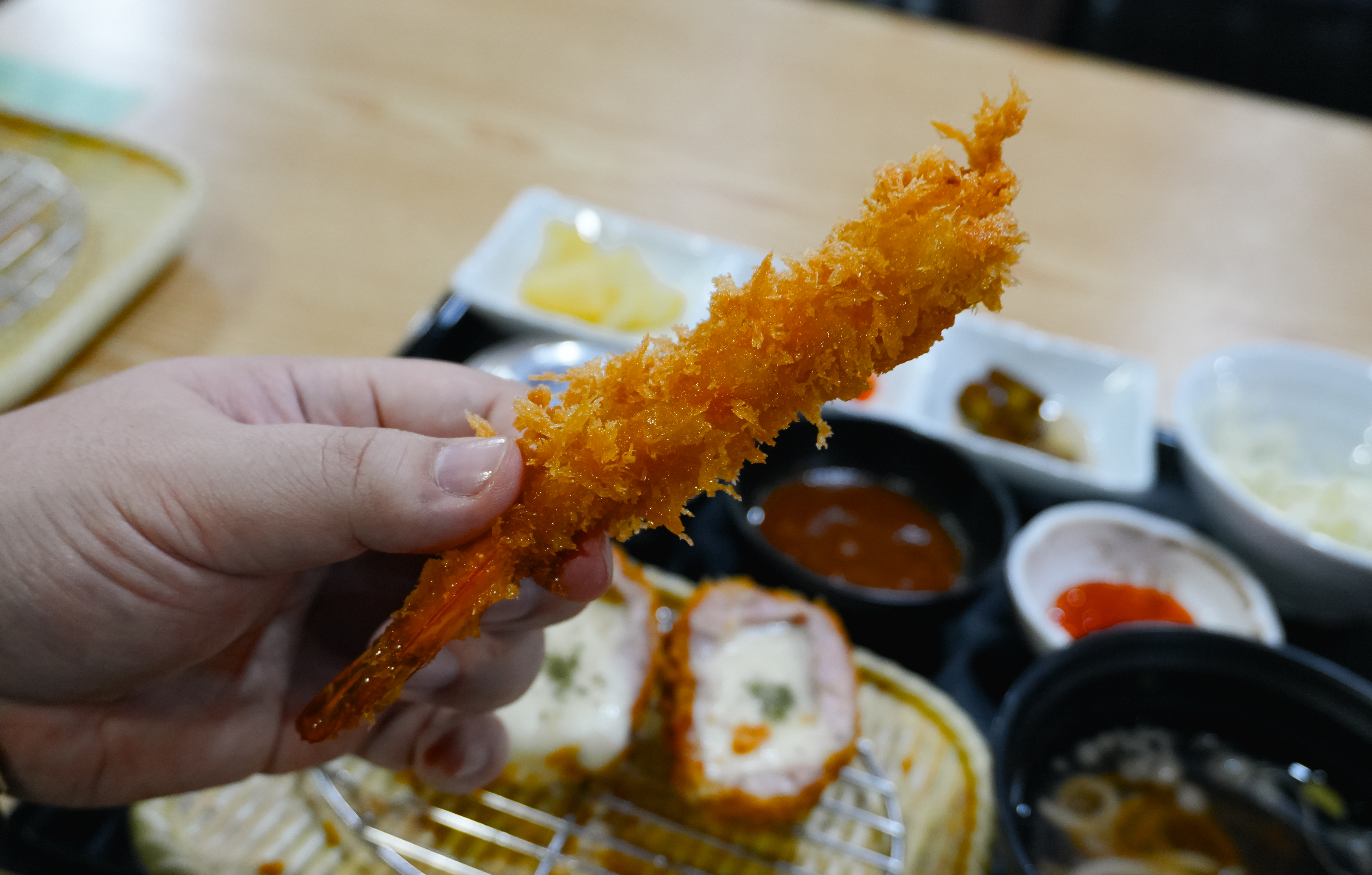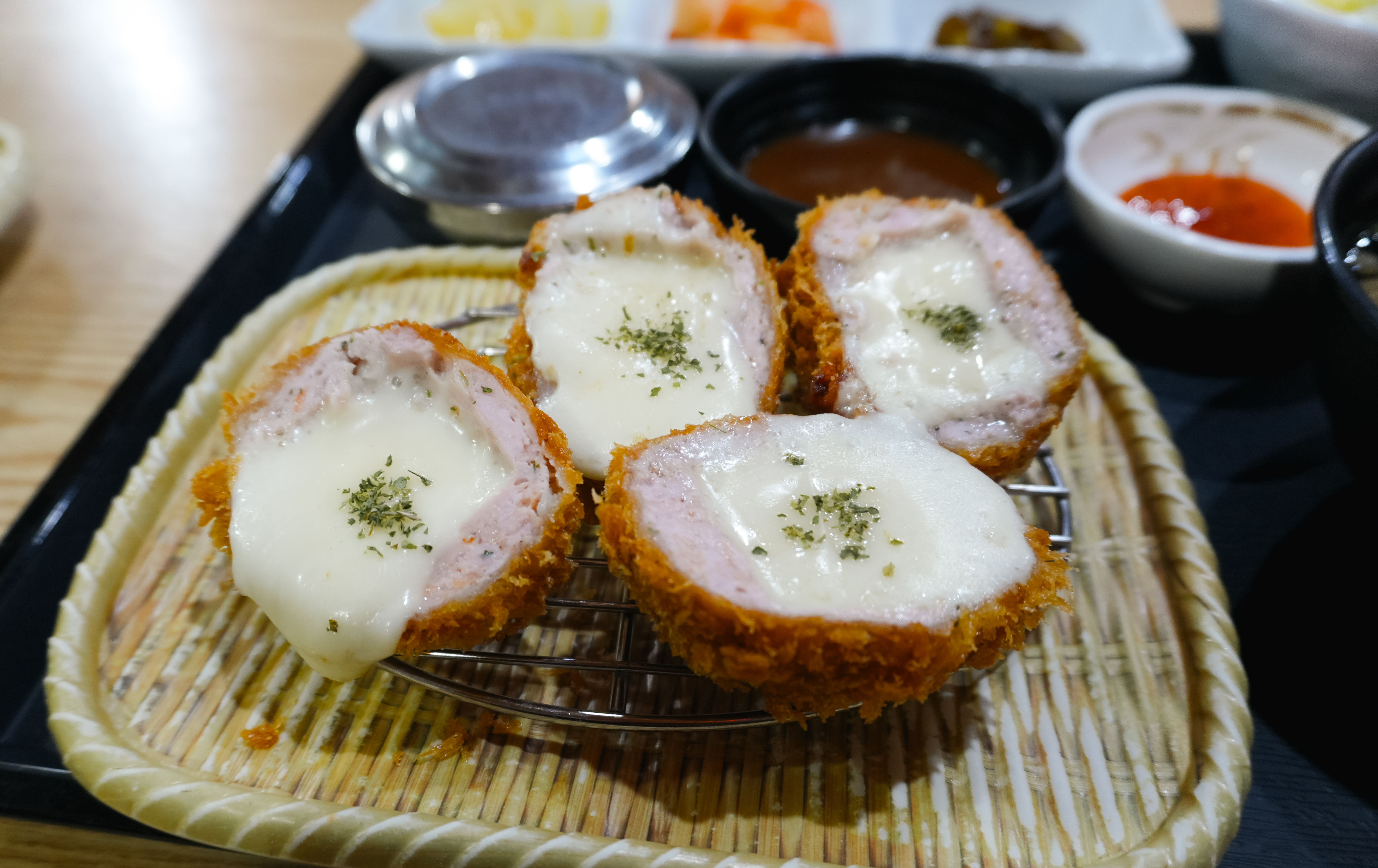 마니온 치즈볼카츠와 우동, 반찬, 새우튀김의 모습입니다. 여기에 작은 공기밥이 하나 더 나오는데, 생각보다 양이 많았고 메뉴들도 다 맛깔스럽게 나와 더 맛있었던 것 같습니다. 우선 메인 메뉴인 치즈볼카츠부터 자세히 살펴보겠습니다.