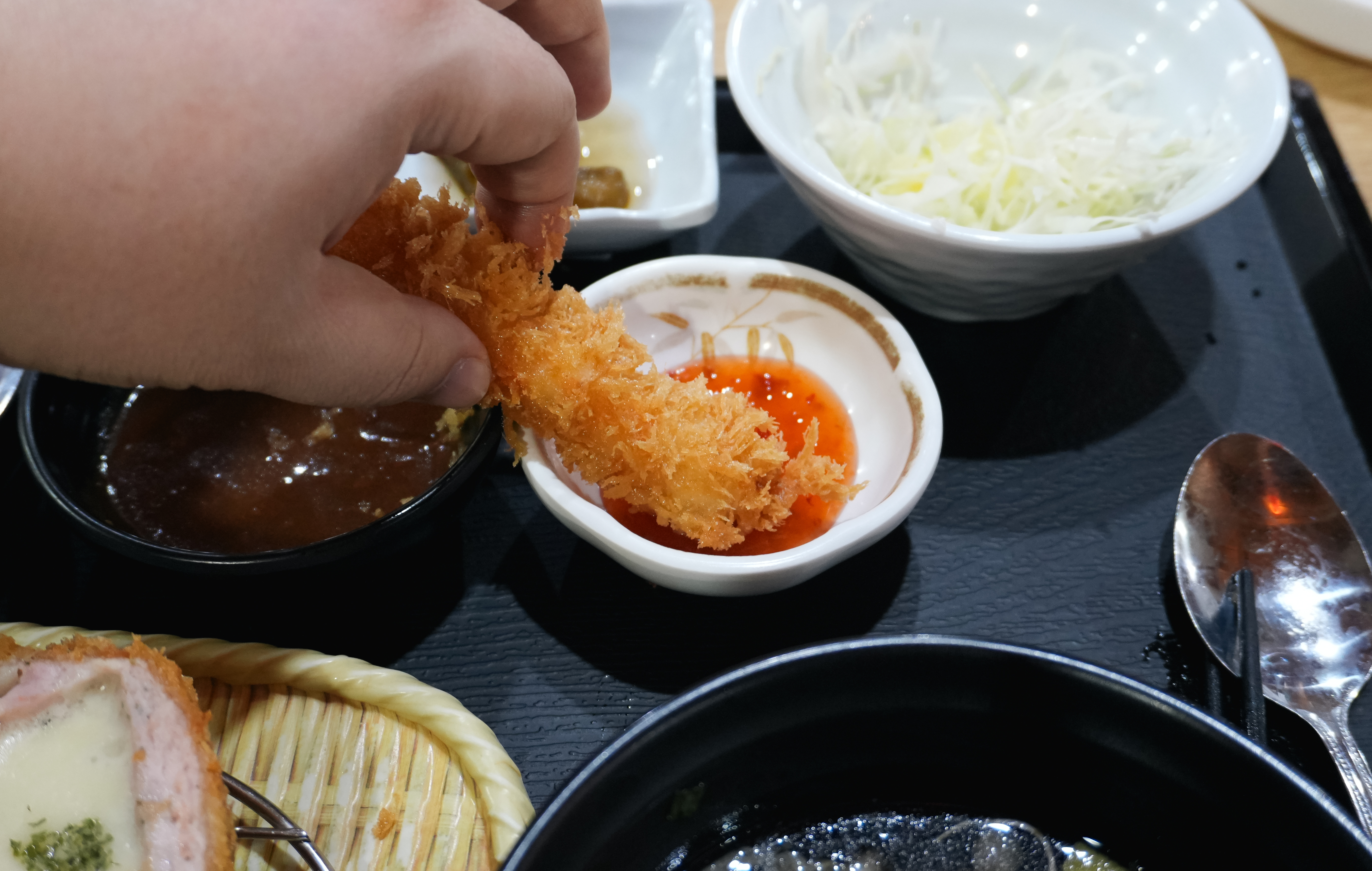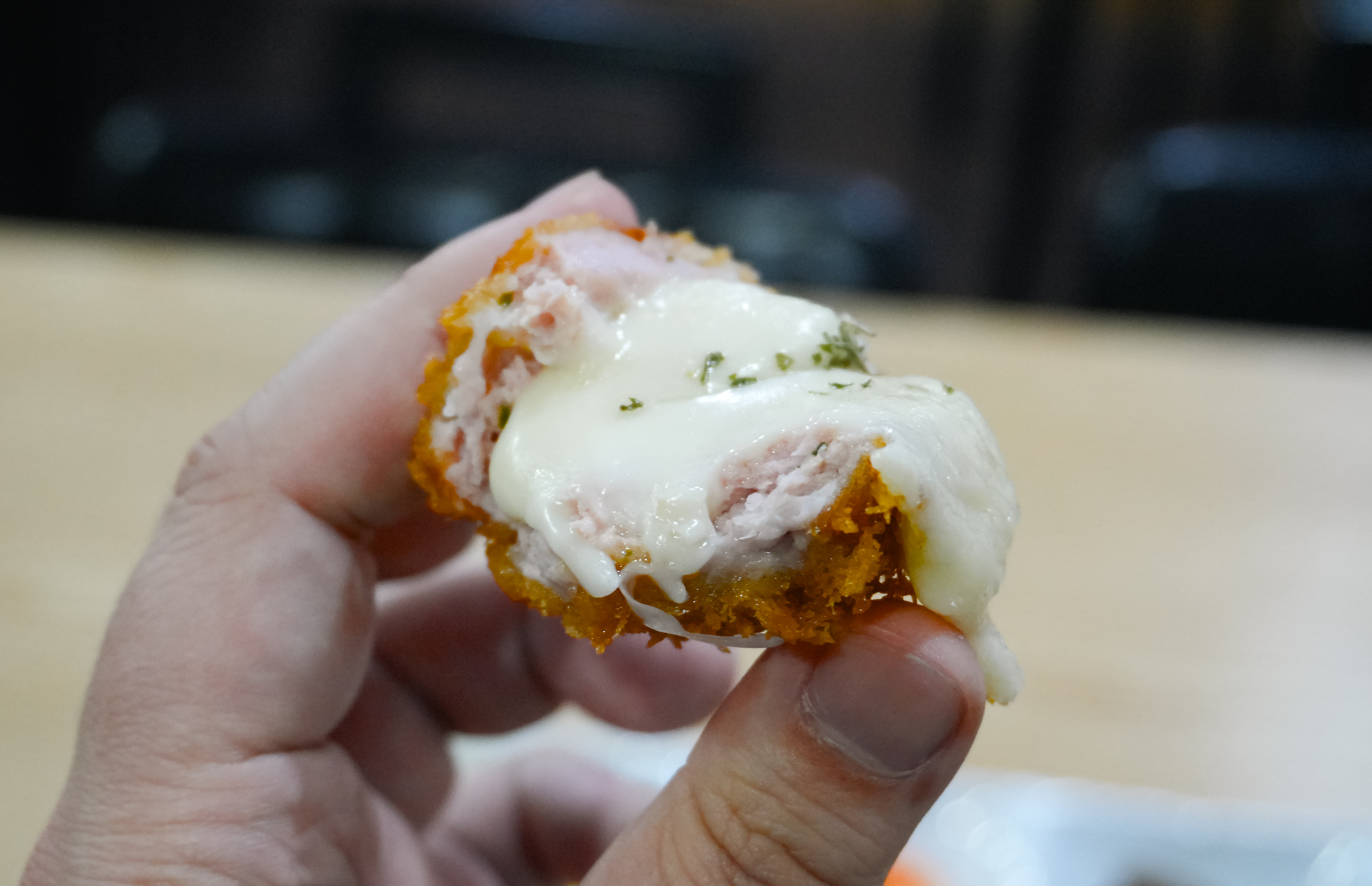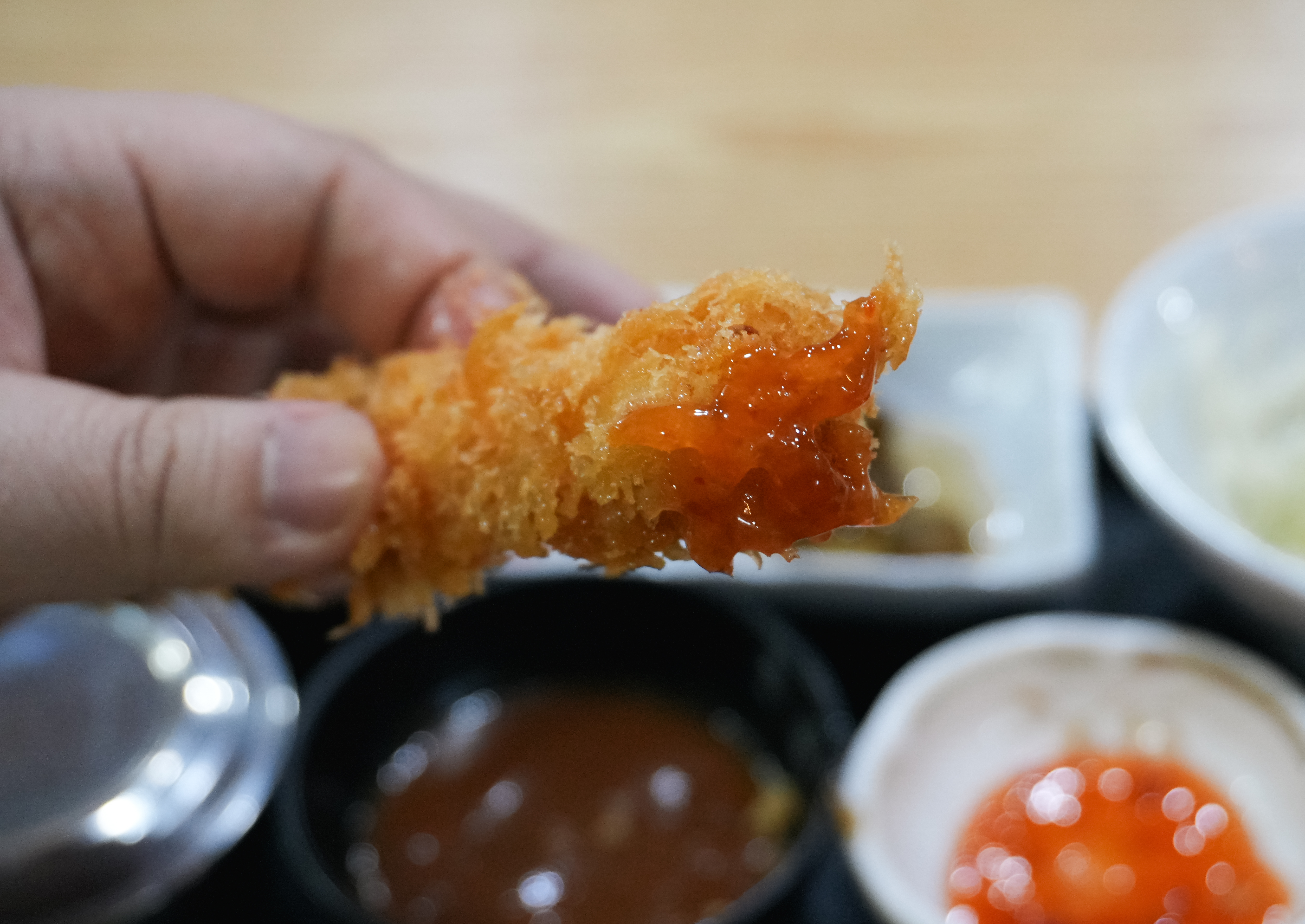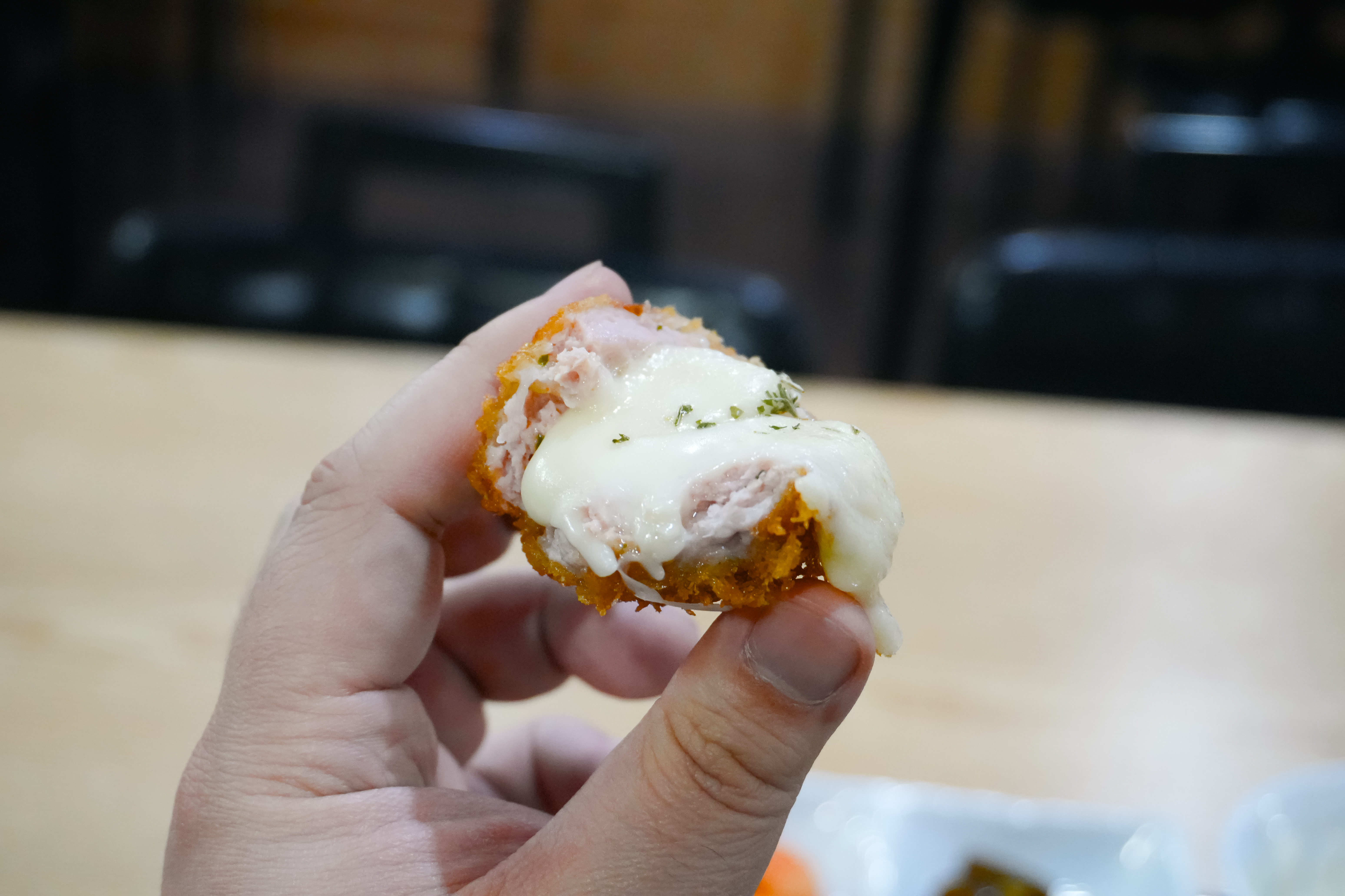마니온 치즈볼카츠와 우동, 반찬, 새우튀김의 모습입니다. 여기에 작은 공기밥이 하나 더 나오는데, 생각보다 양이 많았고 메뉴들도 다 맛깔스럽게 나와 더 맛있었던 것 같습니다. 우선 메인 메뉴인 치즈볼카츠부터 자세히 살펴보겠습니다.