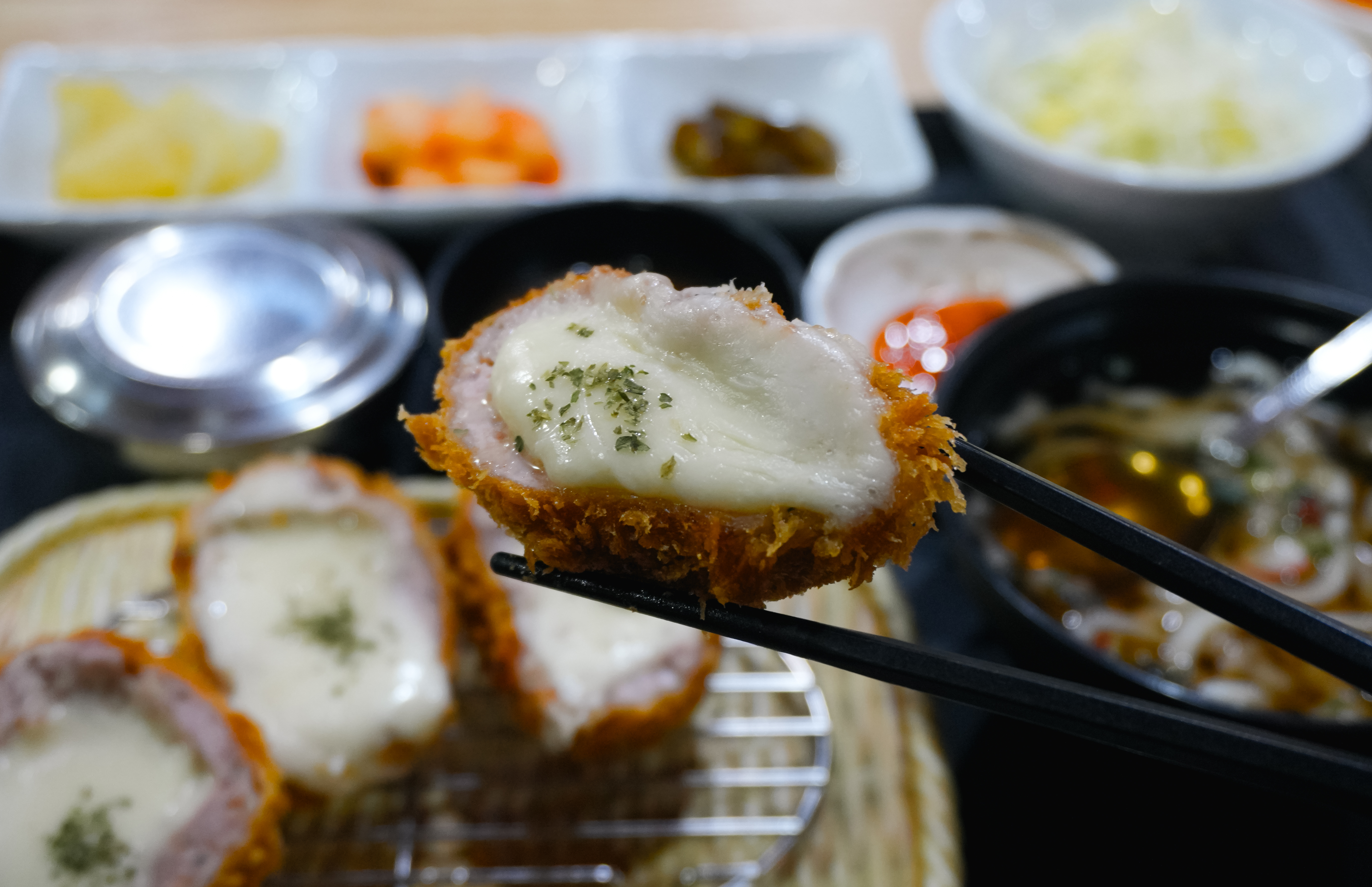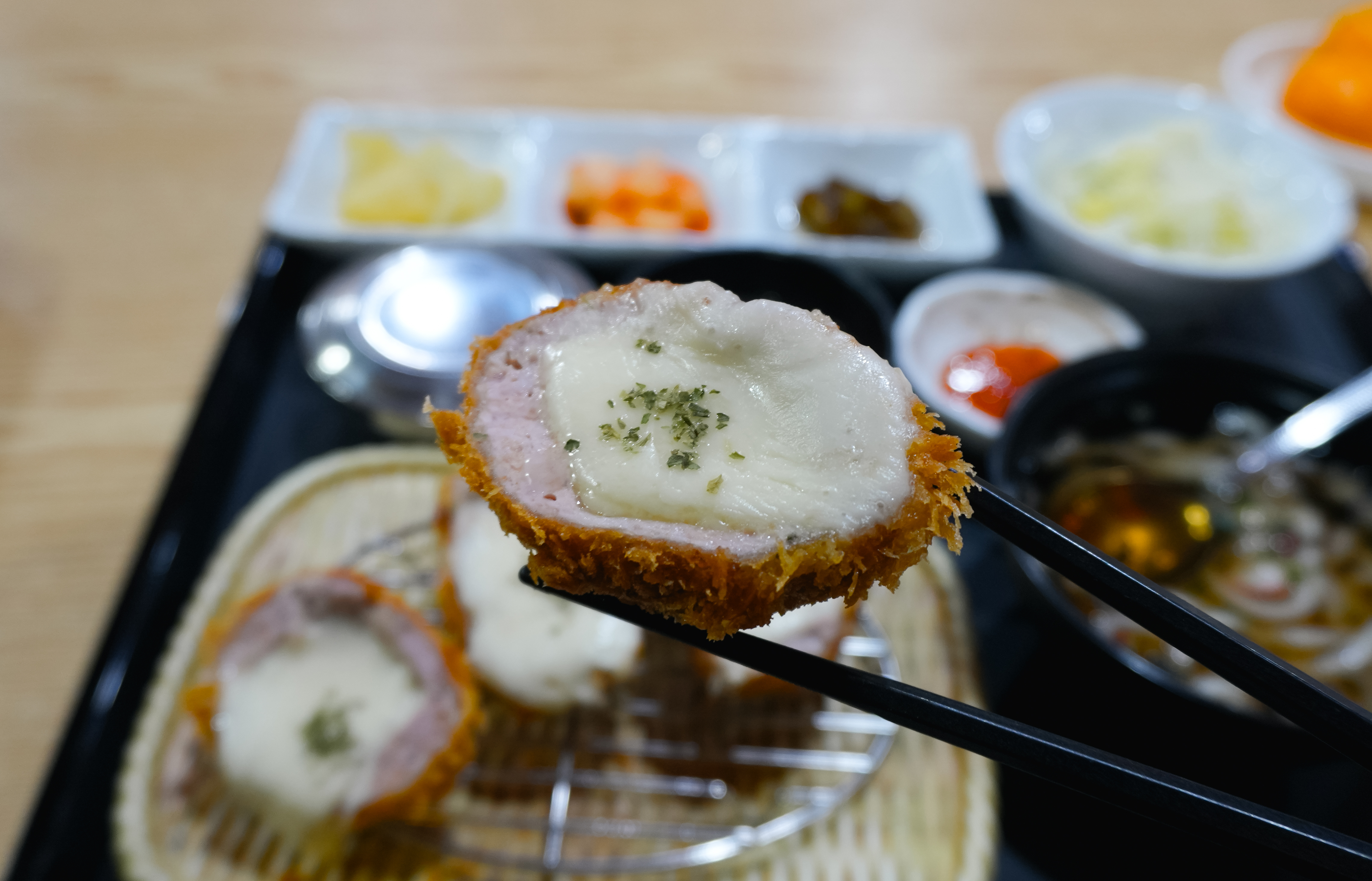 치즈볼카츠는 그릇처럼 움푹 파인 모습의 돈까스인데, 버섯을 비롯해 각종 채소들을 넣어 식감도 부드러웠고, 향도 좋았습니다. 특히 쭉 늘어나는 치즈가 일품이었는데, 아이들이 참 좋아할 것 같더라고요. 일반적인 돈까스의 고기 식감보다는 부드러운 떡갈비(?)와 비슷한 느낌이었습니다.