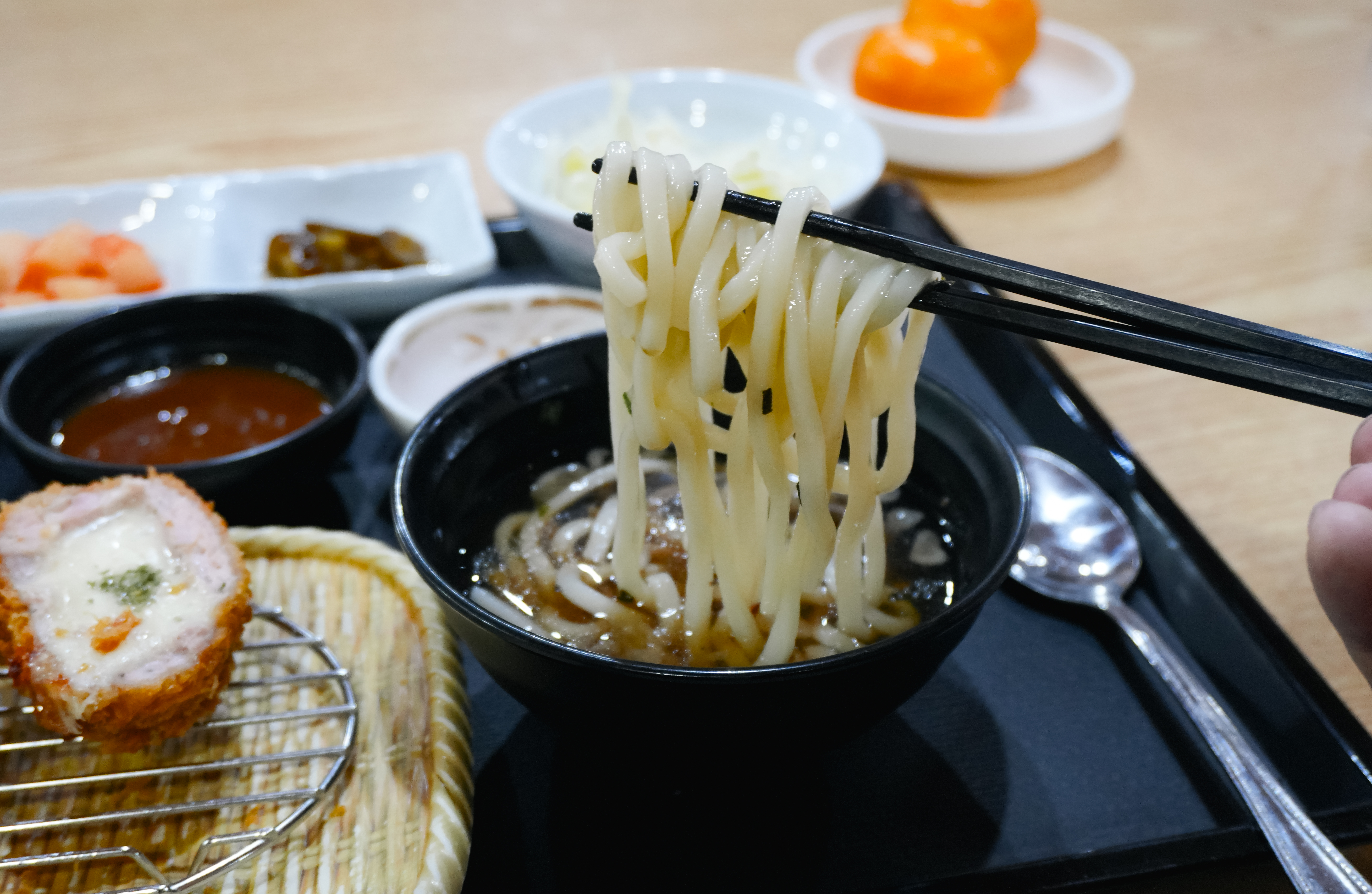 곧이어 주문한 마니온의 치즈볼카츠가 나왔습니다. 치즈볼카츠는 우동이 같이 나오는 정식 형태로 제공되었는데, 여전히 반찬들도 깔끔하고 먹음직스러웠고, 특히 유자로 맛을 낸 단무지도 정말 맛있었습니다.