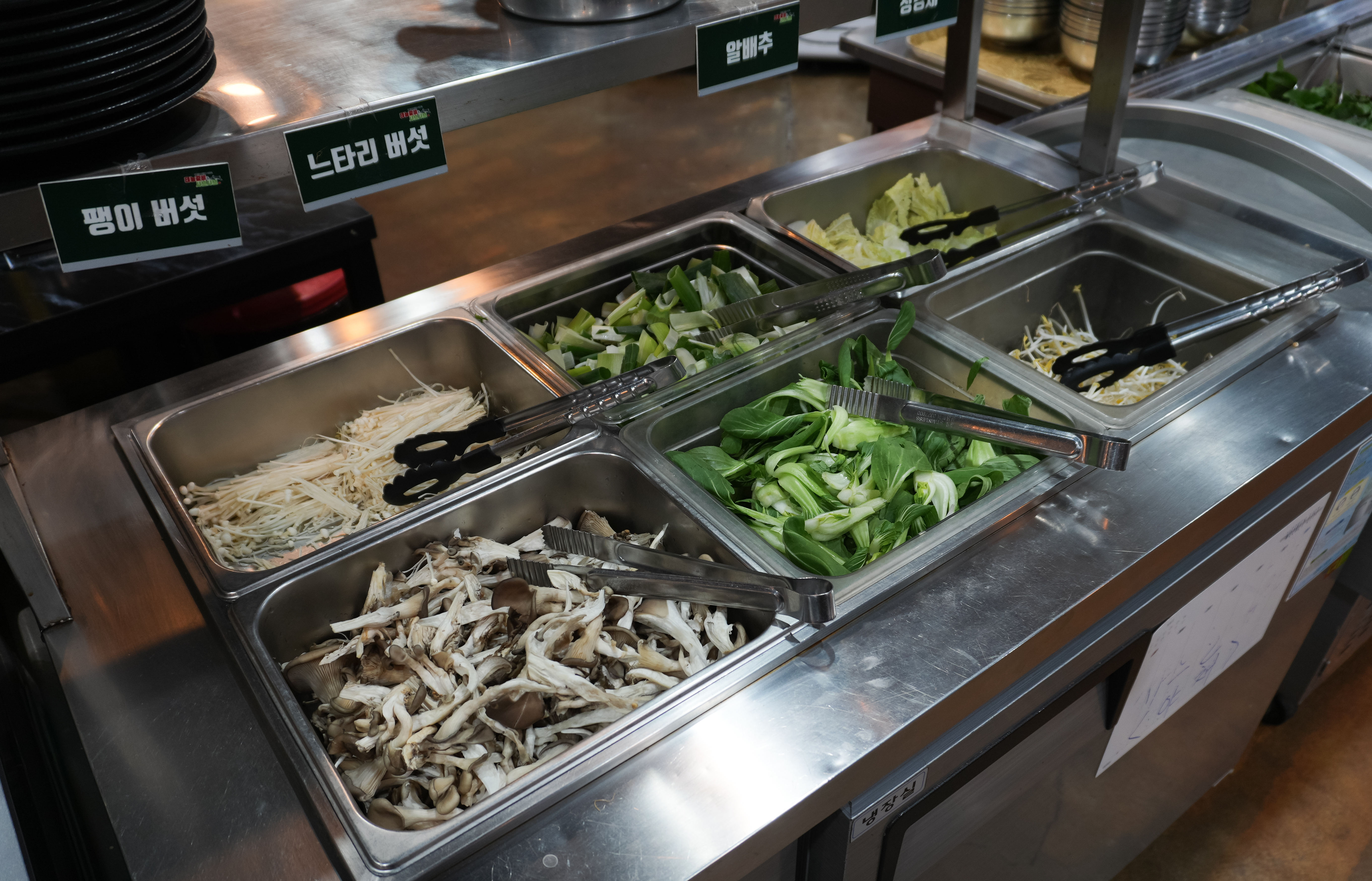 셀프바는 고기뷔페를 이용하는 손님들을 위한 갈매기살, 돼지갈비, 삼겹살, 껍데기, 소시지 등을 구울 수 있도록 하고 있었고, 팽이버섯, 느타리버섯, 청경채, 배추 등 샤브샤브를 위한 재료들도 있었습니다.