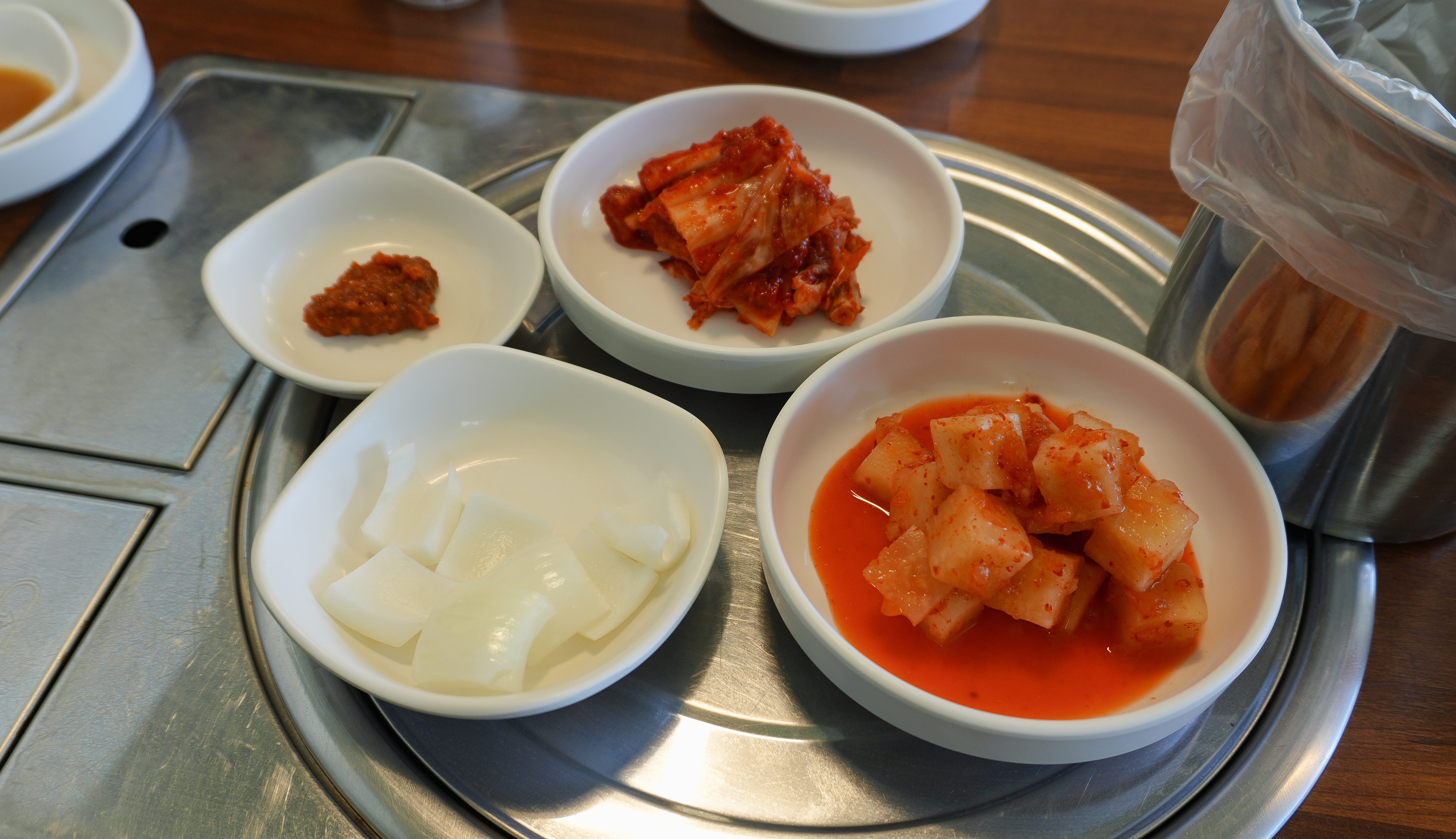 이천 장가네감자탕의 뼈해장국은 배추김치, 무김치, 양파가 함께 제공되었습니다. 겉보기에는 뼈해장국의 특별한 점은 드러나지 않는데요, 내용물을 보시면 특이한 점을 확인할 수 있었습니다.