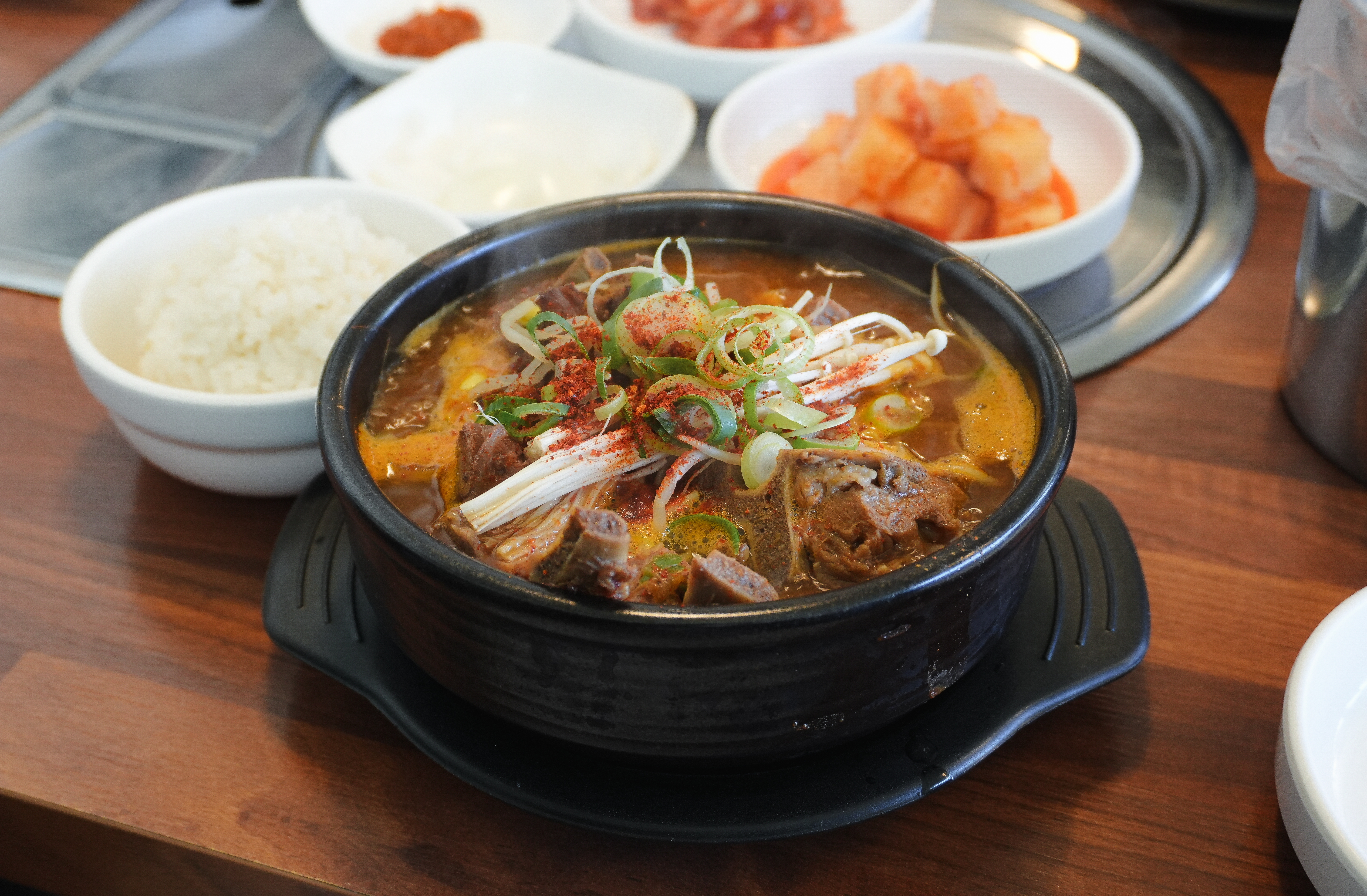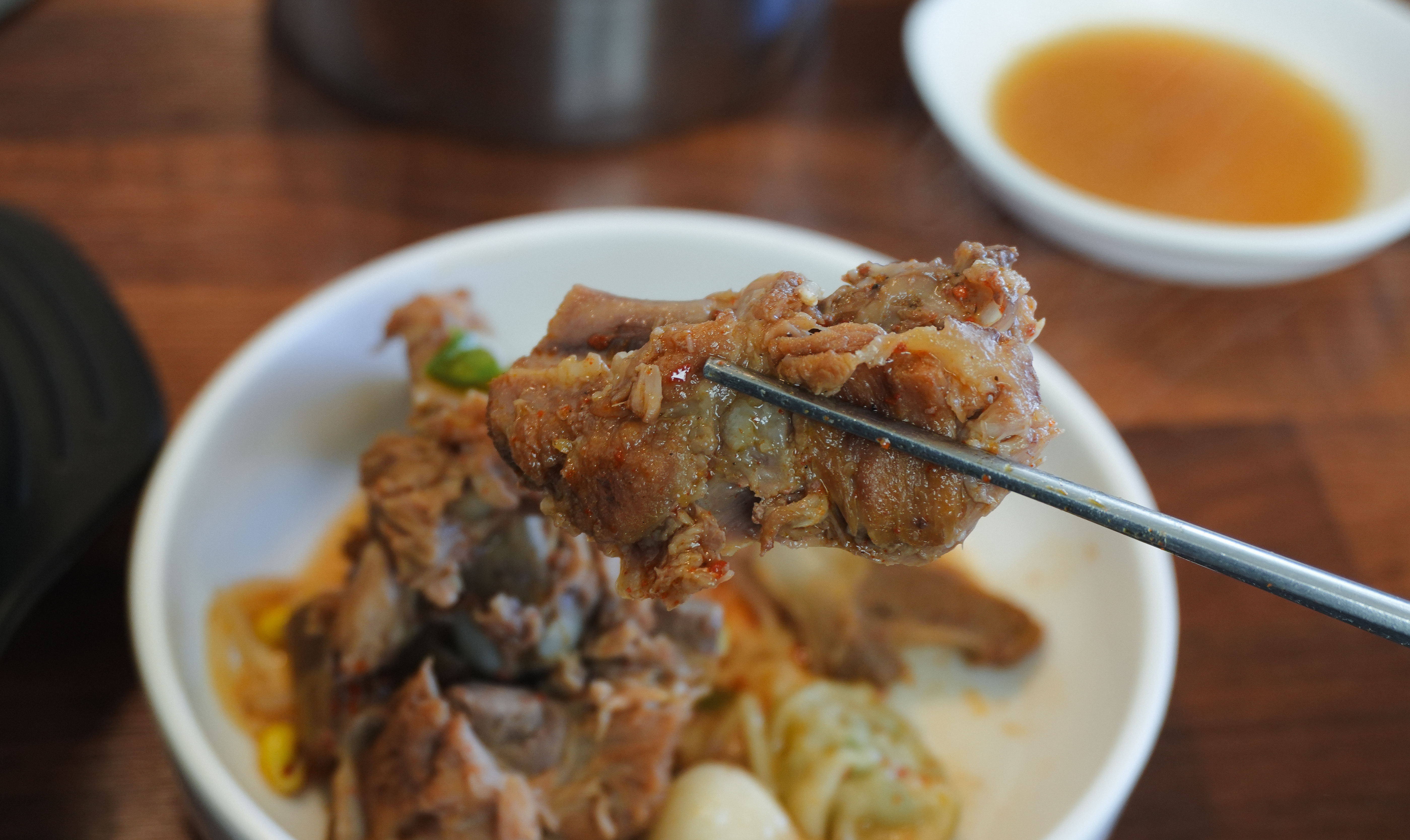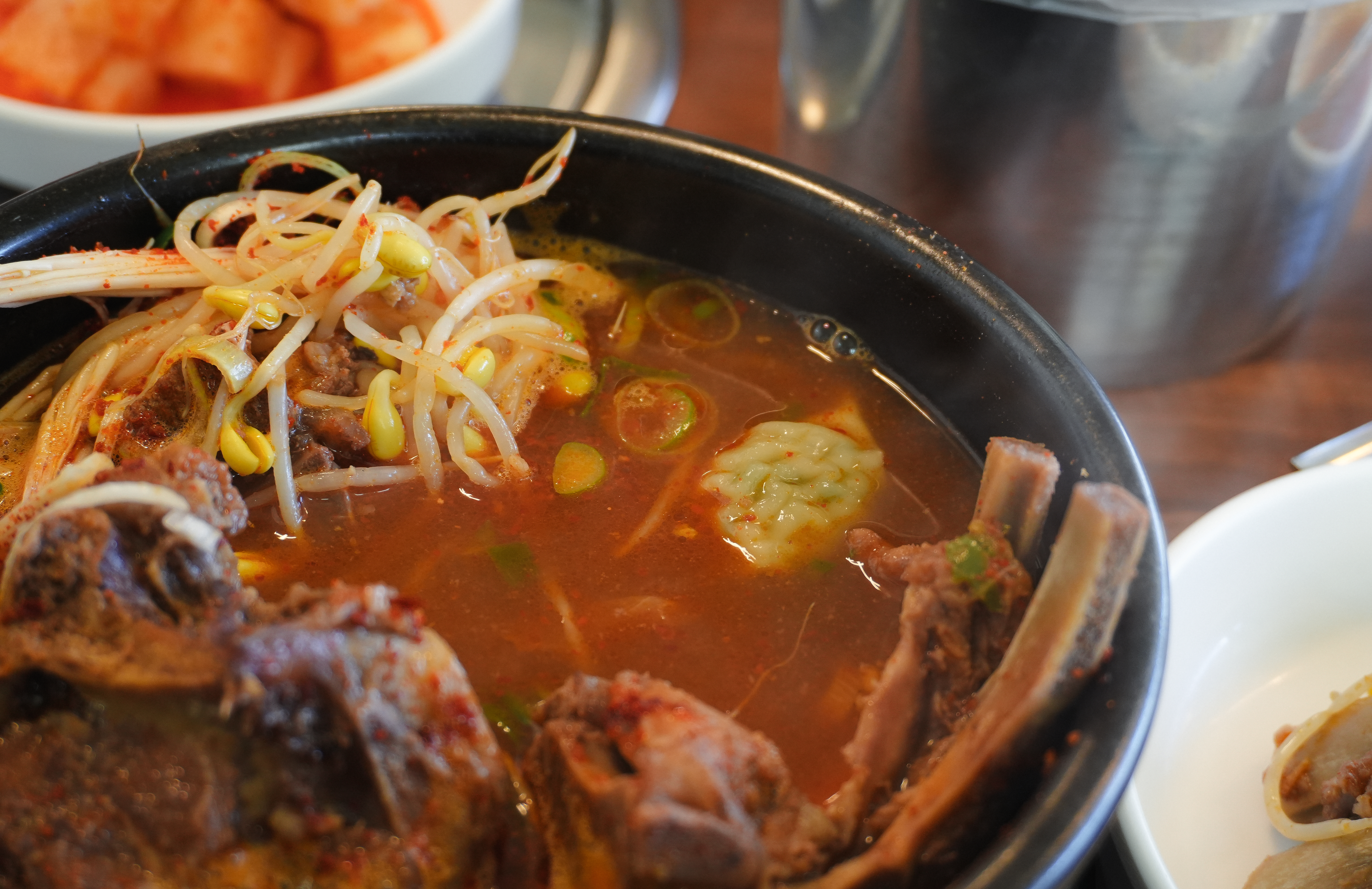 장가네감자탕은 특이하게도 뼈해장국에 콩나물과 조랭이떡, 만두가 들어있었는데요, 뼈해장국 맛 자체는 딱히 나쁘지는 않았는데, 콩나물에 조랭이떡에 만두까지 뭔가 조화롭지는 않다는 생각이 들었습니다. 그래도 뭔가 이것저것 들어있으니깐 다채로운 느낌은 있었습니다.