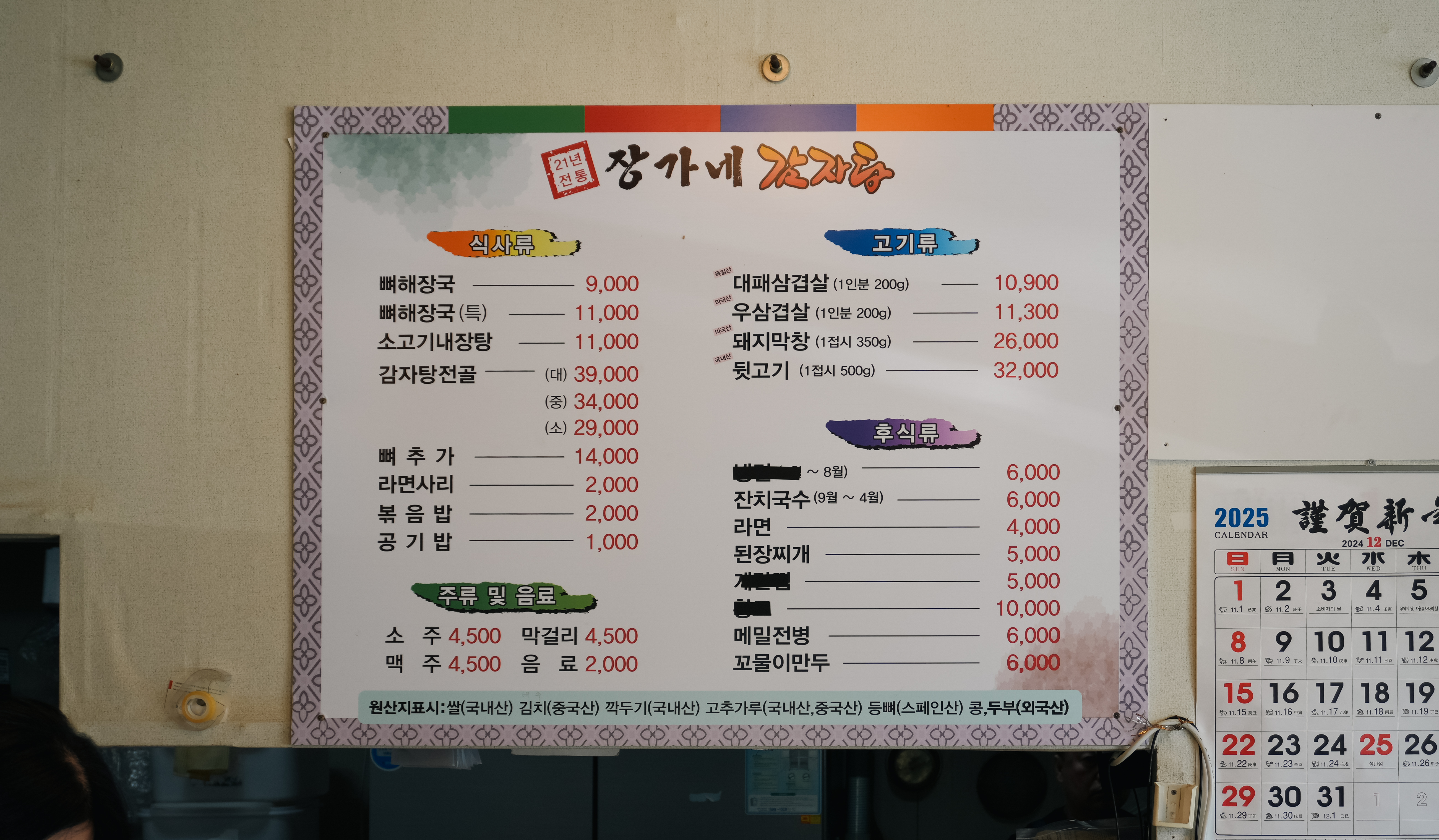 장가네감자탕 뼈해장국, 소고기내장탕, 감자탕전골, 대패삼겹살, 우삼겹살, 돼지막창, 뒷고기, 잔치국수, 라면, 된장찌개, 메밀전병, 꼬물이만두 등이 있었습니다. 저희는 점심으로 뼈해장국을 주문해서 먹었습니다.