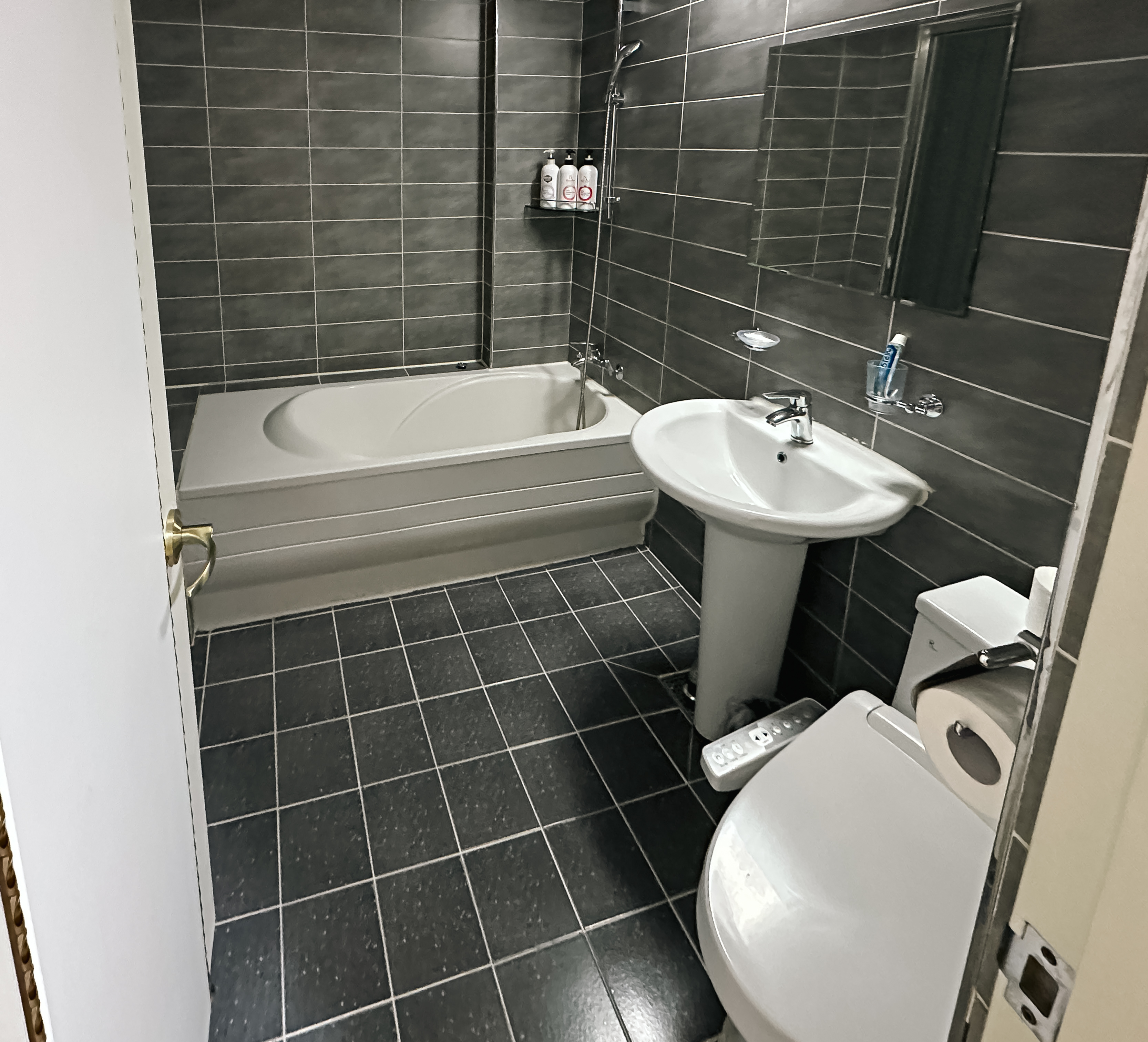욕실에는 욕조와 바디워시, 컨디셔너, 샴푸등이 있었고, 치약이 있긴 했으나 조금 지저분하게 사용되어 그냥 일회용을 사용하게 되더라고요. 그리고 변기에 비데가 있었습니다. 전체적인 욕실 컨디션은 쏘쏘.
