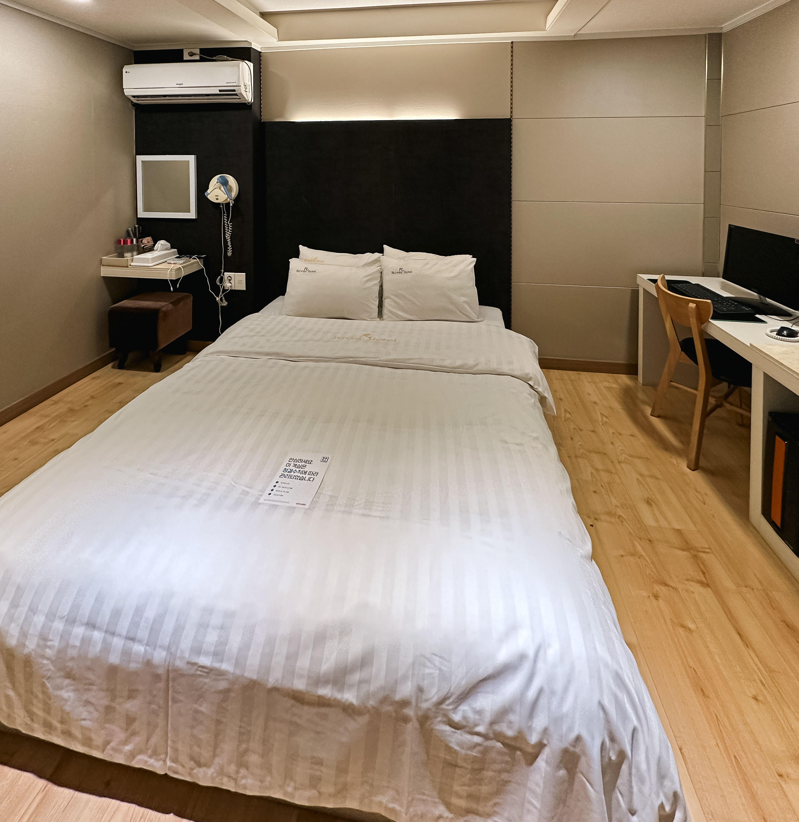 저희가 이용한 리버호텔의 객실은 침대 1개짜리를 이용했었는데, 객실에는 컴퓨터, 에어컨, 헤어드라이어, 전기장판, 책상과 냉장고, TV, 커피포트 등이 있었습니다. 그밖에 바닥난방이 있어서 따뜻하게 이용할 수 있었습니다. 마침 저희가 이용했던 날은 눈도 많이 내리고, 한파가 몰려온 날이라 날씨가 정말 추웠는데, 따뜻하게 보낼 수 있었습니다.