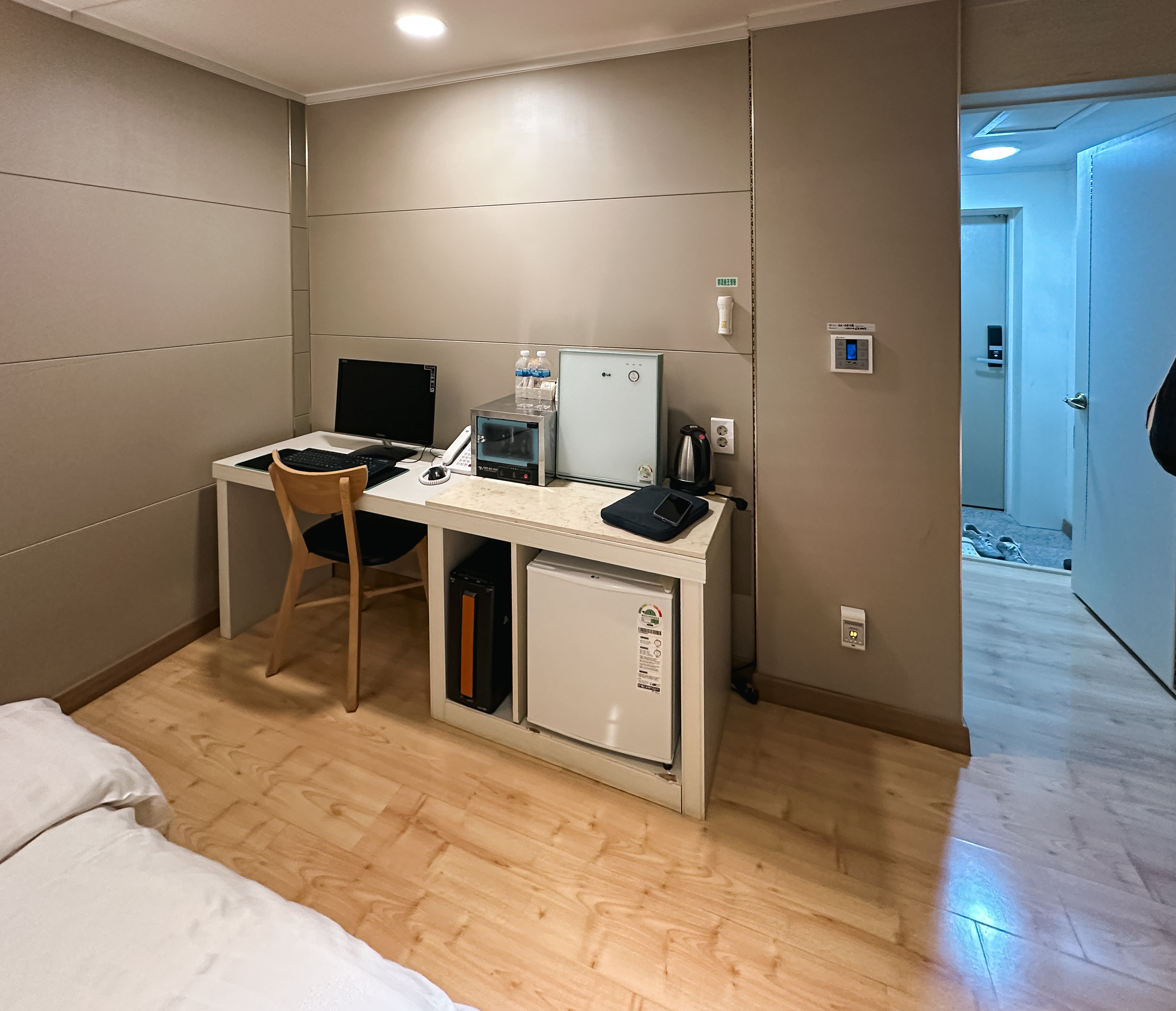 저희가 이용한 리버호텔의 객실은 침대 1개짜리를 이용했었는데, 객실에는 컴퓨터, 에어컨, 헤어드라이어, 전기장판, 책상과 냉장고, TV, 커피포트 등이 있었습니다. 그밖에 바닥난방이 있어서 따뜻하게 이용할 수 있었습니다. 마침 저희가 이용했던 날은 눈도 많이 내리고, 한파가 몰려온 날이라 날씨가 정말 추웠는데, 따뜻하게 보낼 수 있었습니다.