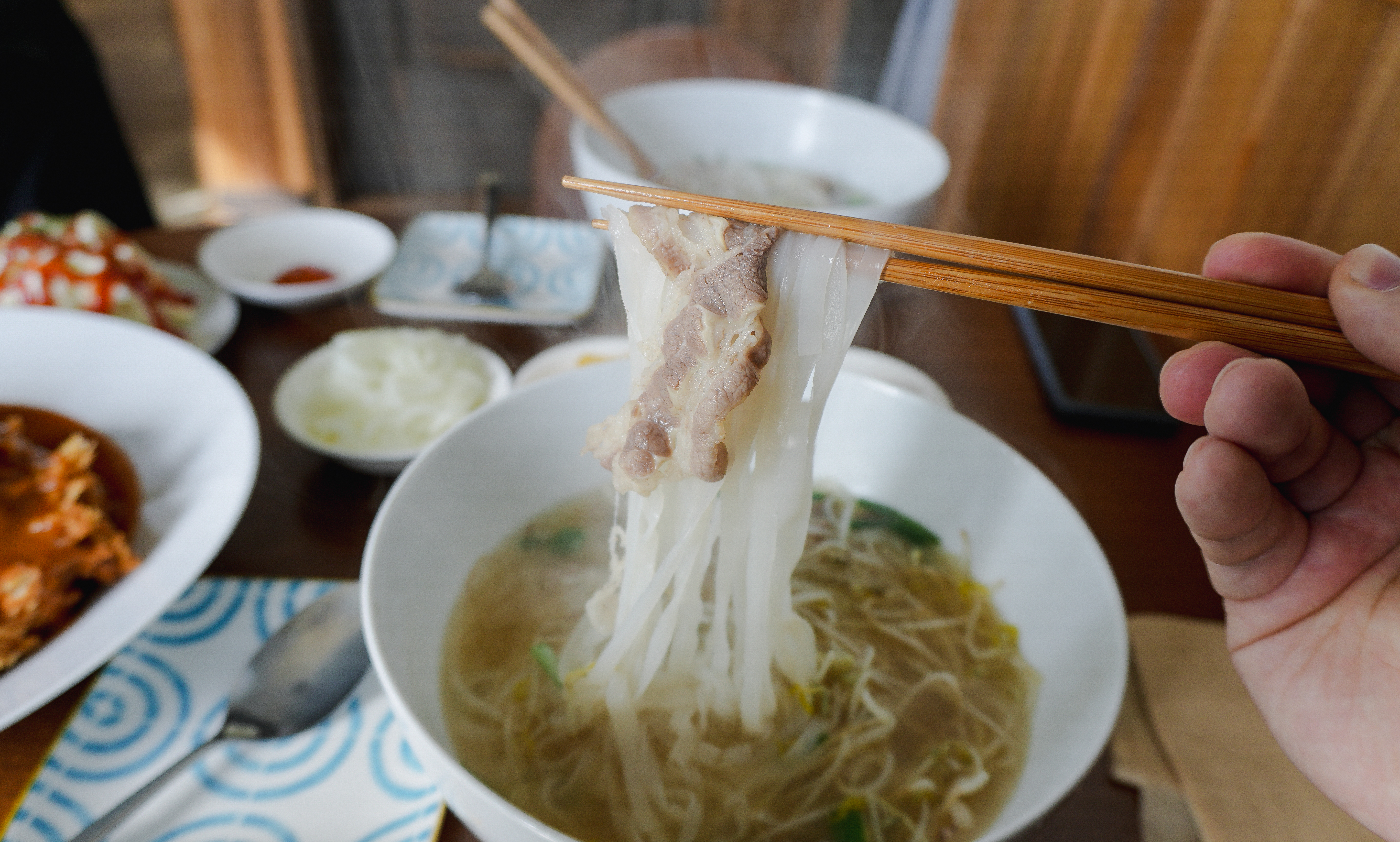 미주택 2층은 위와 같은 분위기였습니다. 카페로 이용해도 손색없을 인테리어에, 돈까스와 쌀국수라니 사장님이 뭔가 특이함을 많이 주고 싶었나 봅니다. 곧이어 쌀국수와 돈까스가 나왔습니다.