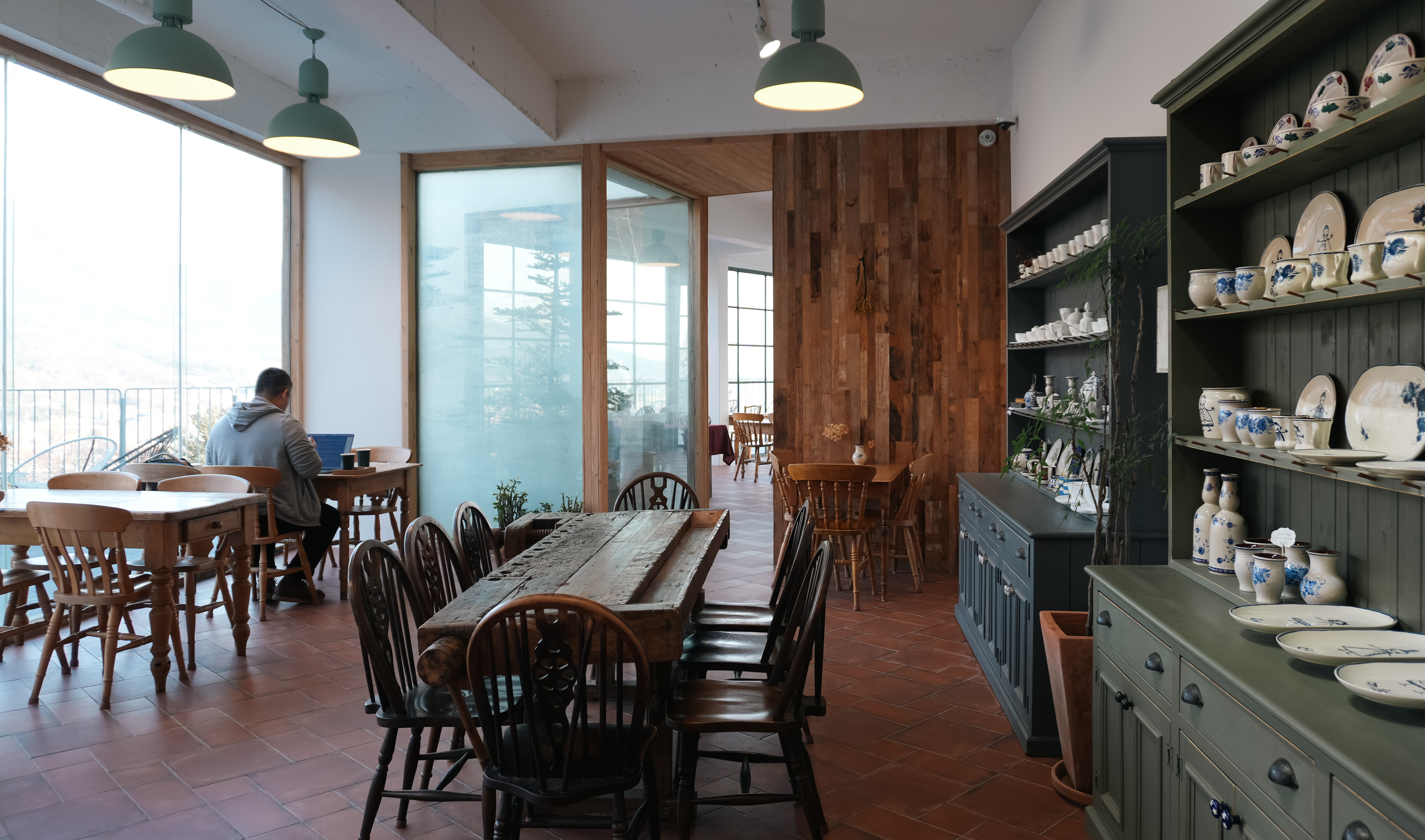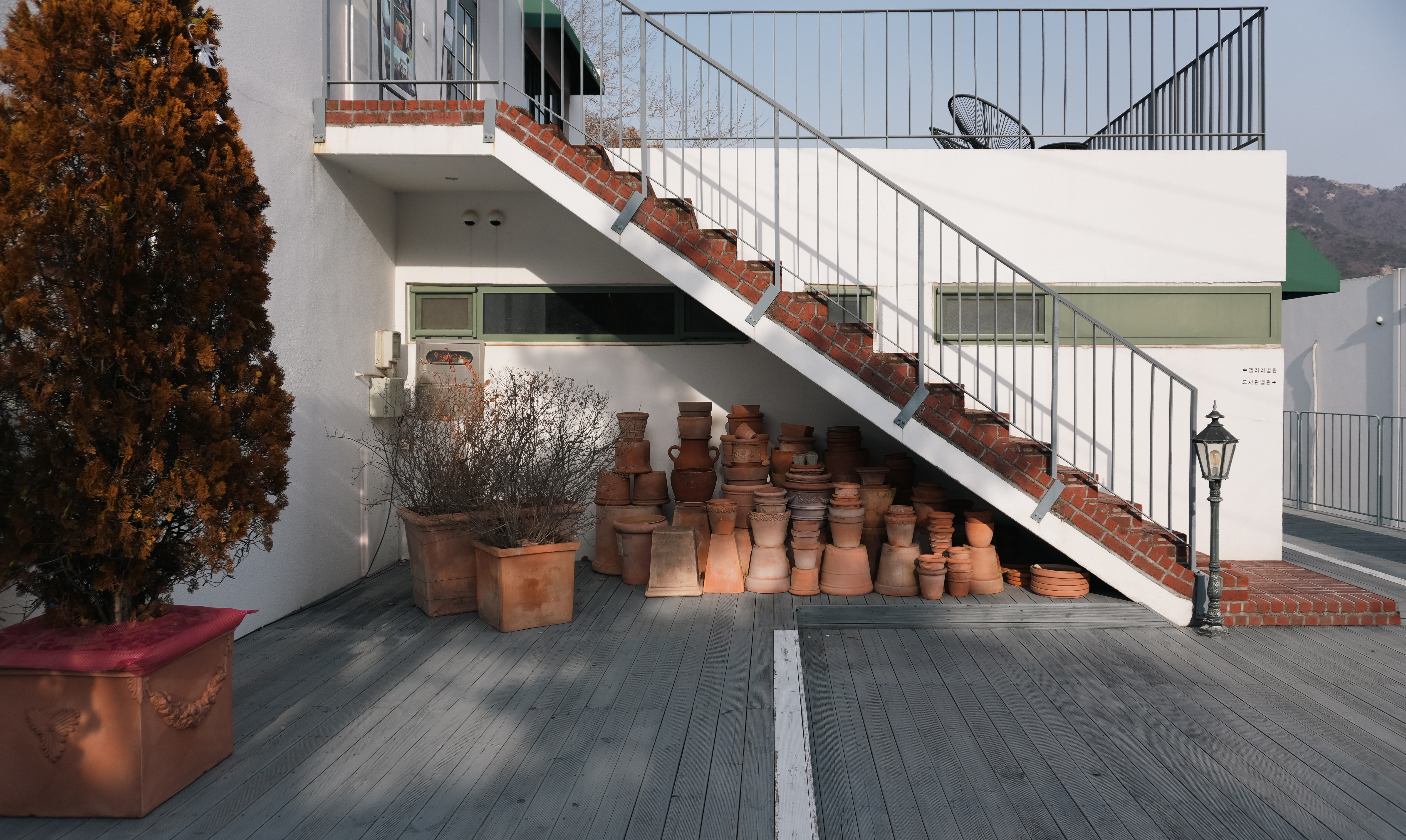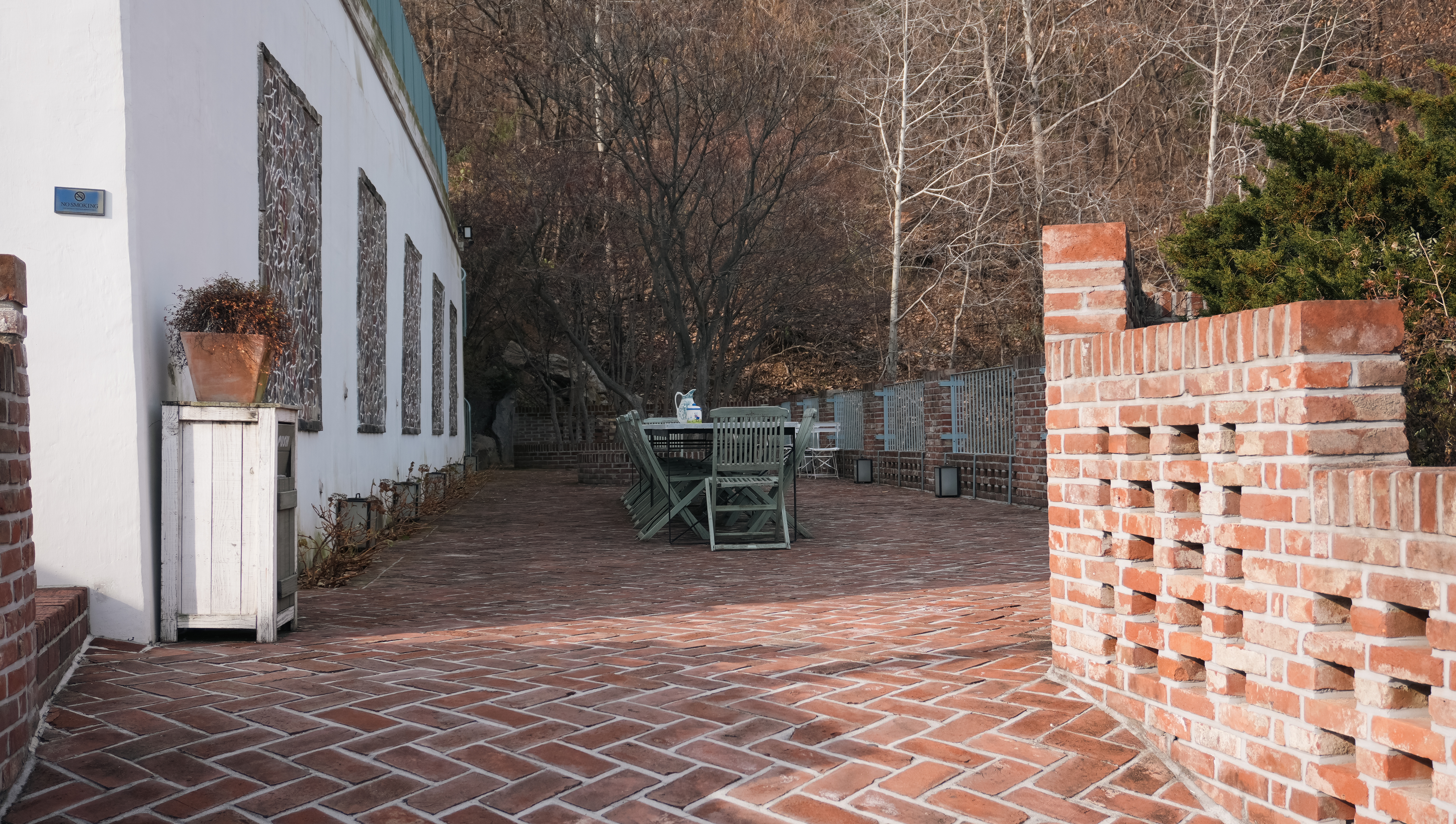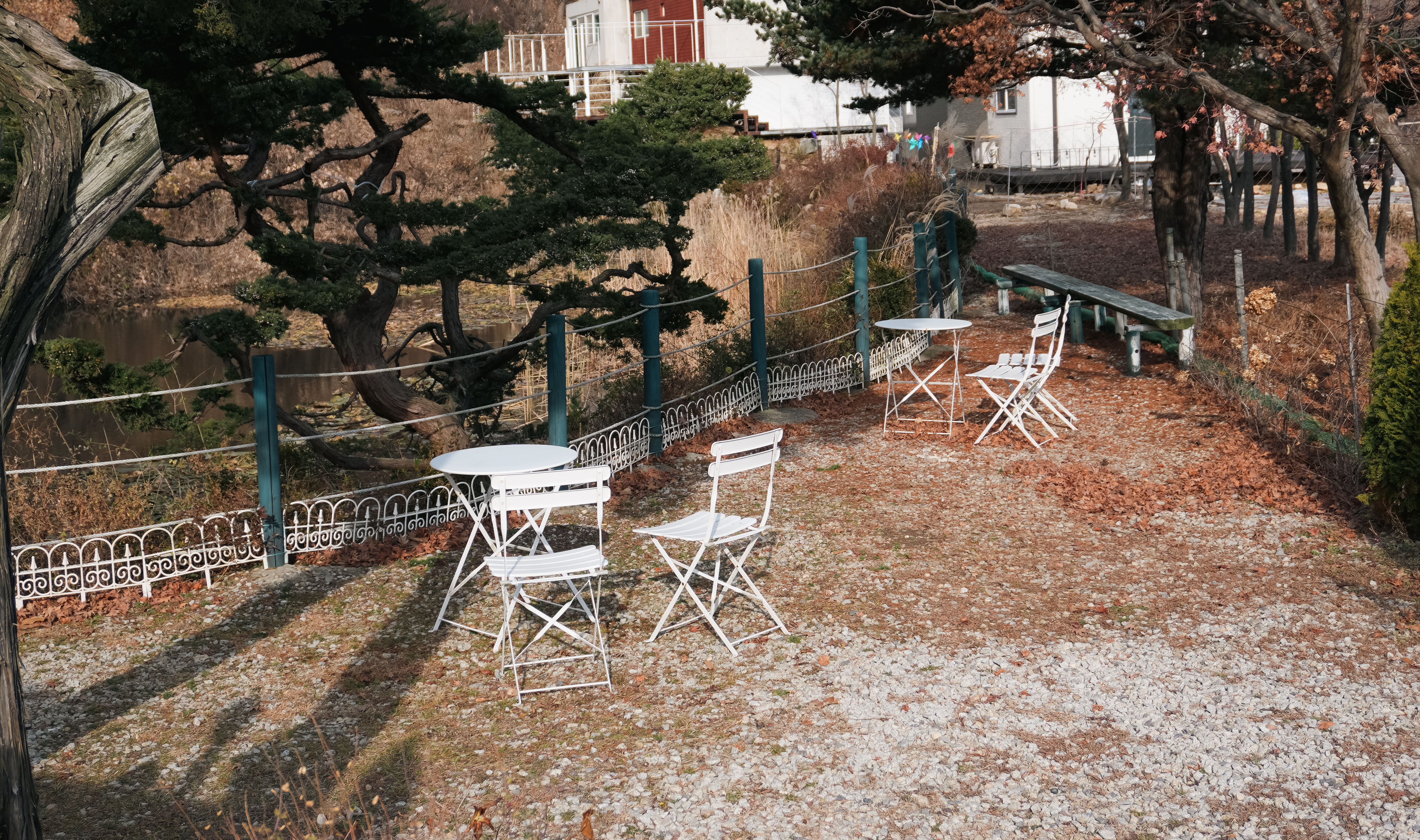 주차장에서 내리자마자 나오는 공간은 연못이 있는 공간과 긴 테이블이 위치한 정원이 나옵니다. 이곳에서 커피를 마셔도 되지만, 겨울이라 추워서 사진만 얼른 찍고 매장이 있는 1층으로 올라왔습니다.