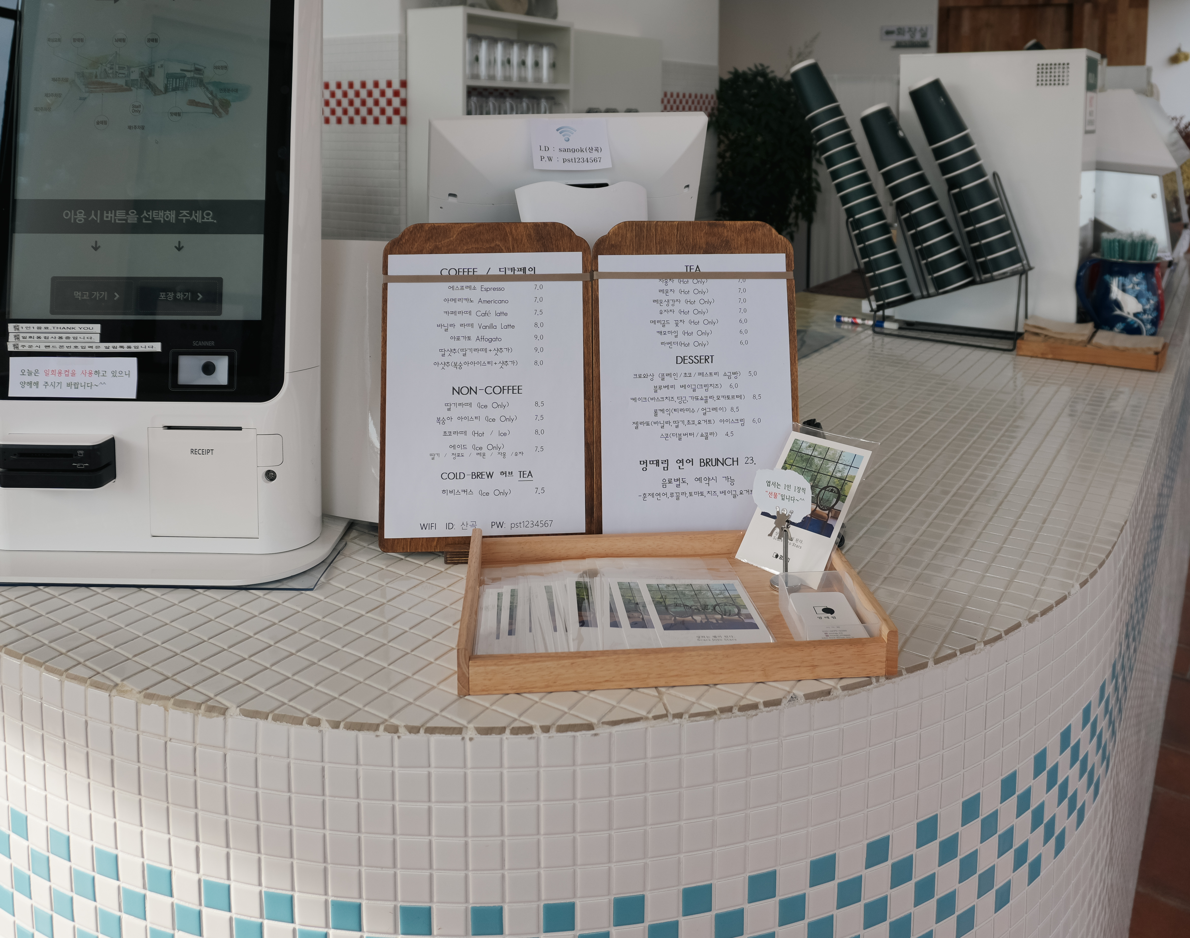 커피・음료나 디저트 계산은 멍때림 1층에서 하시면 되는데요, 강화도 카페 멍때림의 메뉴는 에스프레소, 아메리카노, 카페라떼, 바닐라라떼, 아포카토, 딸샷추, 아샷추, 딸기라떼, 복숭아아이스티, 초코라떼, 에이드, 콜드브루히비스커스, 자몽차, 레몬차, 레몬생강차, 유자차, 메리골드꽃차, 캐모마일, 라벤더, 크로와상, 블루베리베이글, 케이크, 롤케익, 젤라또, 스콘, 멍때림연어 등이 준비되어 있었습니다.