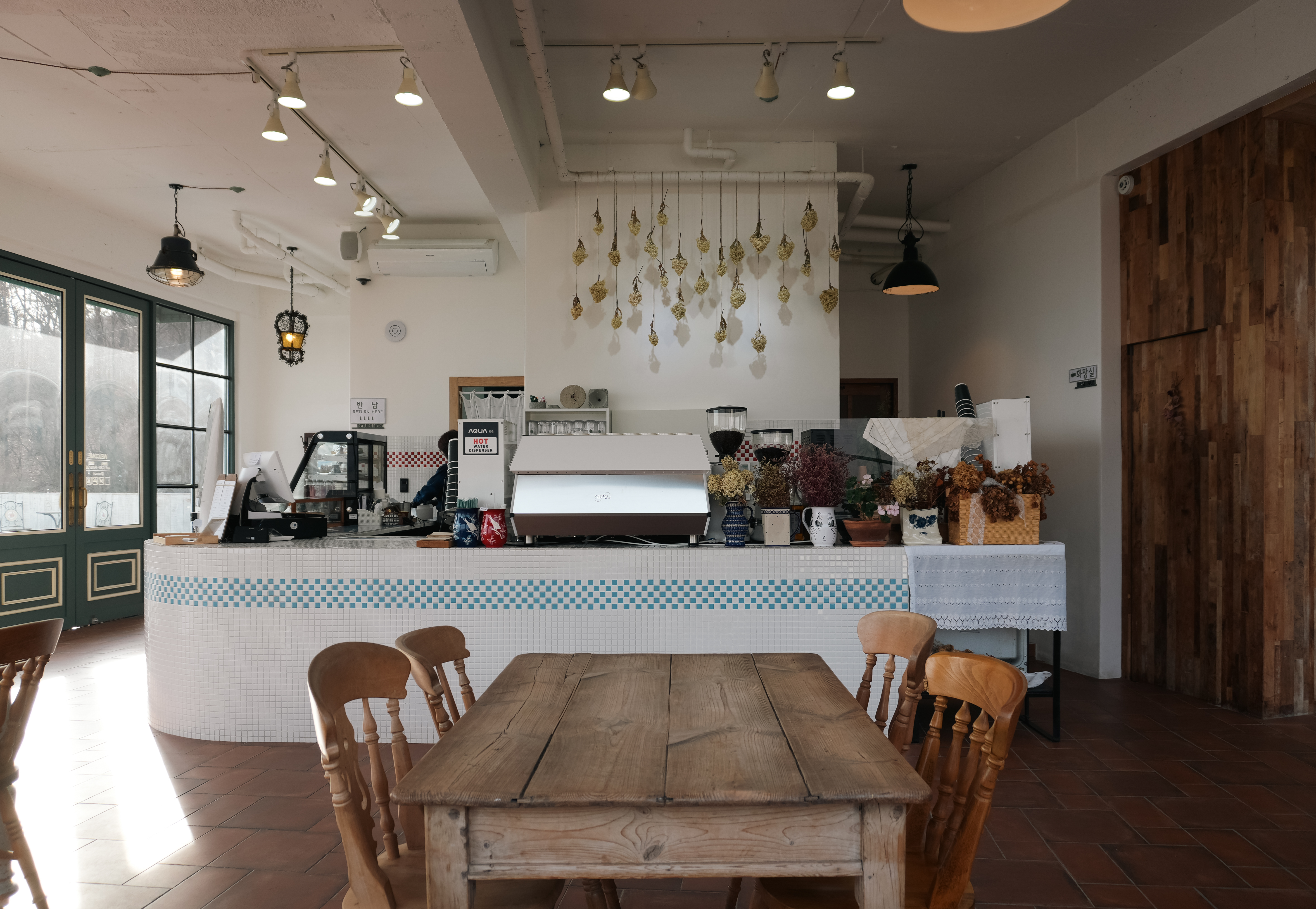주차장에서 내리자마자 나오는 공간은 연못이 있는 공간과 긴 테이블이 위치한 정원이 나옵니다. 이곳에서 커피를 마셔도 되지만, 겨울이라 추워서 사진만 얼른 찍고 매장이 있는 1층으로 올라왔습니다.