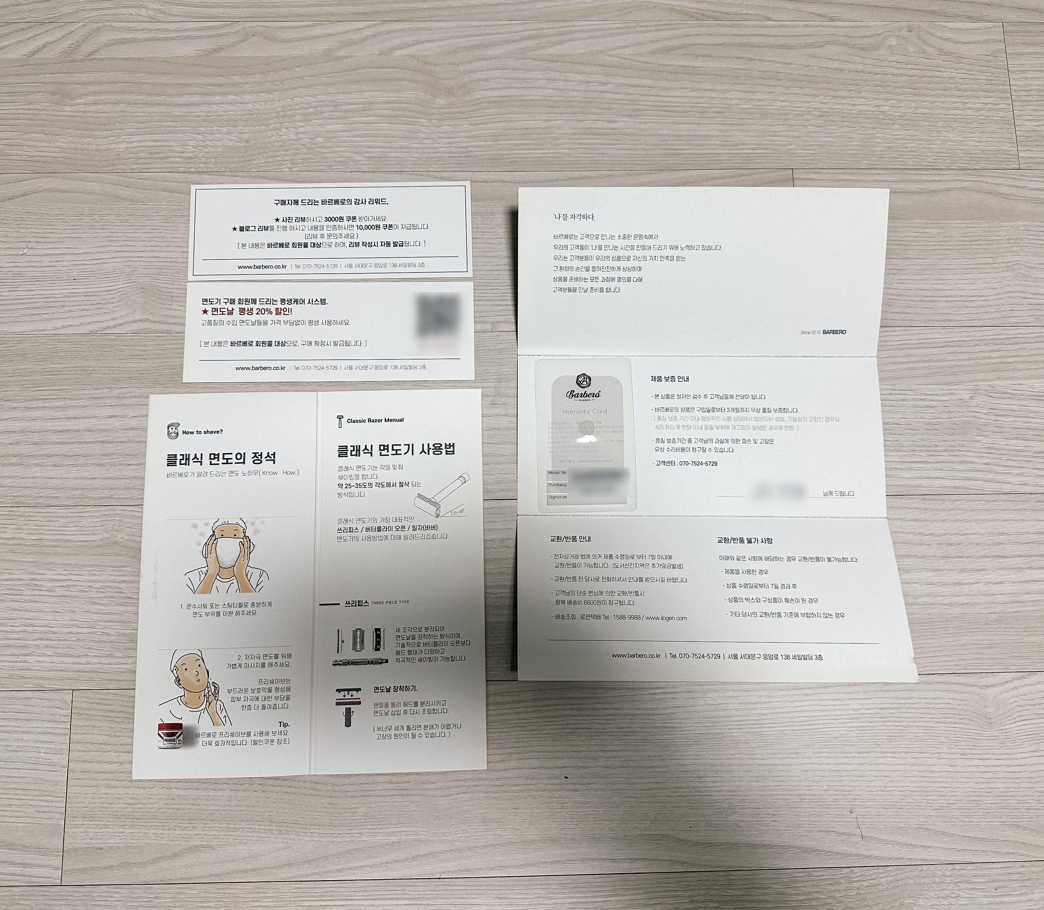 다시 본론으로 돌아와 클래식 면도기 바르베로의 프리미엄 OX 기프트 박스에는 위와 같이 고급스러운 박스 포장면도기와 제품보증서가 들어있습니다. 물론, 클래식 면도기를 처음 접하시는 분들을 위한 클래식 면도기 사용 가이드가 동봉되어 있었습니다.