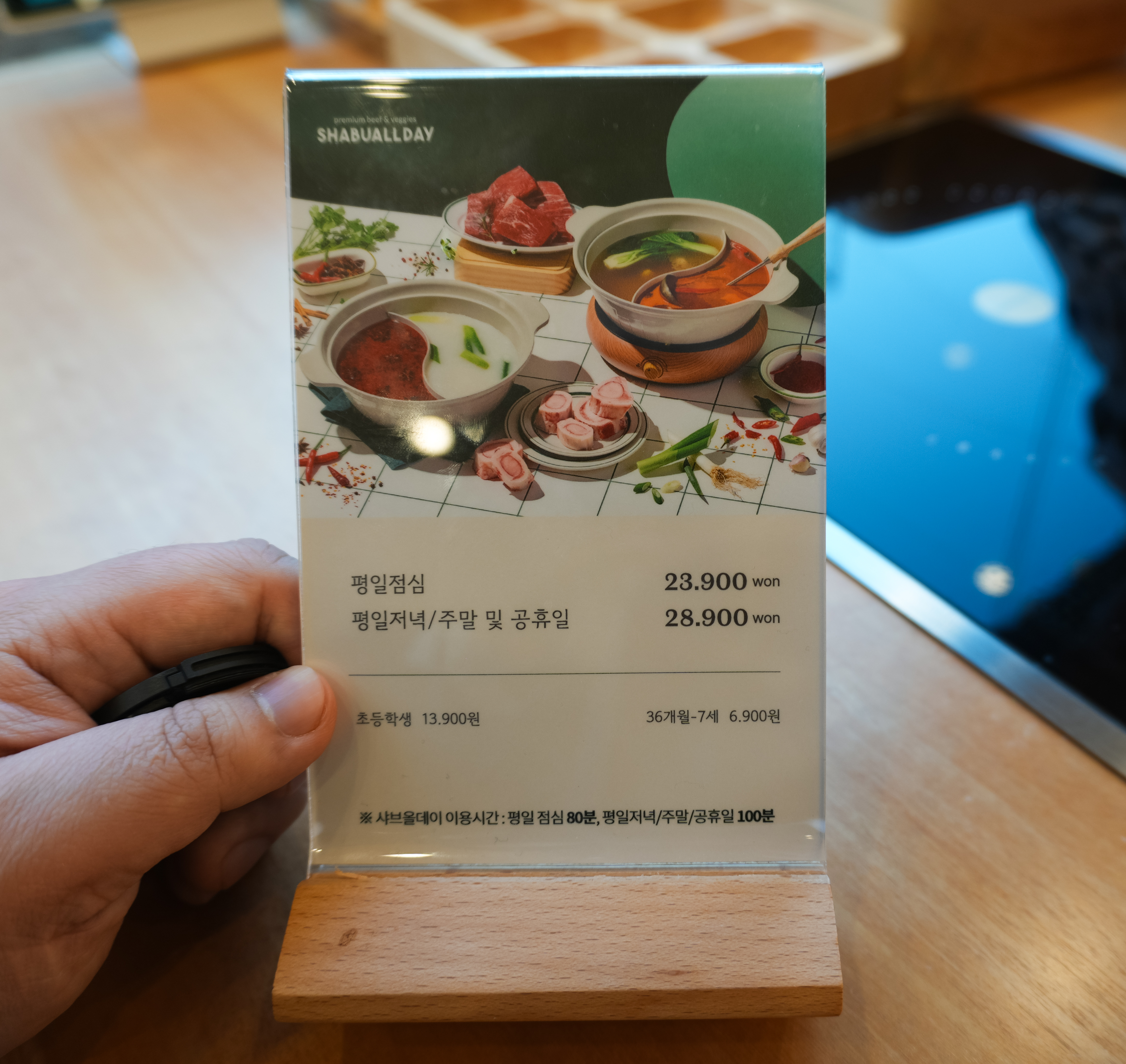 샤브샤브 무한리필 뷔페 샤브올데이의 가격은 평일점심 23,900원, 평일저녁 28,900원이며, 초등학생의 경우 13,900원, 유아는 6,900원 이었습니다. 육수는 양지육수, 얼큰양지육수, 표고버섯육수, 사천마라육수중에 2가지를 선택할 수 있었는데, 저희는 가장 기본 육수인 시그니처 양지육수로 2개를 주문했습니다.