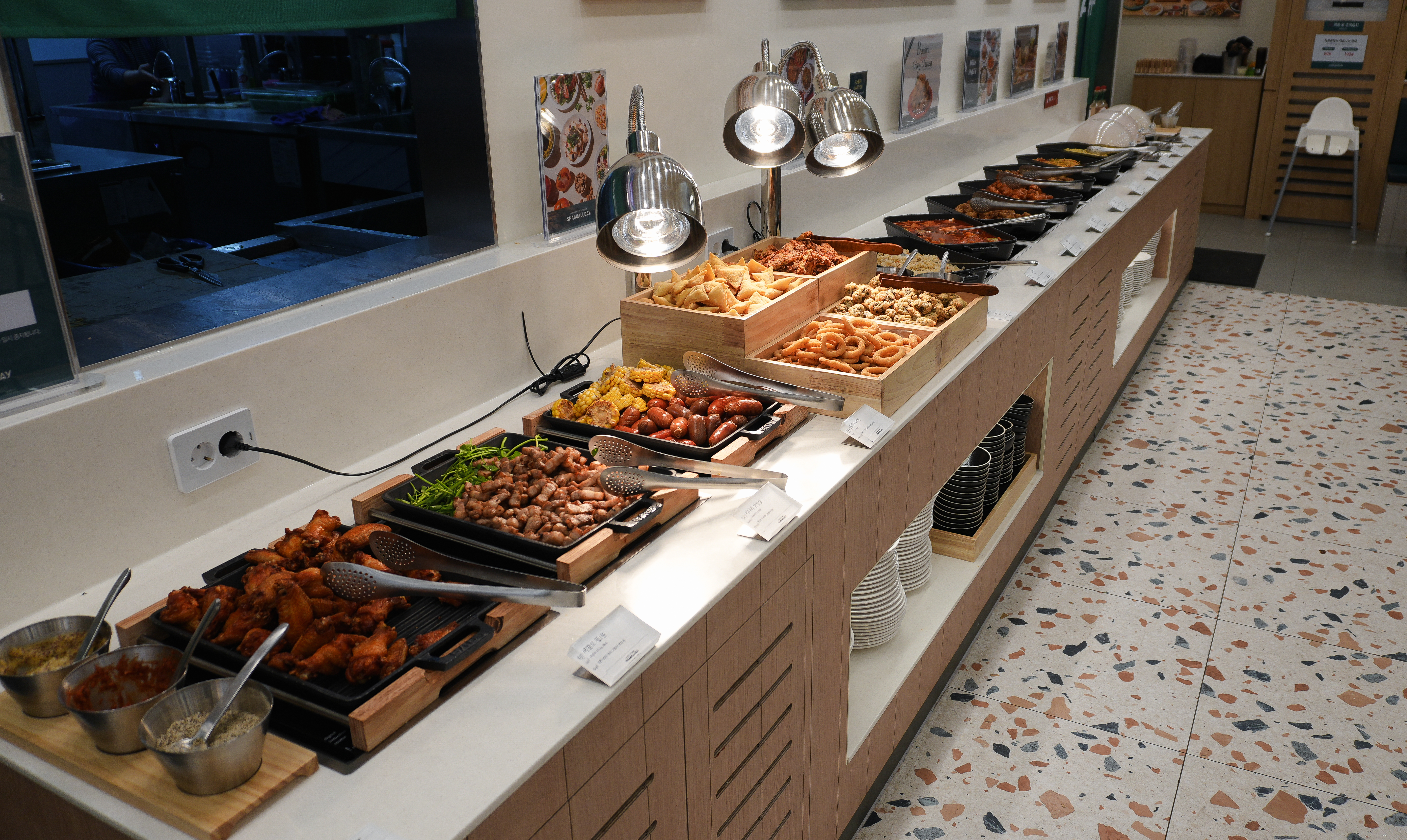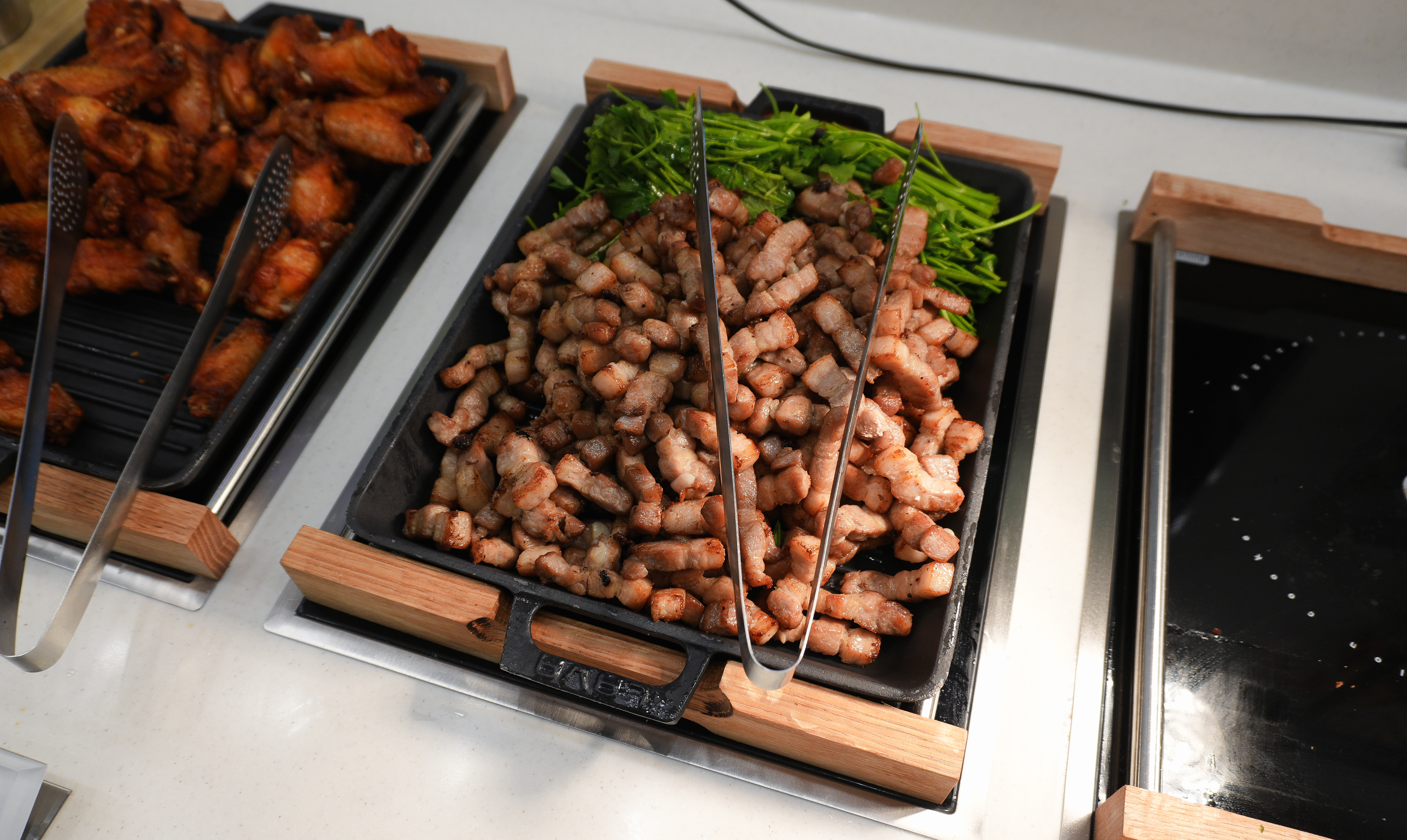 샐러드바에는 다양한 채소들과 튀김, 파스타, 삼겹살, 피자, 초코분수, 주스, 음료, 탄산 등 먹거리가 있었습니다. 채소들은 대략적으로만 보시고, 튀김, 삼겹살 등 고기반찬 위주로 자세히 살펴보시죠.