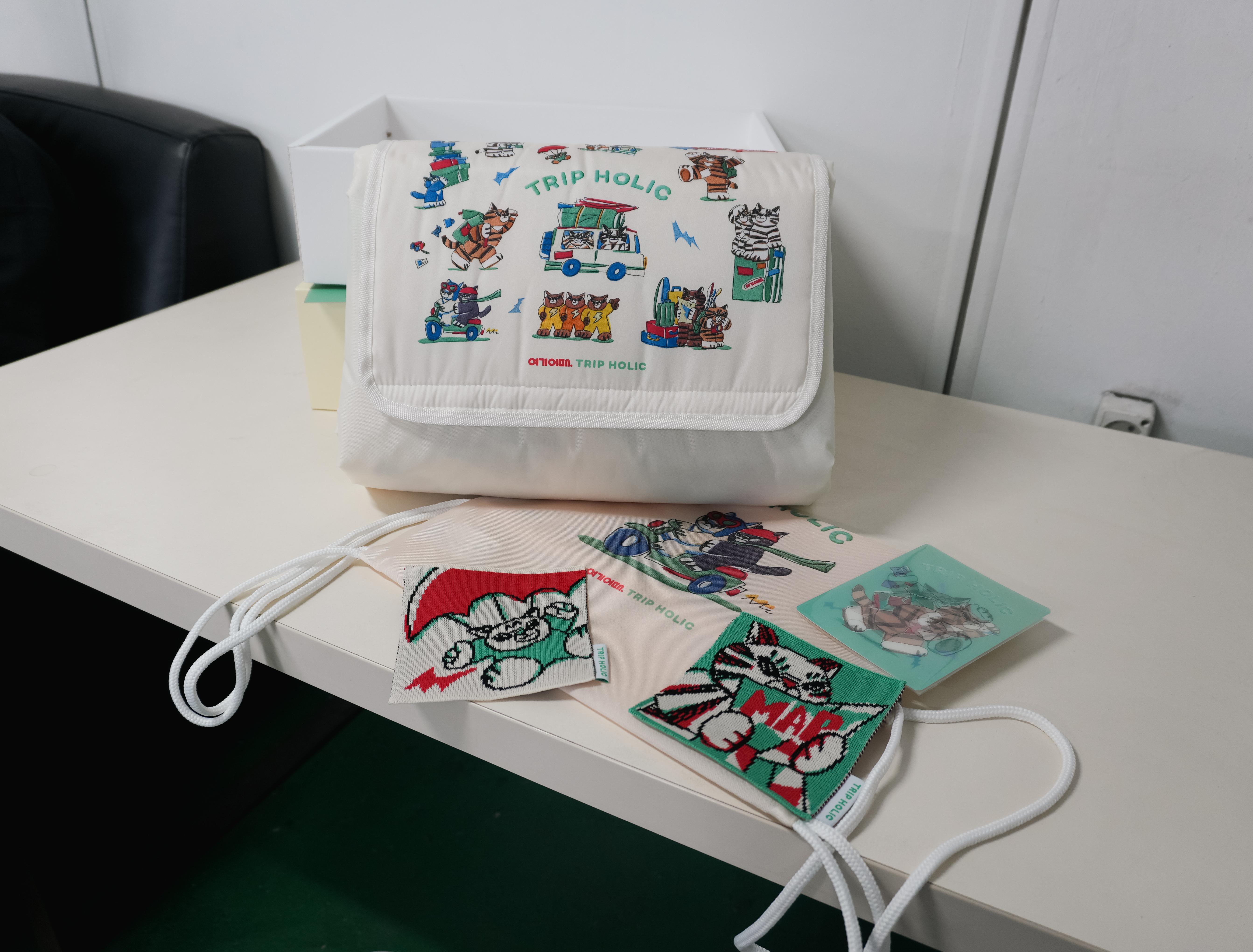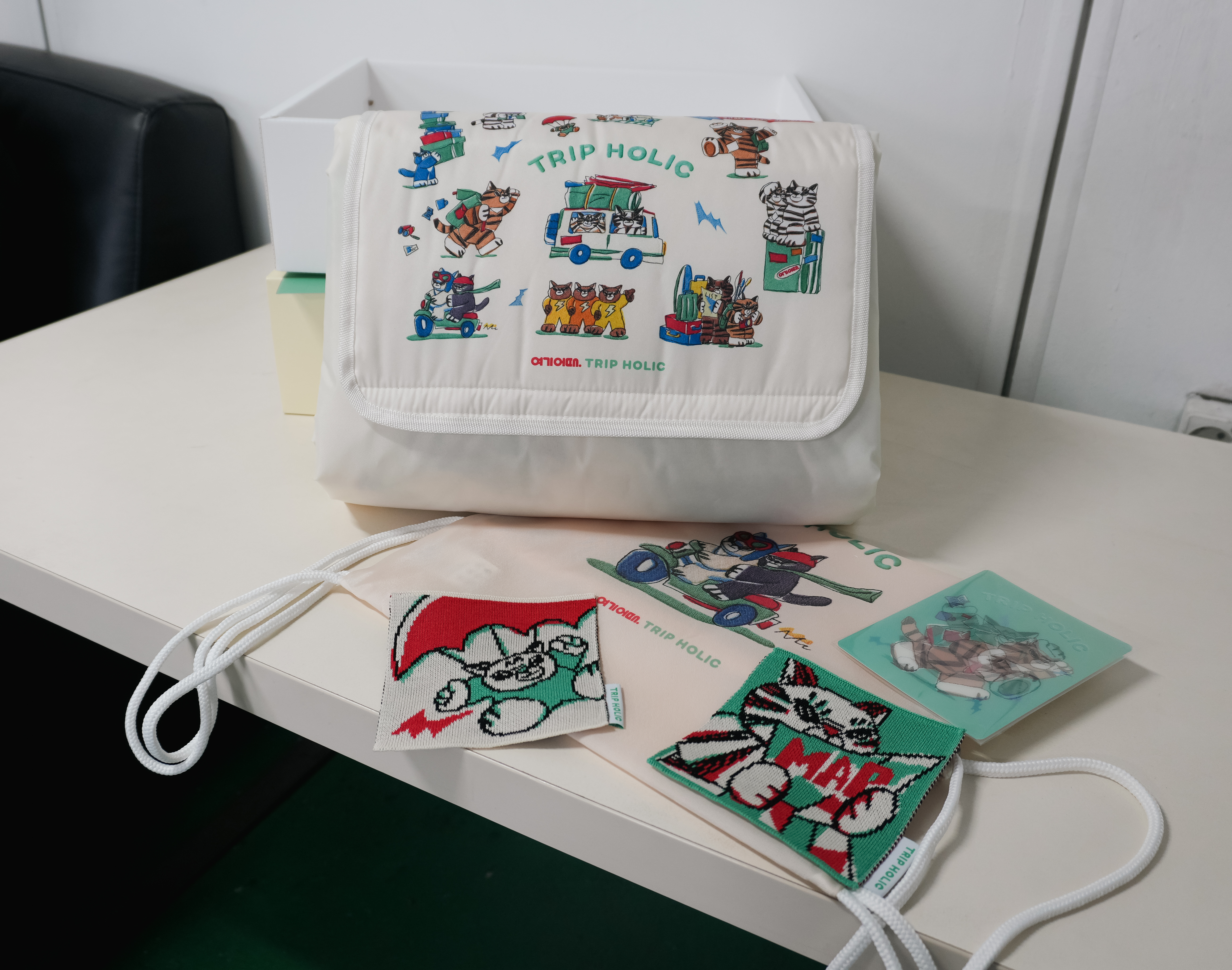 트립홀릭 웰컴굿즈 상자에는 피크닉매트와 짐색, 티코스터, 엽서까지 '고주연 작가'와 '여기어때'와의 콜라보로 탄생한 굿즈가 들어있었습니다. 고양이가 여행하는듯한 모습의 디자인의 굿즈는 귀엽기도 하고 실용적인(?) 상품들이었습니다. 특히 피크닉매트는 접어서 가방처럼 가지고 다닐 수 있게 되어있었는데, 안 그래도 며칠 전부터 돗자리를 구입하려고 알아보고 있었는데, 딱 필요했던 제품이 굿즈로 들어있어서 너무 기분이 좋았습니다. 게다가 너무 아기자기하고 귀여워서 만족감이 더 높았던 것 같습니다.