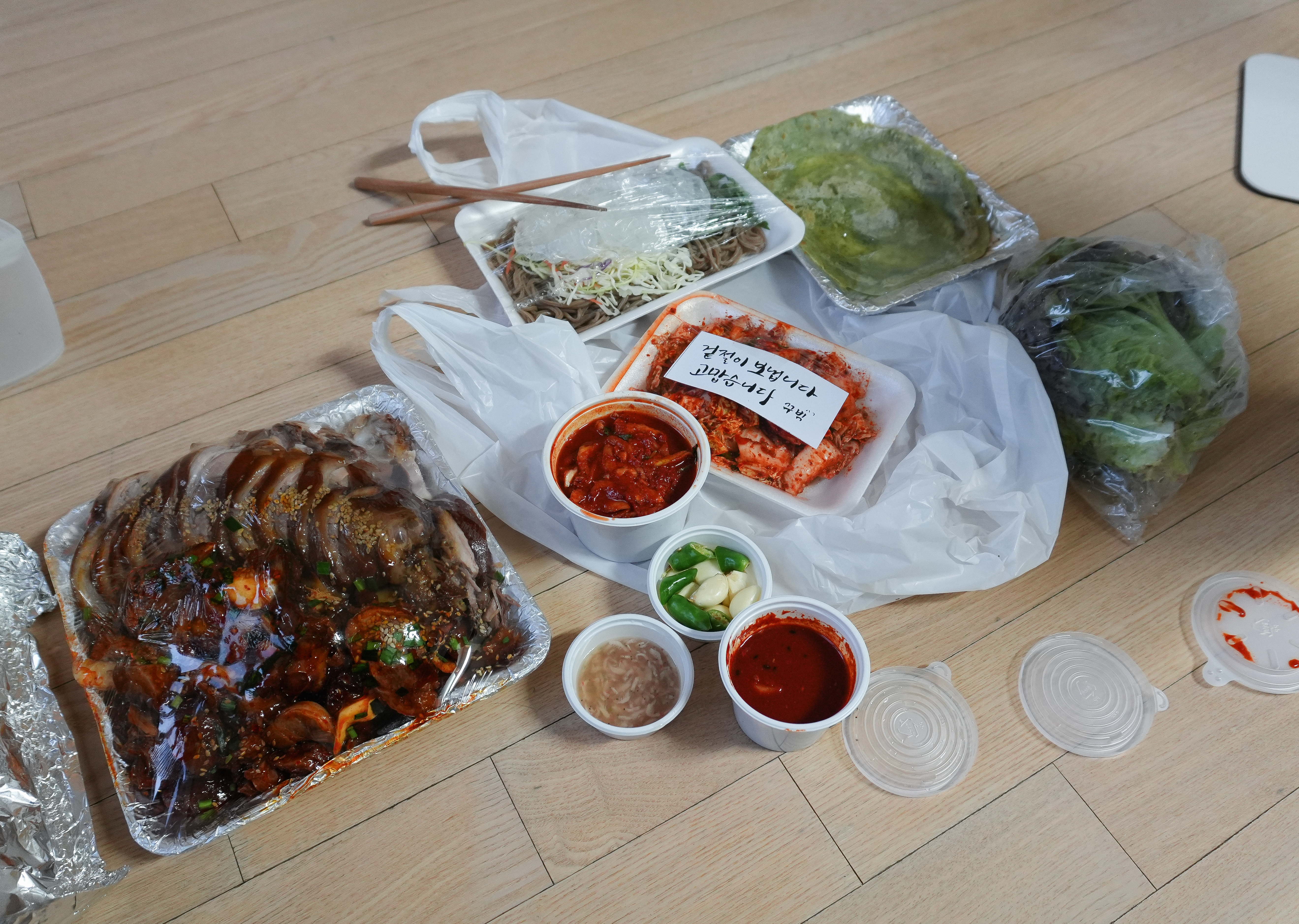 분당 옹기족발의 메뉴를 포장해 왔는데, 족발과 함께 무김치, 새우젓, 마늘, 김치, 막국수, 쌈채소, 매생이전 등이 있었습니다. 일반 족발도 부드럽고 맛있었고, 매운 양념족발도 마찬가지로 쫀득한 껍질과 감칠맛 있는 양념이 맛있었던 메뉴입니다.