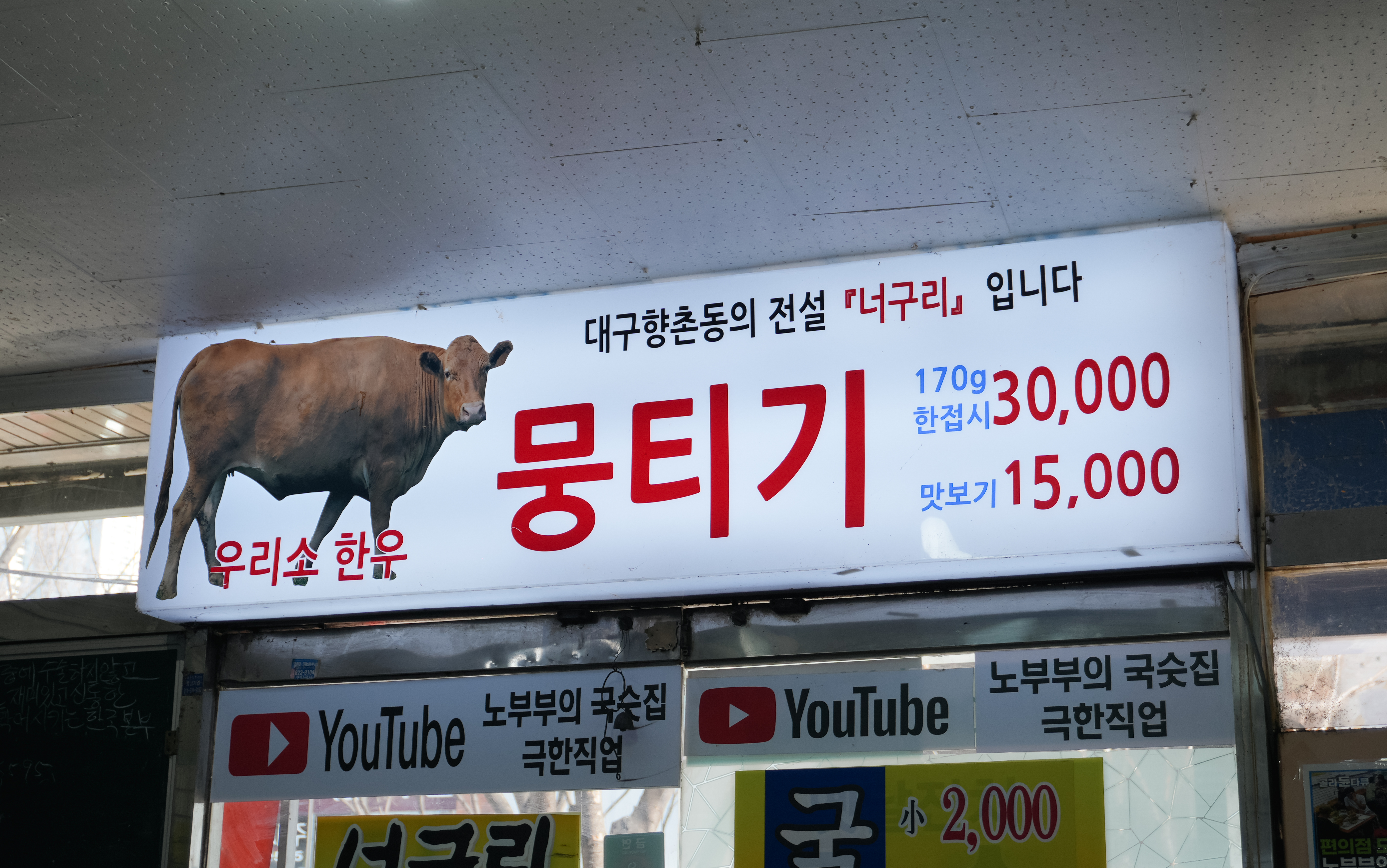 옛날국수 너구리는 대구 중구 향촌동 74-5, 1층에 위치해 있었습니다. 이곳은 최소 15,000원에 뭉티기를 맛볼 수 있는 어마어마한 저렴한 가격에 뭉티기를 판매하고 있었습니다. 이곳은 노부부가 운영하는 노포였는데, 남녀노소 가릴 것 없이 많은 손님이 찾고 있는 가게였습니다.