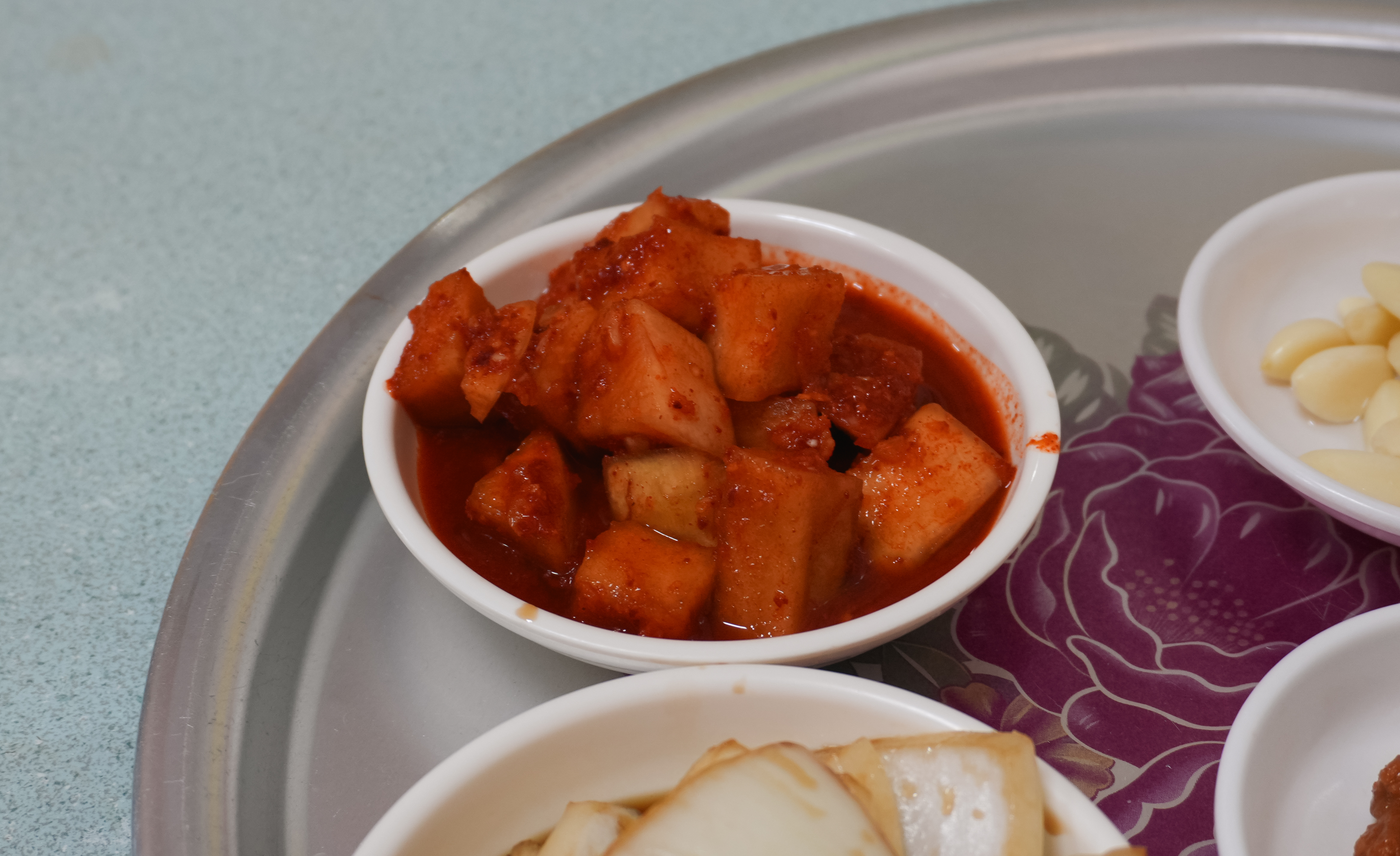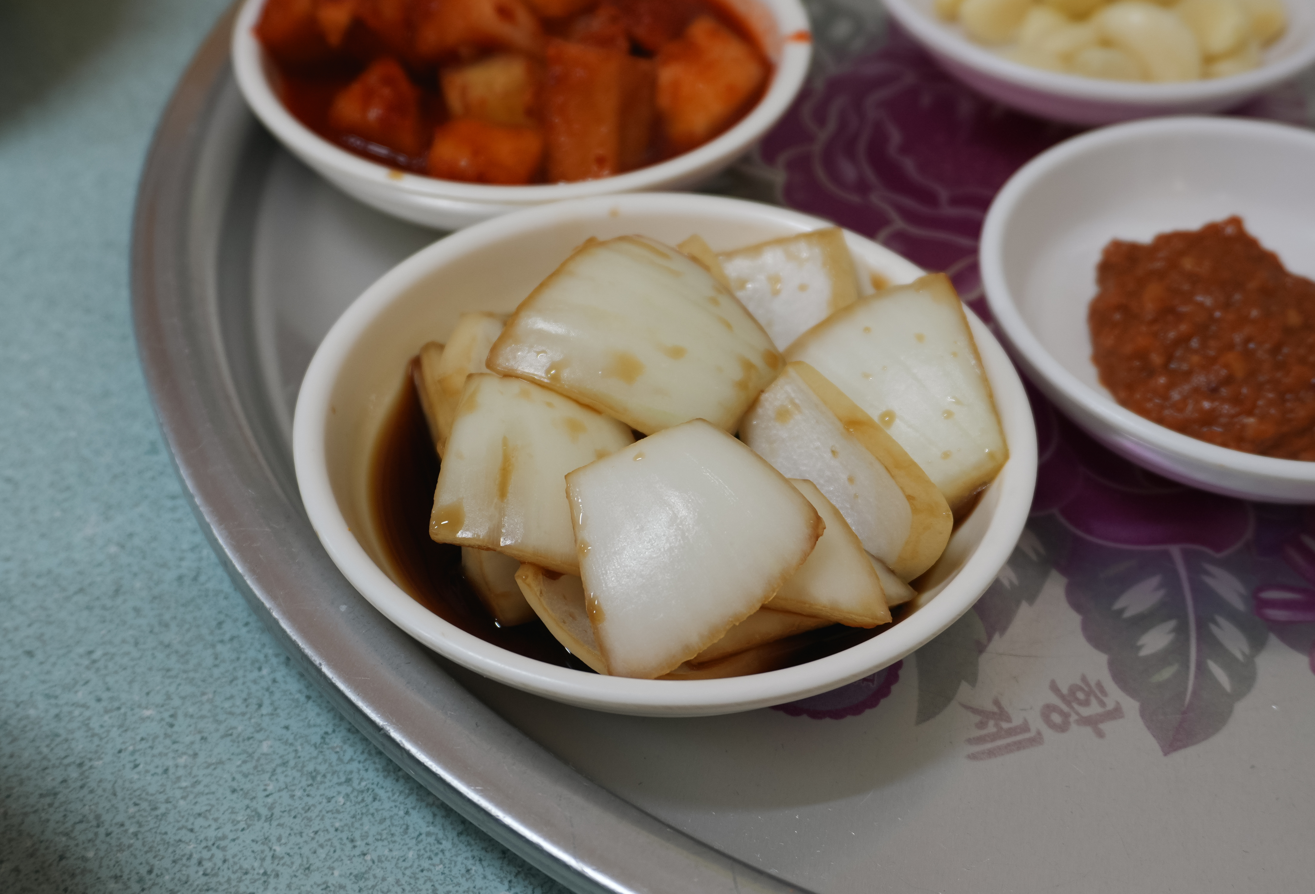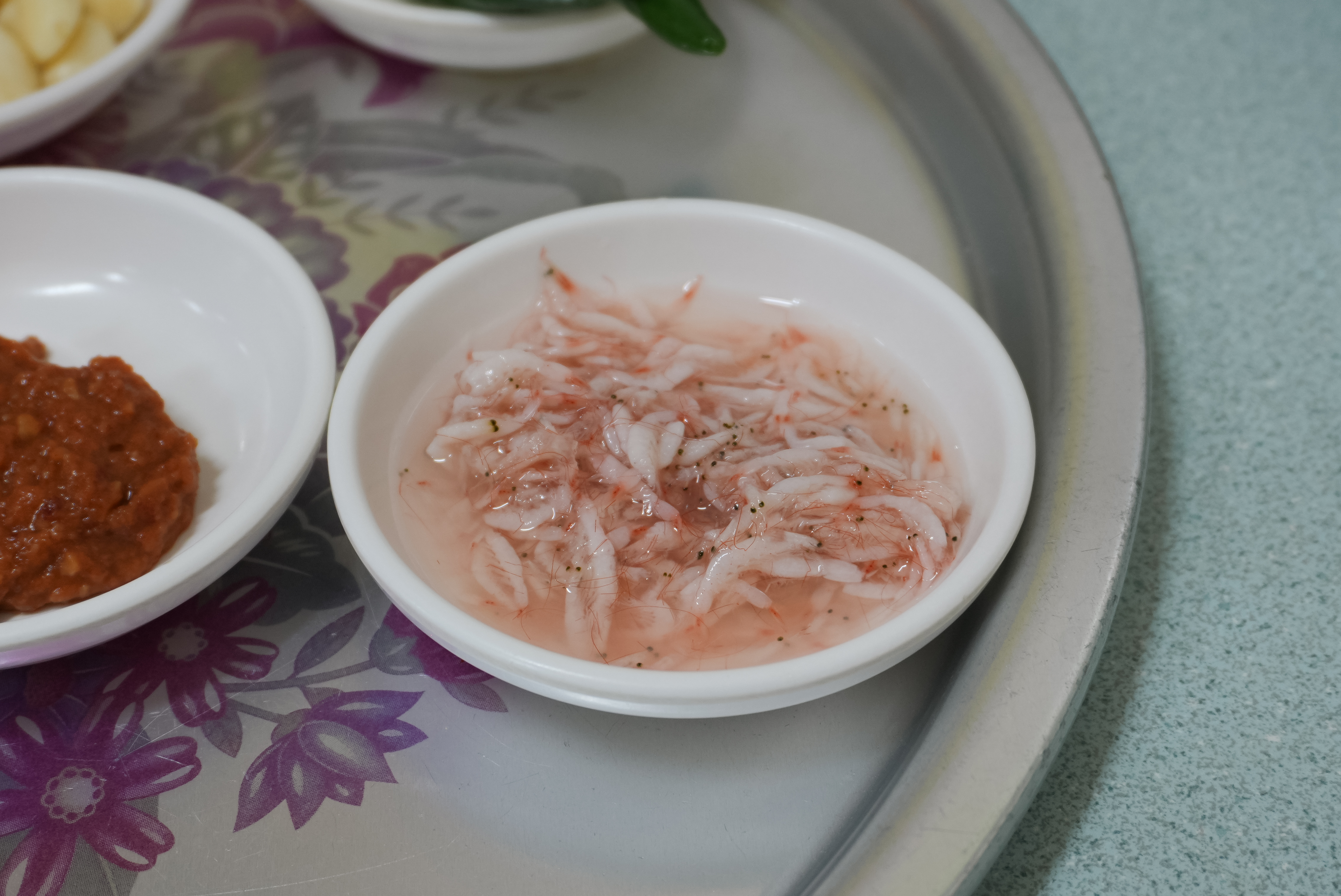 봉덕신시장 청도돼지국밥의 돼지국밥이 나왔습니다. 돼지국밥에는 쌈장과 후추가 양념으로 곁들여 나왔고, 반찬으로 깍두기, 양파장아찌, 마늘, 고추, 새우젓, 쌈장이 함께 나왔습니다. 저는 돼지국밥과 깍두기를 곁들여 먹었는데, 깍두기가 정말 달고 맛있더라고요. 양파장아찌도 곁들이면 깔끔한 맛에 먹을 수 있었습니다.