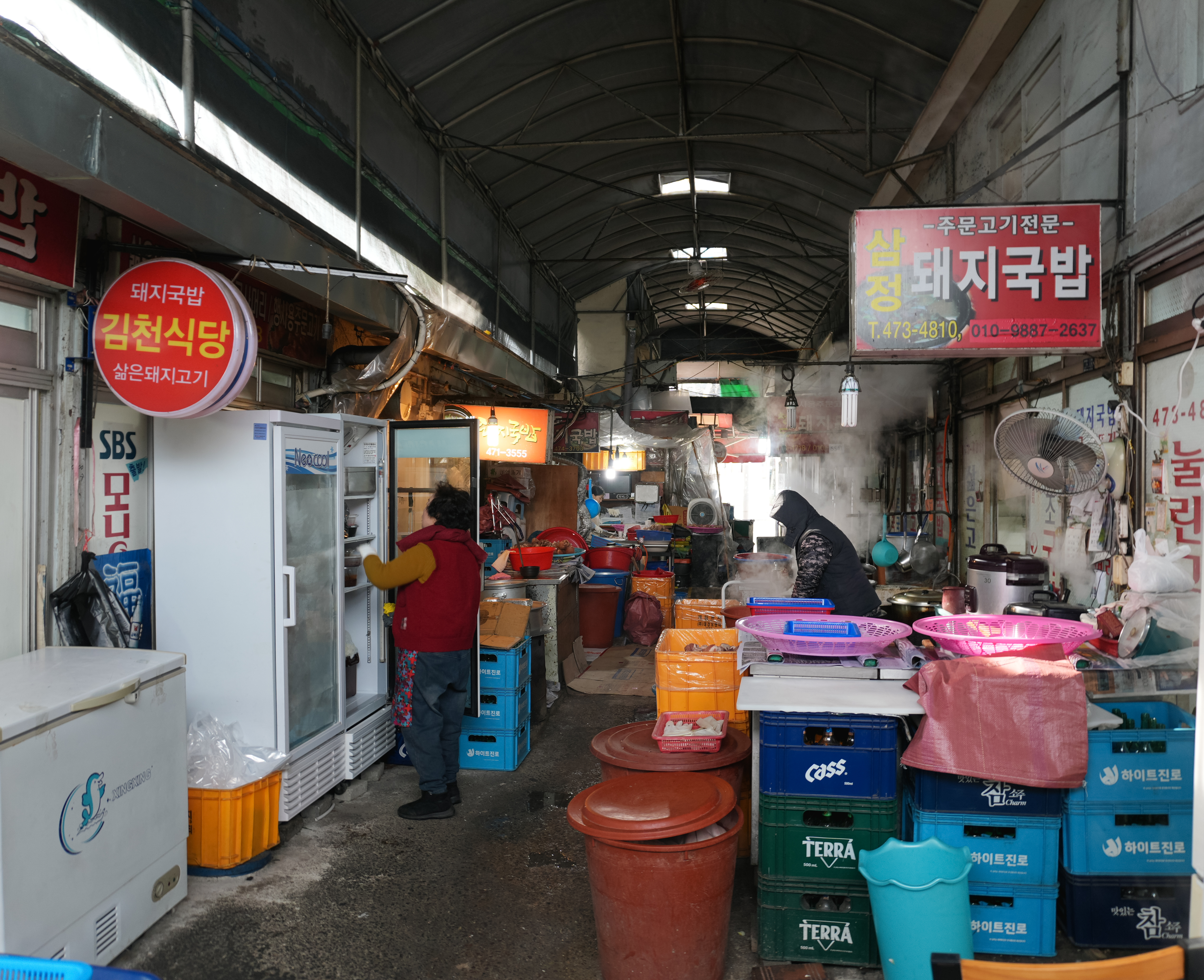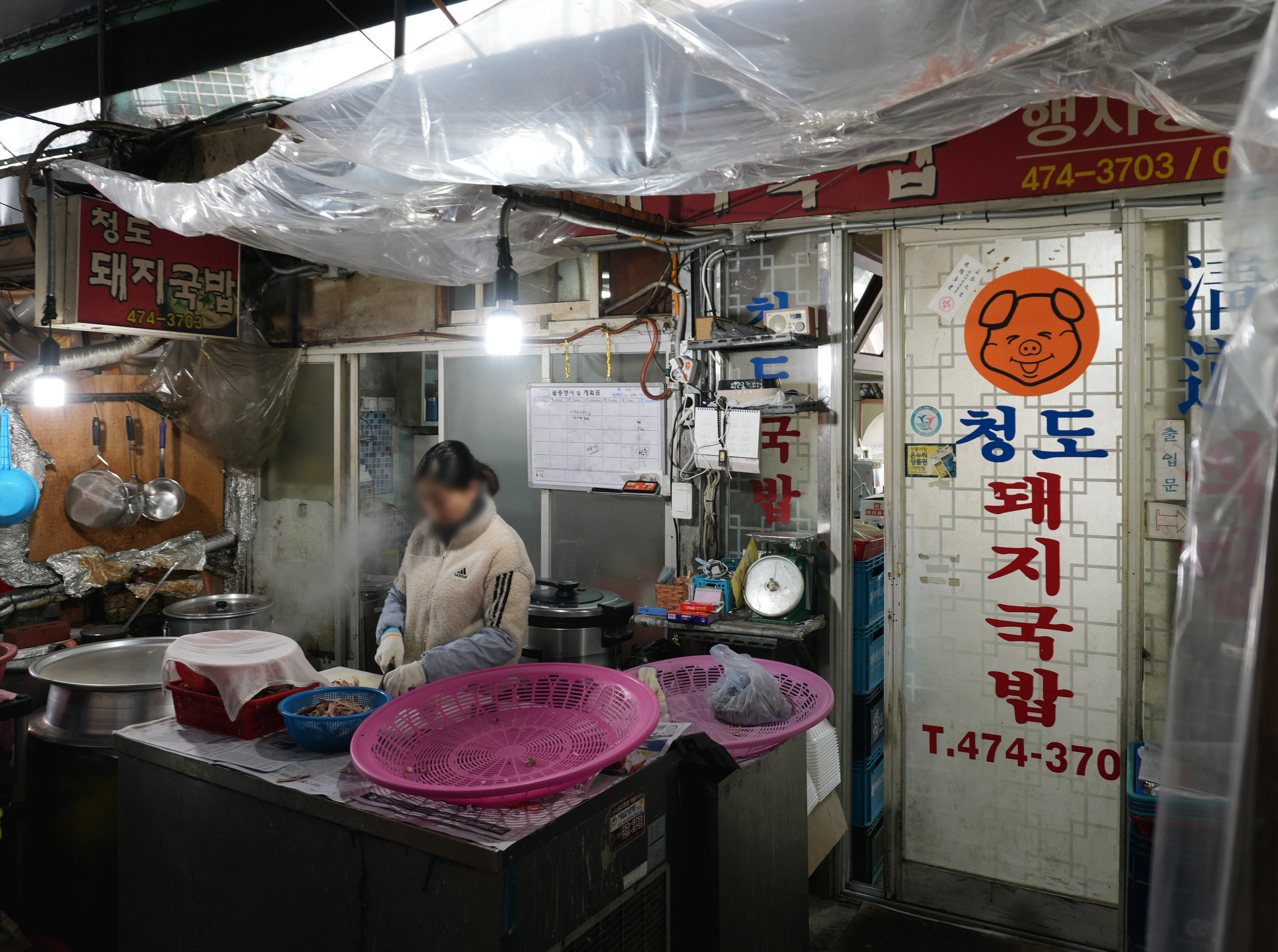 청도돼지국밥은 대구 남구 대봉로 65 에 위치한 가게이며, 원래 도로변에서 바로 간판이 보이지만, 시장 안쪽에서도 가보고 싶어서 봉덕신시장 안쪽으로 돌아가 보았습니다. 항상 외부의 출입구로만 다니다가 시장 쪽으로 들어가니, 비슷한 돼지국밥 가게들이 많아서 헷갈리더라고요. 그래도 금세 찾아낼 수 있었습니다. 시장 안쪽에서 바라본 청도돼지국밥의 모습은 위와 같았습니다.