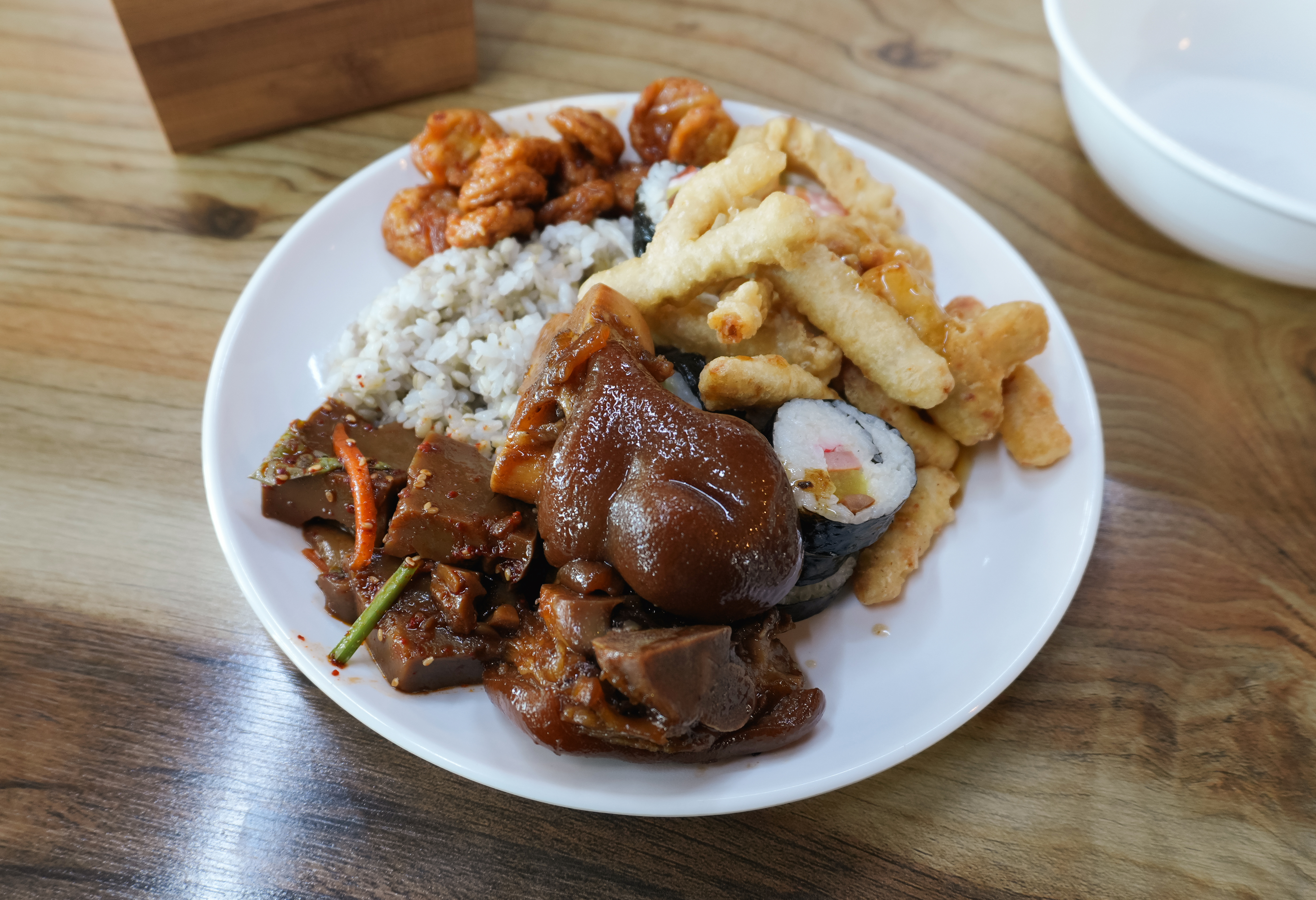 메뉴를 담아와 자리로 가져와서 먹었는데, 전체적으로 무난한 느낌이었는데 족발은 살코기가 붙어있는 부분은 아니었지만, 껍데기가 야들야들 부드럽게 잘 삶아져 정말 맛있더라고요. 그밖에 김밥, 탕수육, 묵, 어묵 등 두루 괜찮았습니다. 저는 국수는 따로 먹지 않고, 국수용 국물만 가져다 먹었는데 같이 먹으니깐 좋았습니다.