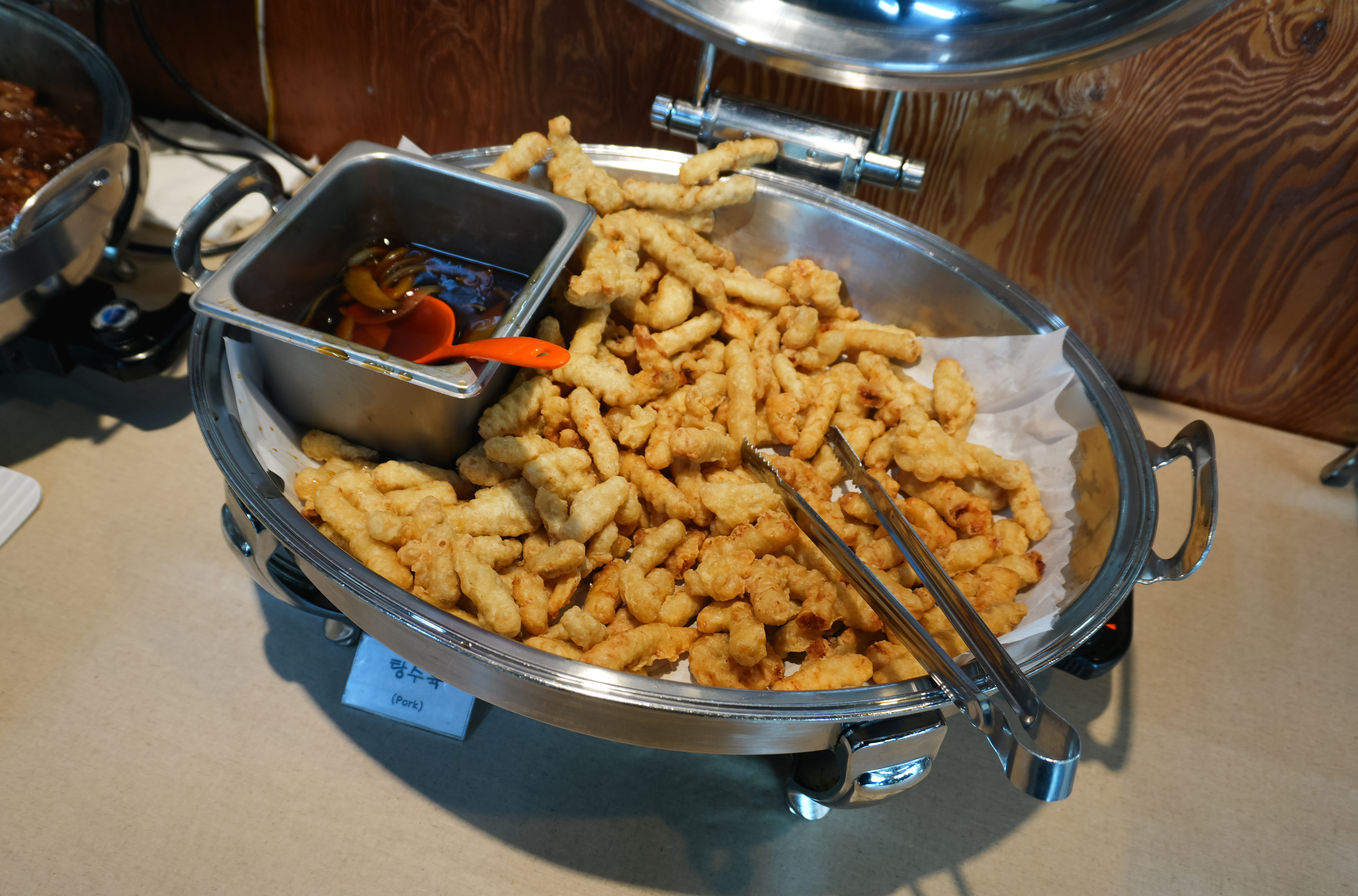 잡채, 탕수육, 족발, 닭볶음탕, 샌드위치, 바나나, 매실차 등이 있었습니다. 탕수육은 기성품을 사용하고 있었는데, 무엇보다도 해나루 한식뷔페의 강점을 손에 꼽자면 직접 만드는 족발을 먹을 수 있다는 점이 아닐까 싶습니다. 닭볶음은 제가 별로 좋아하진 않아서 안 먹어봤는데, 다른 분들은 많이 찾으시는 것 같더라고요.