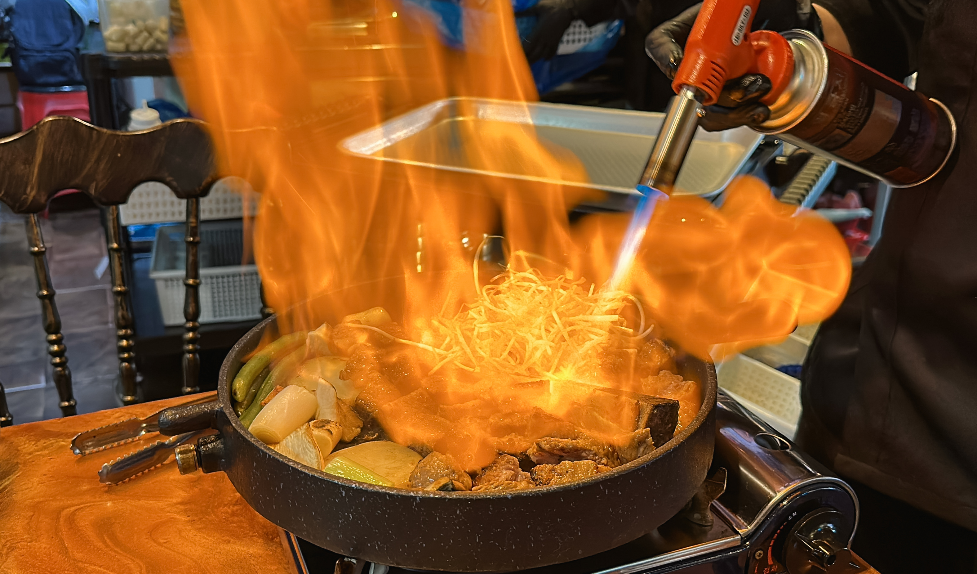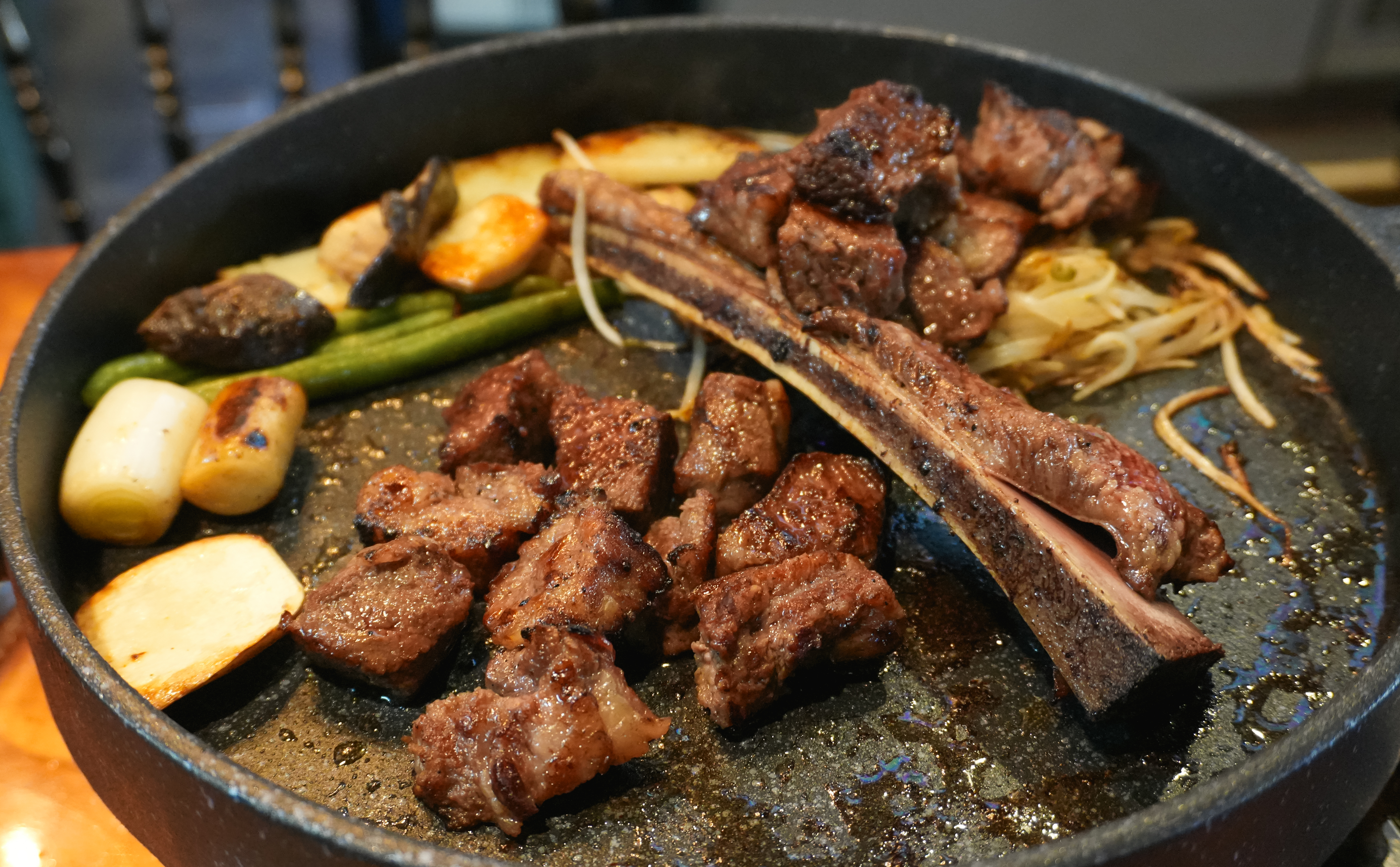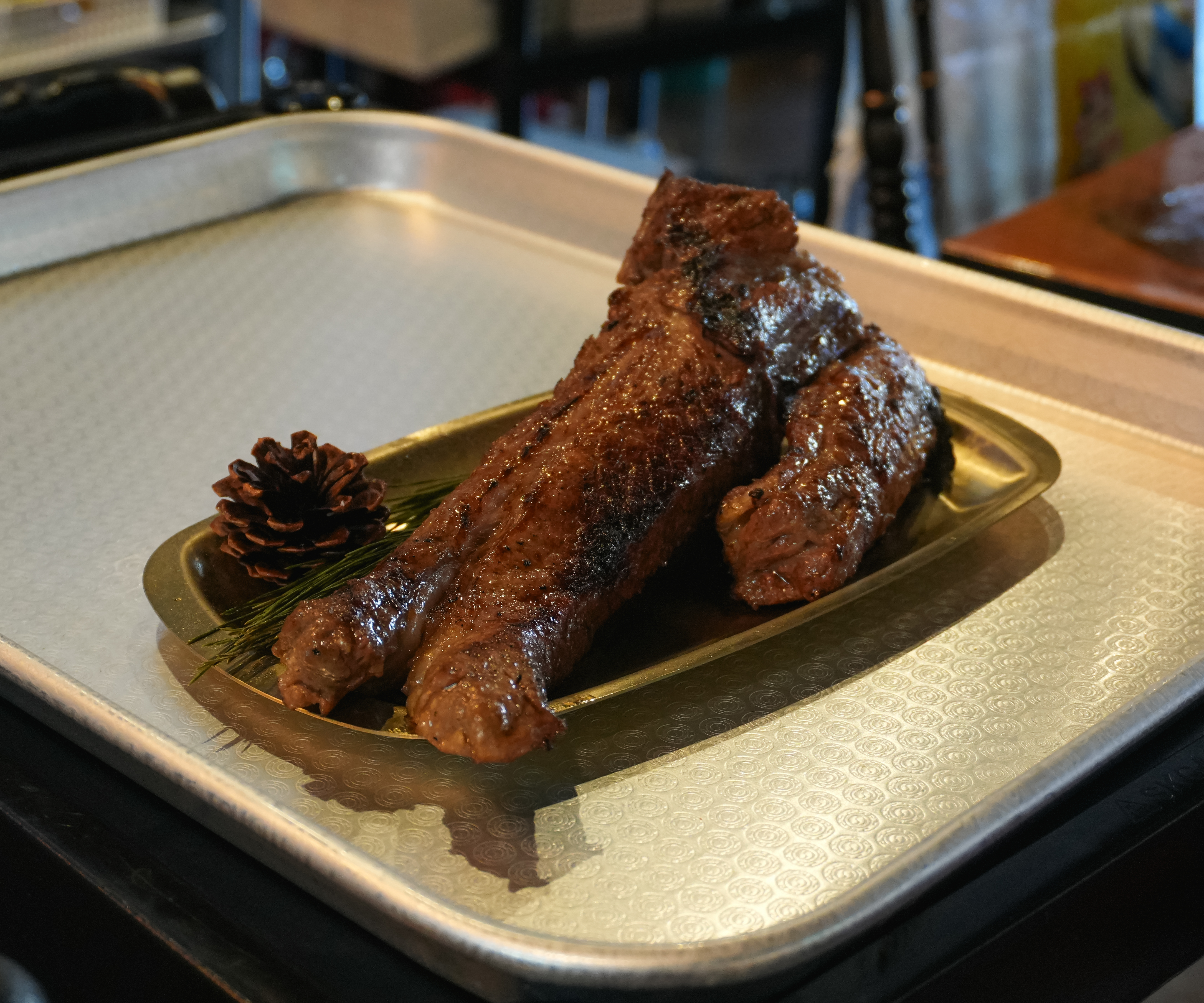 곧이어 우대갈비가 나왔습니다. 솔탄갈비라는 이름답게 솔방울과 솔잎이 함께 제공되었고, 우대갈비라는 메뉴는 처음 접해보는데, 큼직한 고기가 붙어있는 소갈비였습니다. 토치를 이용해 구워주고 있었는데, 고기가 잡내 없이 부드럽고 맛있었습니다.