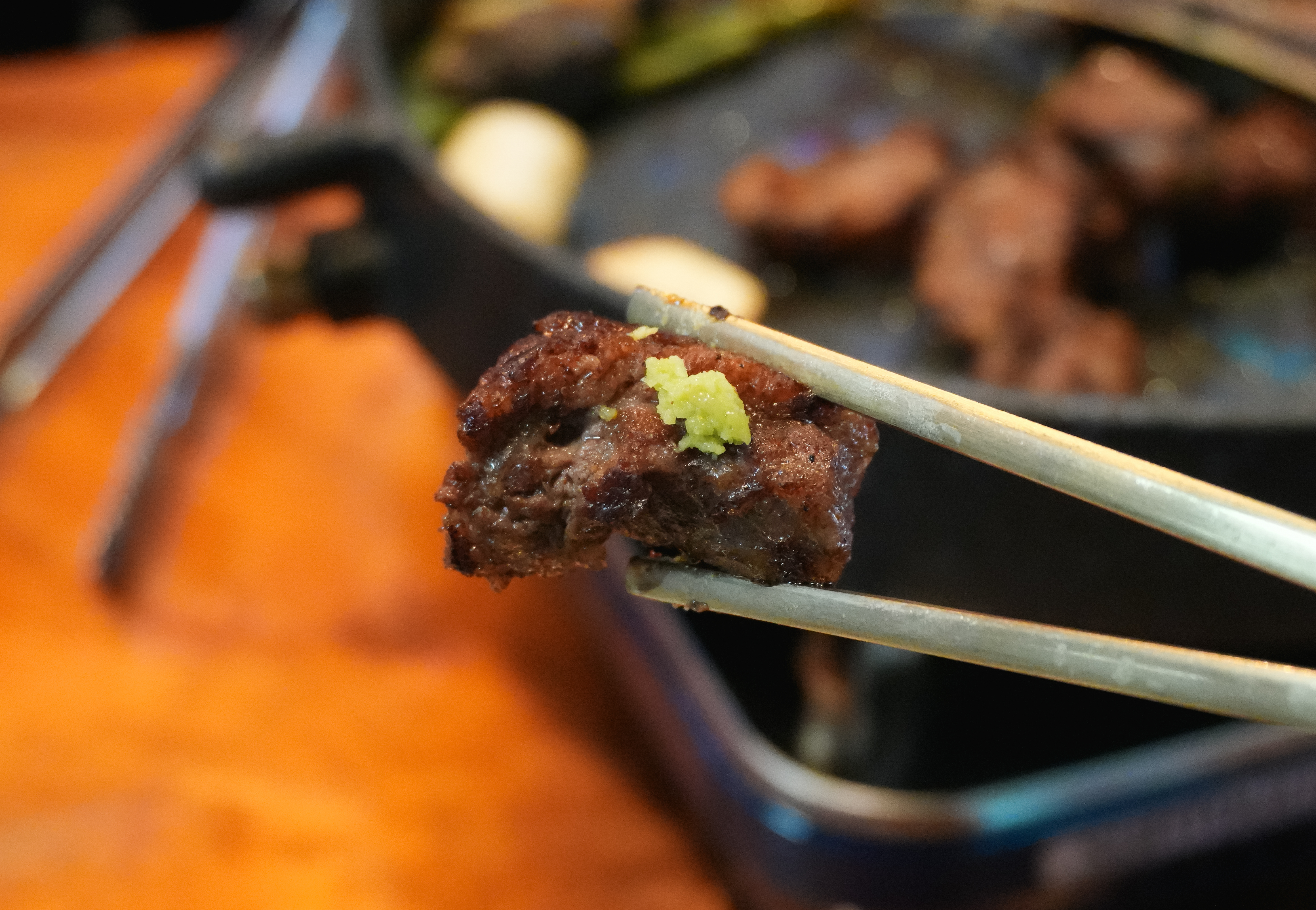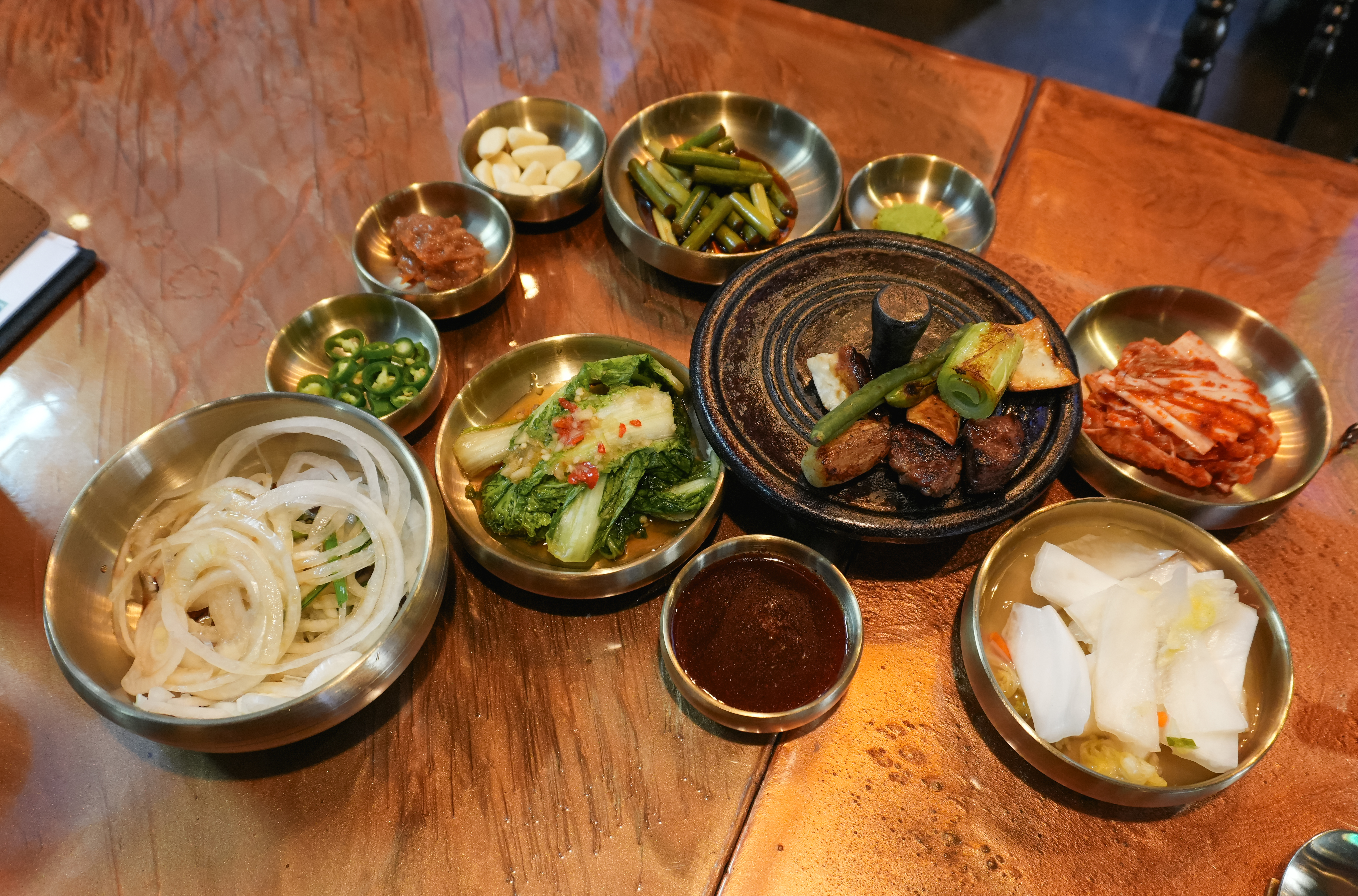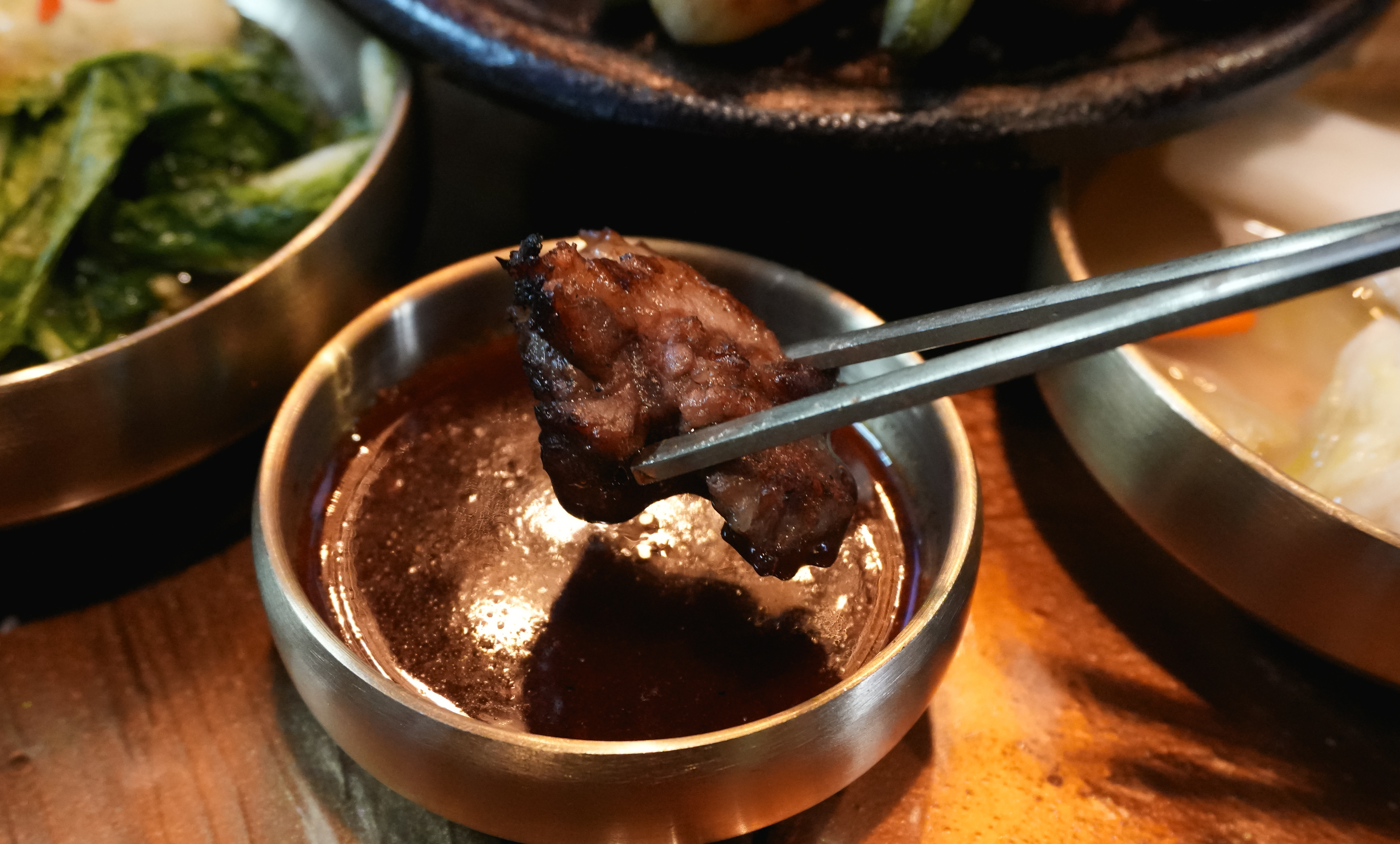 솔탄갈비의 우대갈비에는 양파장아찌, 백김치, 배추김치 그리고 고기에 곁들일 양념류가 같이 제공되었습니다. 고기는 기본으로 먹어도 맛있었지만, 와사비나 소금, 같이 제공되는 소스와 먹어도 좋았습니다.